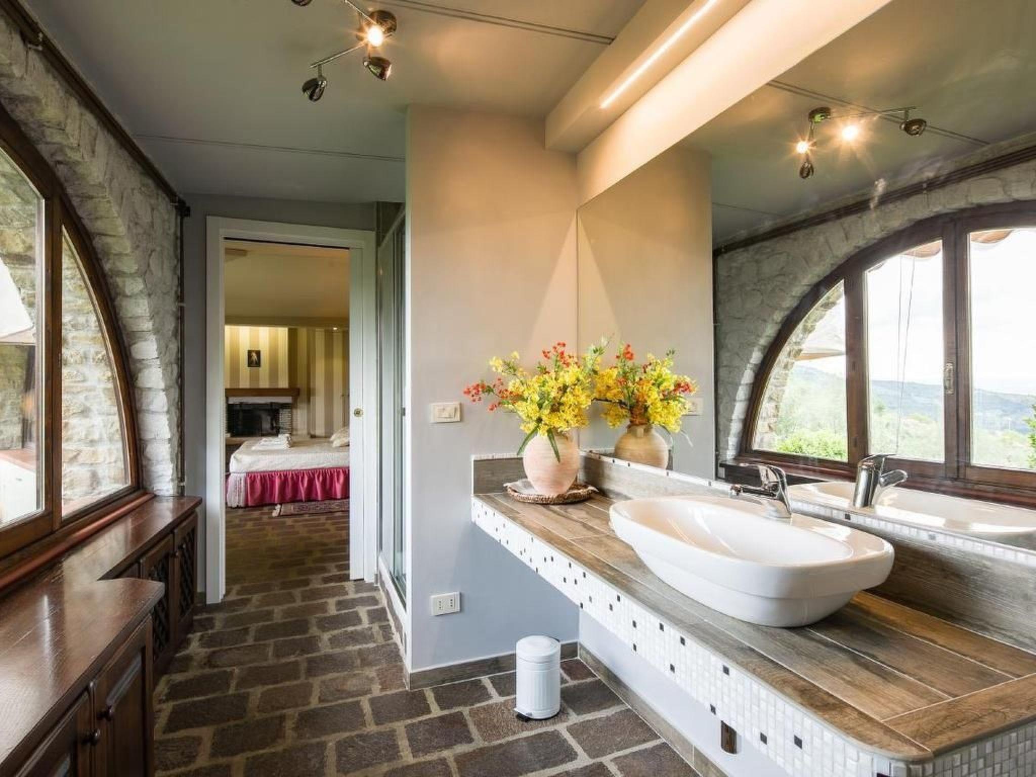 Villa La Foce is situated on a charming hillside, just a few kilometres from Castiglion Fiorentino and Cortona. This beautiful independent villa enjoys a breathtaking panoramic view on the surrounding countryside and villages. An excellent choice for those seeking privacy and peace. The Villa, built on two floors, is elegantly furnished with modern furniture and equipped with all comforts. The ground floor hosts a sitting room with TV and hi-fi, a bathroom, an elegant dining room with fireplace and a fully equipped kitchen. The first floor is made up of a double room and a twin bedroom which share a bathroom with tub. A study leads to a characteristic double bedroom with bathroom. The 4th bedroom (with ensuite shower room) is located just few steps from the main house and it is originated from the recovery of a spacious annex with independent access.The heart of the house is the garden which is beautifully manicured. The swimming pool, which enjoys a charming position, dominates the valley. You will have the chance of refreshing and relaxing yourself while enjoying a stunning view. Showers and towels are at guests' disposal. The garden also hosts a beautiful relaxing area around the swimming pool and a cooking area fully equipped to prepare a delicious barbecue or a tasty pizza in the wood burning oven. A covered area of the garden has been specifically designed for outdoor dinners on hot Summer nights. A big parking area with a covered garage and a laundrette is also available. Moreover, the property has a central heating system, safe, satellite TV, hydromassage bathtub and shower. Staying at Villa La Foce will be an unforgettable experience immersed in peace and privacy, enjoying a stunning view and relaxing in an exclusive and totally private property.Short description 1Number of kitchens : 1SurroundingNearby sports facilities : MountainbikingGarden and outdoorGarden facilities : Garden furniture provided, GrillOn-site leisure facilities : Outdoor swimming pool exclusive use, Swimming pool