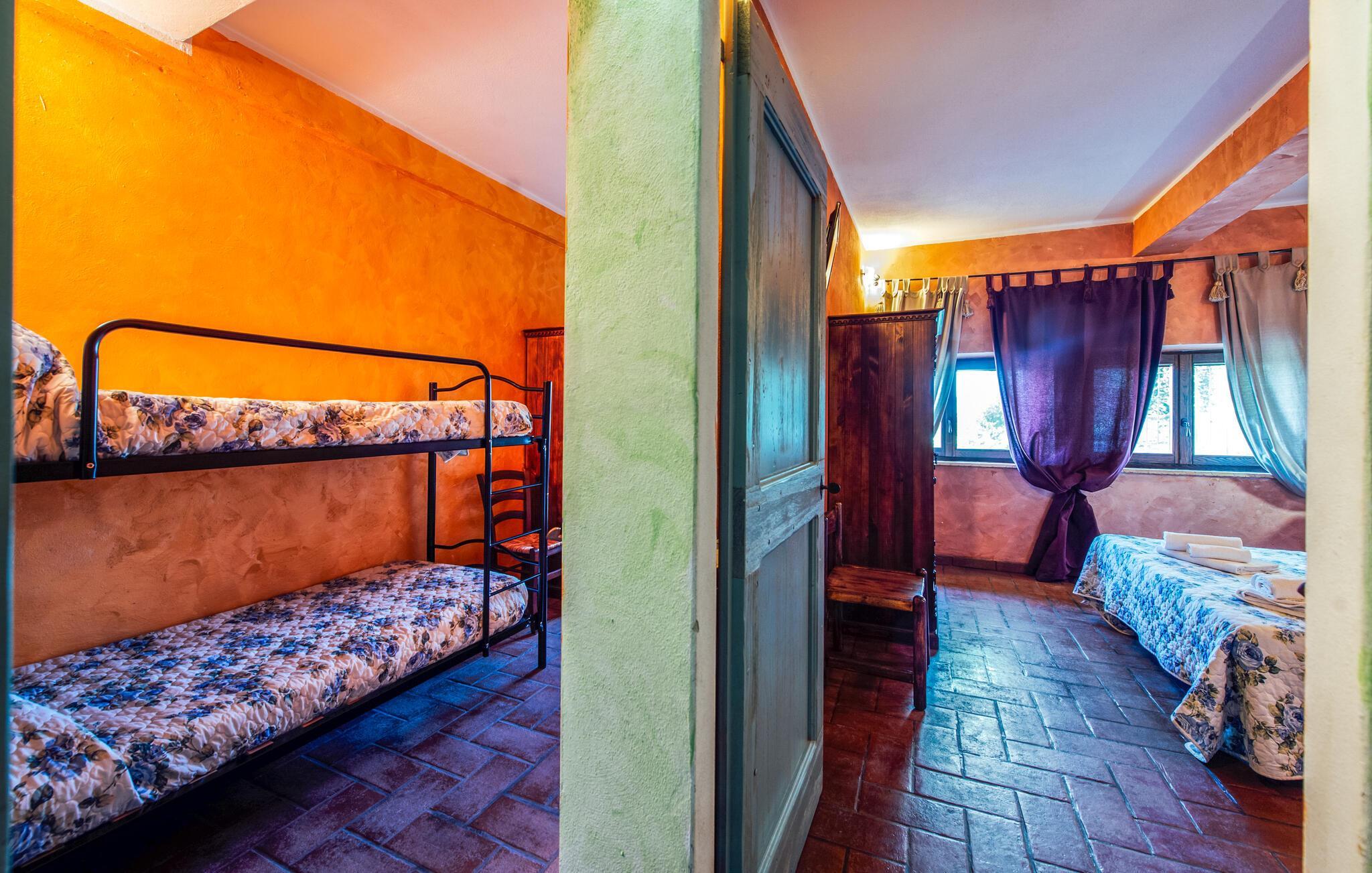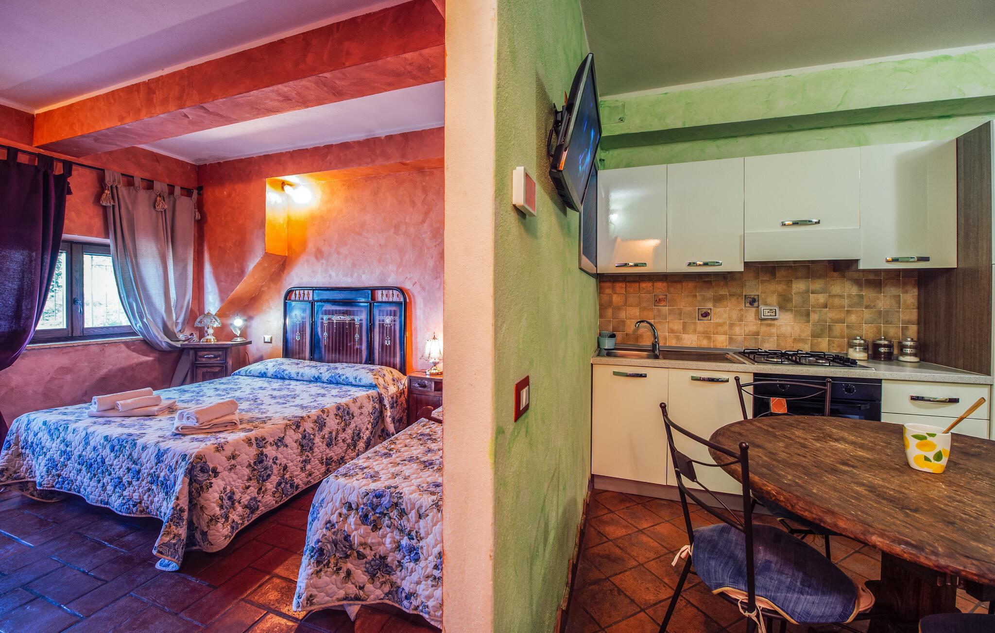 Velkommen til denne dejlige lejlighed, der ligger i rolige omgivelser, og hvor I får en herlig base for årets ferie. Indretningen fremtræder pænt og rustikt med synligt bindingsværk og stenvægge, der sammen med de stærke farver og praktiske møbler gør det nemt at slappe af med det samme, I ankommer. Lejligheden er udstyret med alt, I behøver for at kunne slappe af før og efter dagens udflugter, og afhængig af ledighed kan I booke andre lejligheder på grunden, som I deler spabad og sauna med.