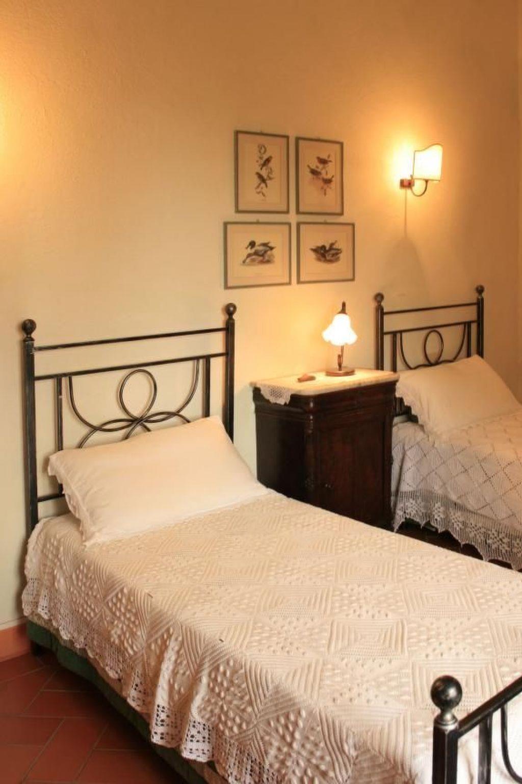 Casa Letizia (about 80 m.) is on a high floor and has two rooms: one with a double bed and another with two separate beds. The kitchen is furnished in 'old Tuscan' style so you can cook and eat at a small table. You can also dine on the larger table in the living room, where there are also sofas and a nice fireplace. Very pleasant and panoramic is the open loggia above the entrance staircase where you can have your meal or simply sit and drink wine with a full view of the beautiful landscape. At the back of the flat is a terrace, partly covered, partly connected to the garden on the same floor. A good solution for being outdoors even in less than excellent weather conditions.