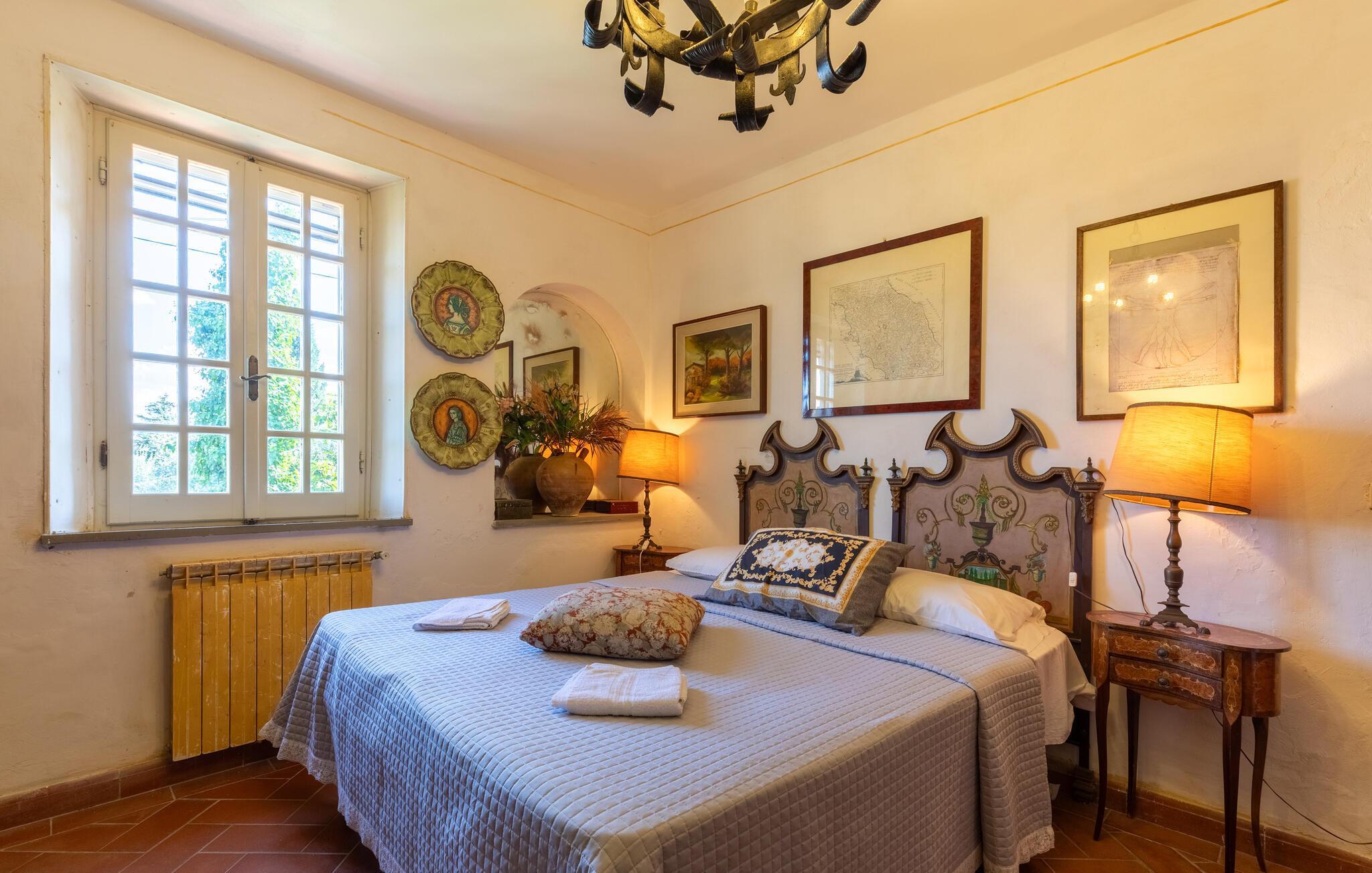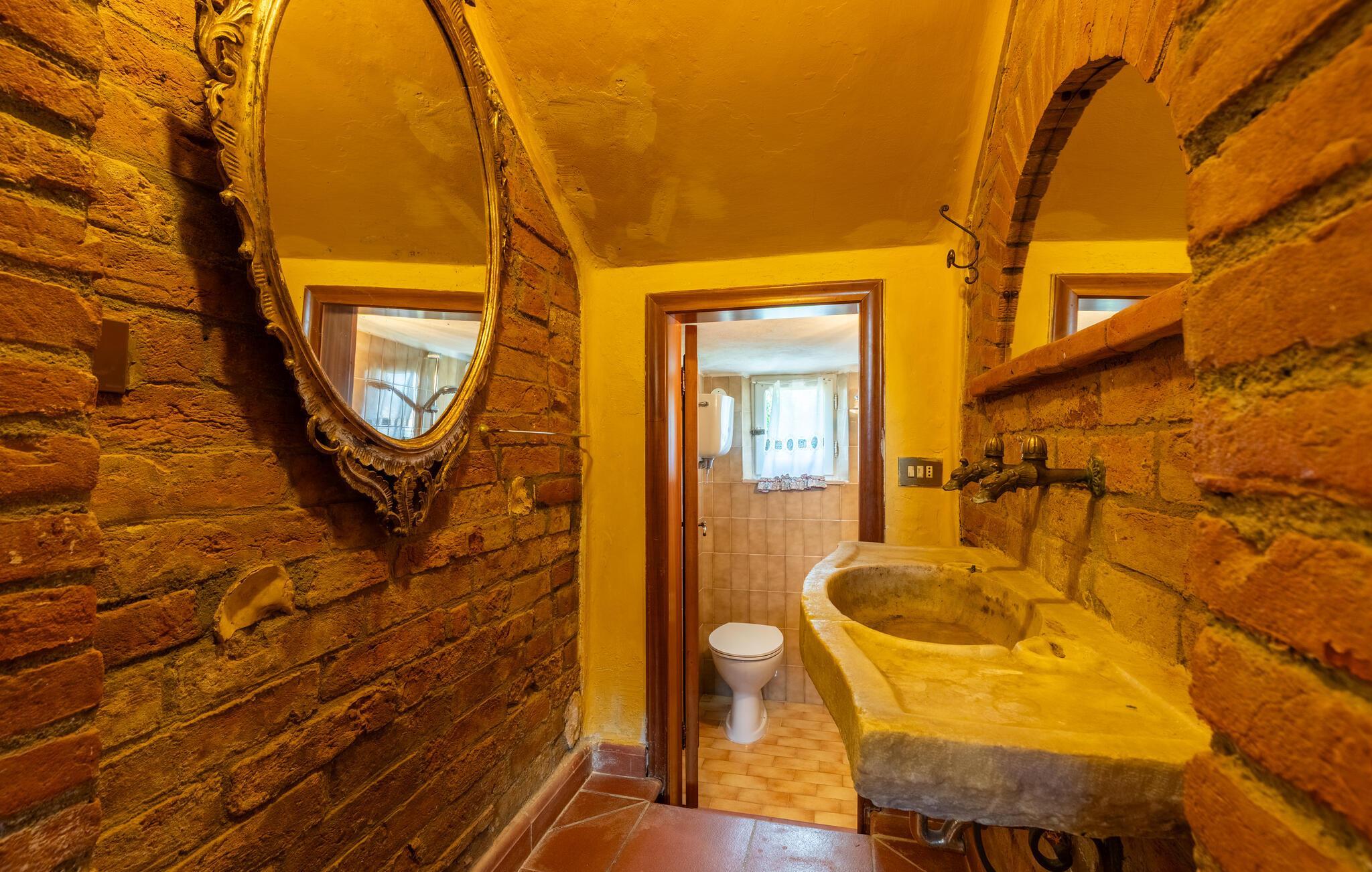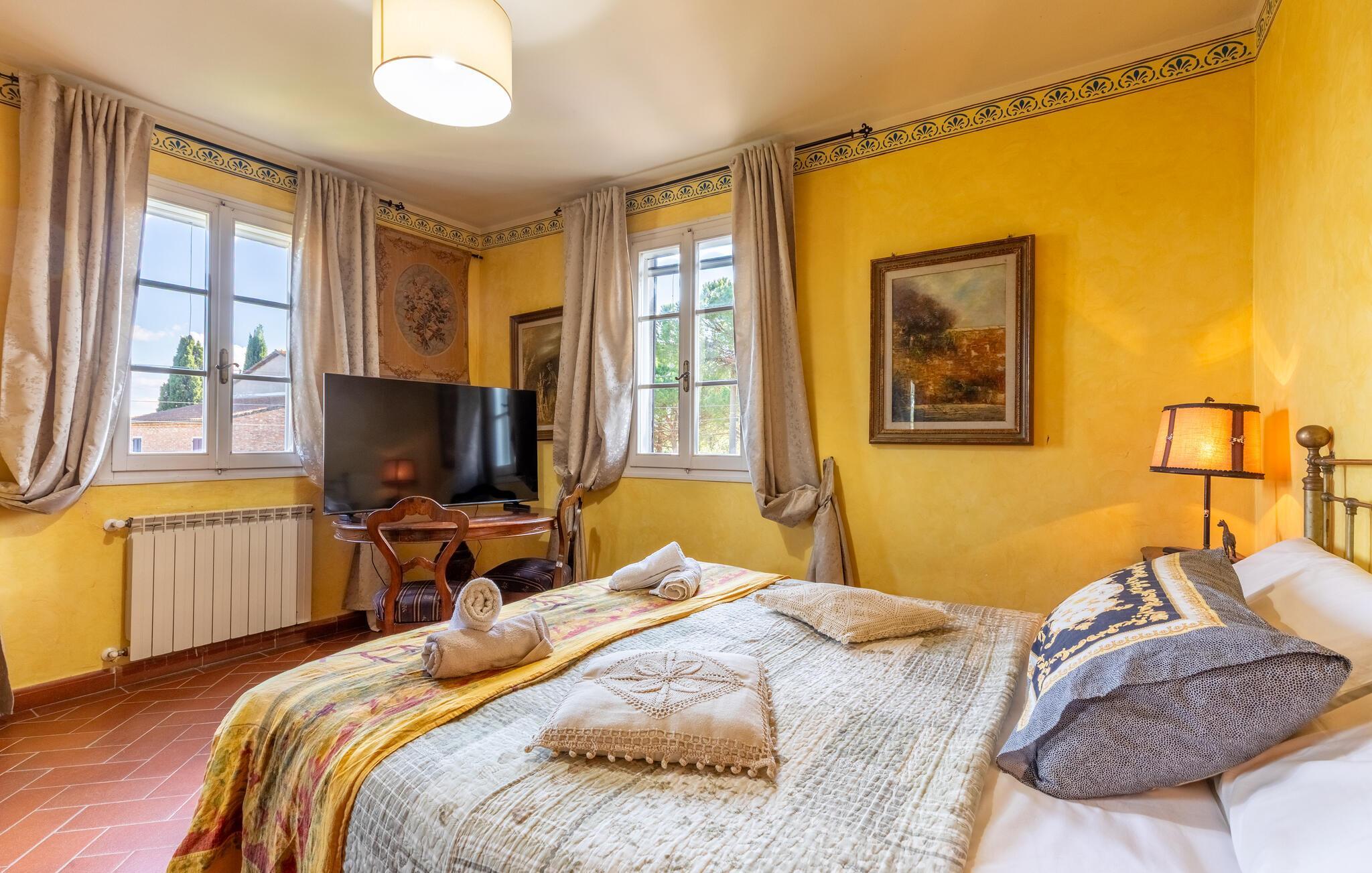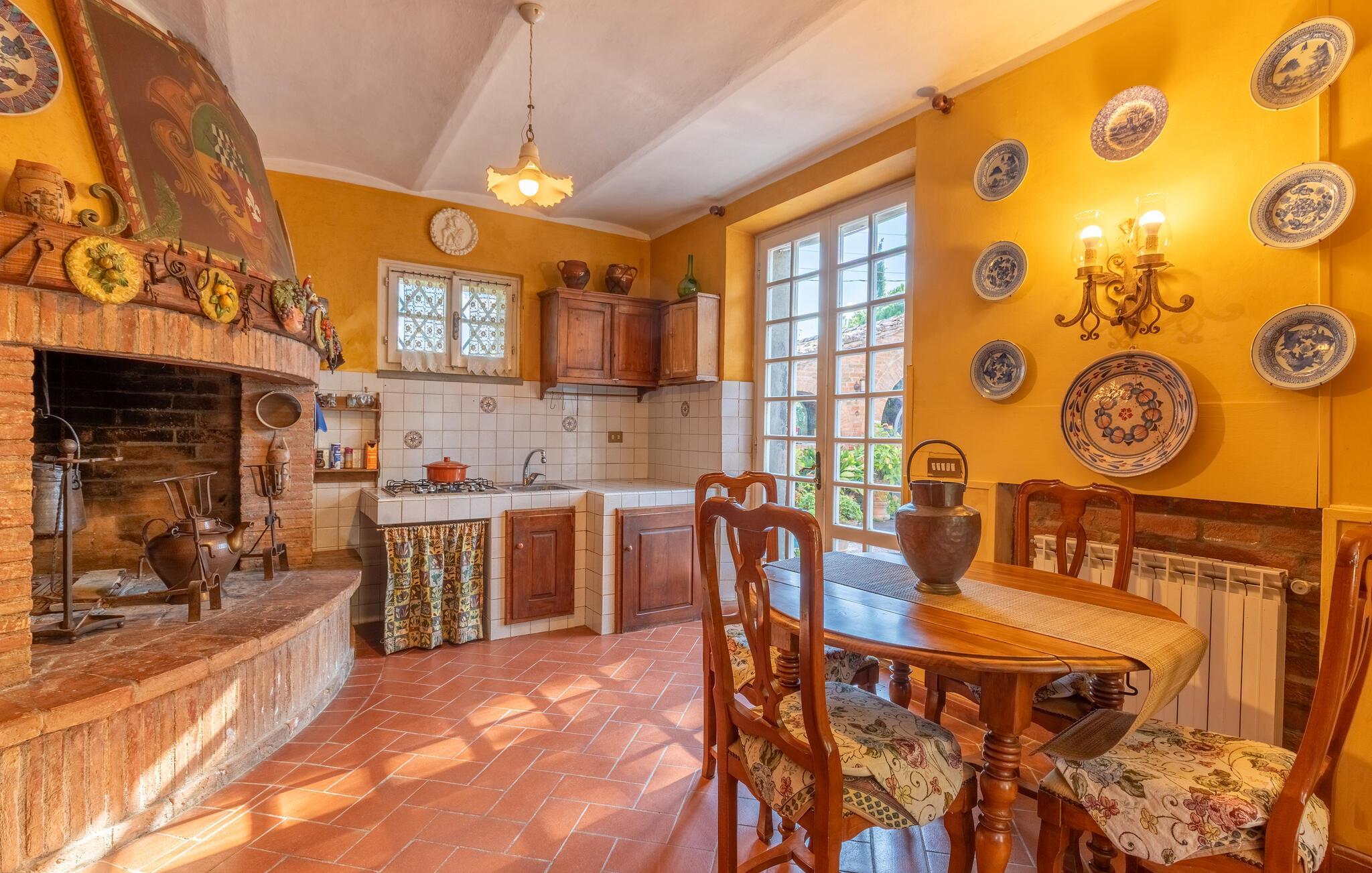 Dette feriehus med swimmingpool ligger ca. 8 km fra Castiglione del Lago, på en skråning ved søen Trasimeno og de toskanske byer Chiusi og Montepulciano. Med udsigt over dyrkede marker og smukke bakker kan I slappe af i en stor saltvandspool, der er udstyret med liggestole. I nærheden af ?poolen er der et badeværelse med bruser. Der er to pavilloner i haven til udendørs spisning samt en græsplæne. Tilstødende bygning med køkken og pejs. I stueetagen af ??huset er der et værelse med tekøkken og franske vinduer med udsigt over haven. På første sal er der tre dobbeltværelser samt et soveværelse med to senge. På anden sal er der et værelse med to senge med massage badekar og bruser. Ca. 20 km væk ligger vestbreden af ??søen Trasimeno. På lidt over to timer kan I køre til Toscanas kyst i provinsen Grosseto. Udflugter: Castiglione del Lago med færger til Isola Maggiore og Isola Polvese 8 km; Chiusi 10 km, Montepulciano 20 km, Perugia 50 km, Arezzo 70 km, Todi 70 km, Firenze 130 km, Rom 150 km.