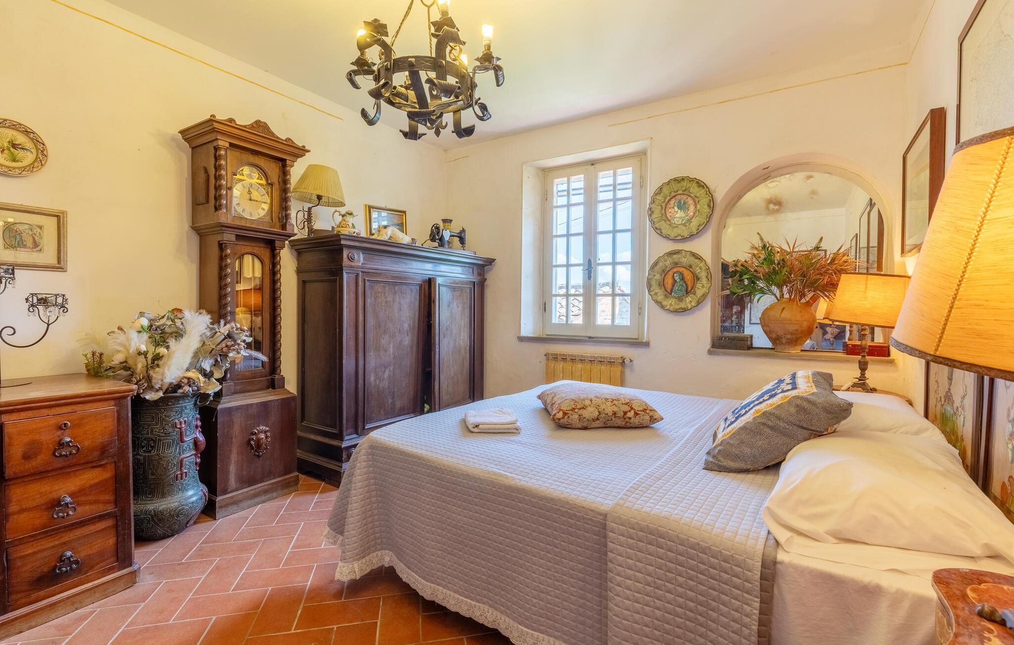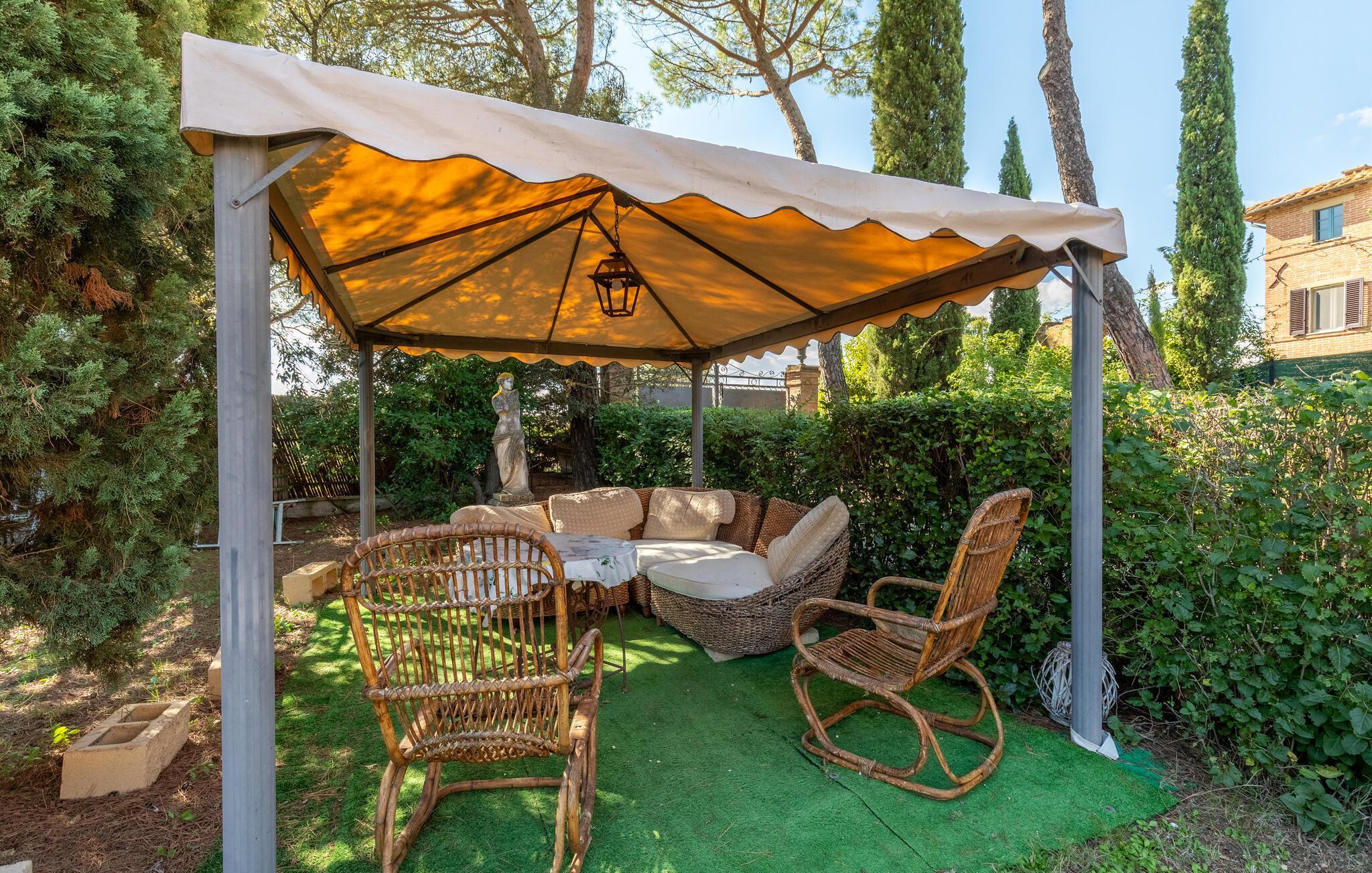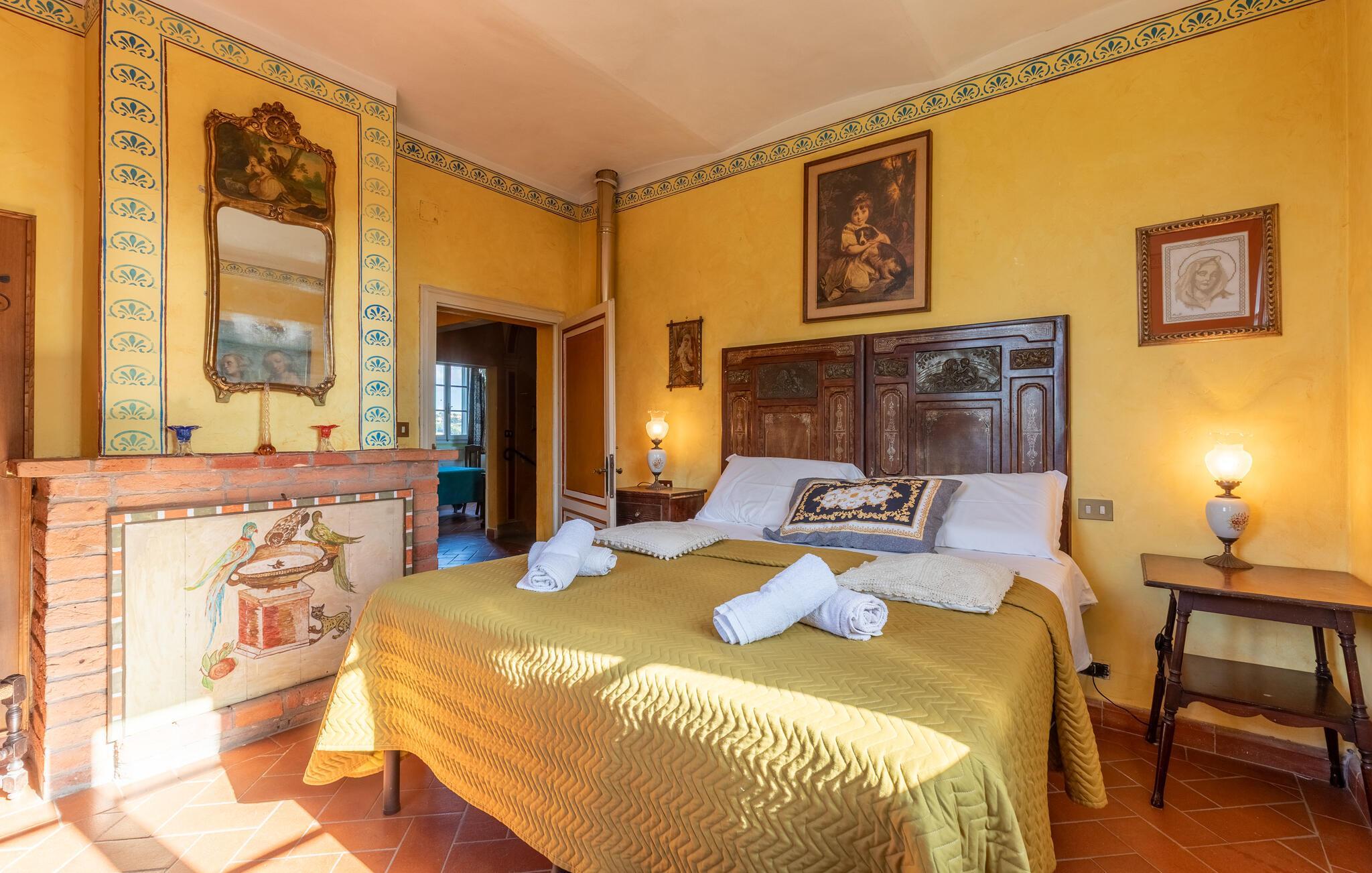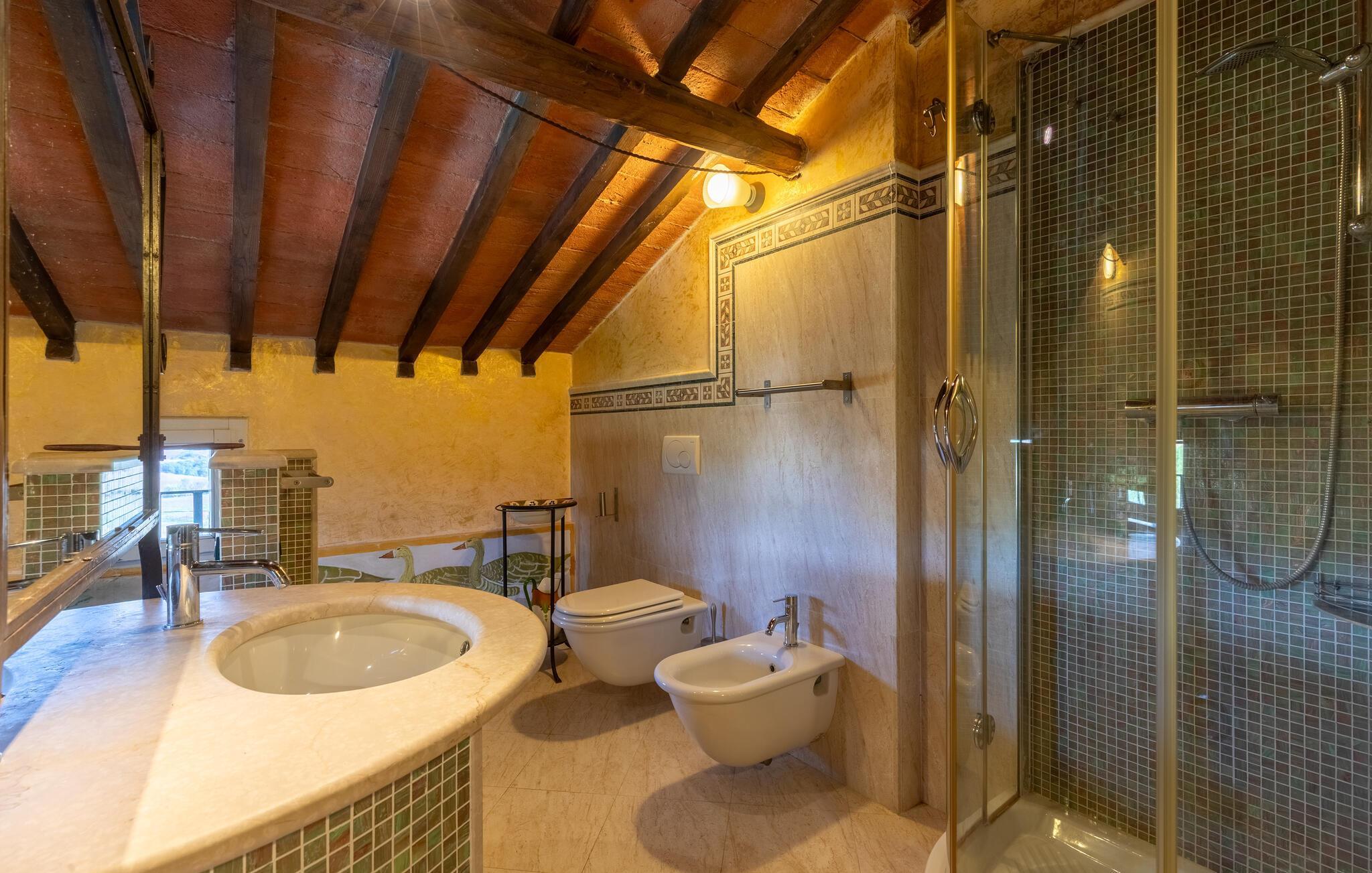 Dette feriehus med swimmingpool ligger ca. 8 km fra Castiglione del Lago, på en skråning ved søen Trasimeno og de toskanske byer Chiusi og Montepulciano. Med udsigt over dyrkede marker og smukke bakker kan I slappe af i en stor saltvandspool, der er udstyret med liggestole. I nærheden af ?poolen er der et badeværelse med bruser. Der er to pavilloner i haven til udendørs spisning samt en græsplæne. Tilstødende bygning med køkken og pejs. I stueetagen af ??huset er der et værelse med tekøkken og franske vinduer med udsigt over haven. På første sal er der tre dobbeltværelser samt et soveværelse med to senge. På anden sal er der et værelse med to senge med massage badekar og bruser. Ca. 20 km væk ligger vestbreden af ??søen Trasimeno. På lidt over to timer kan I køre til Toscanas kyst i provinsen Grosseto. Udflugter: Castiglione del Lago med færger til Isola Maggiore og Isola Polvese 8 km; Chiusi 10 km, Montepulciano 20 km, Perugia 50 km, Arezzo 70 km, Todi 70 km, Firenze 130 km, Rom 150 km.