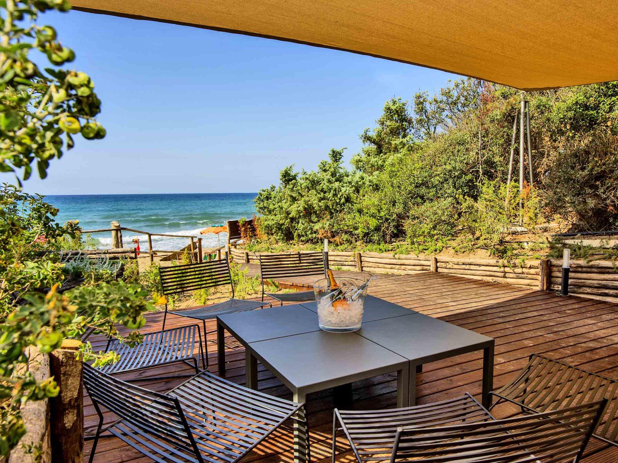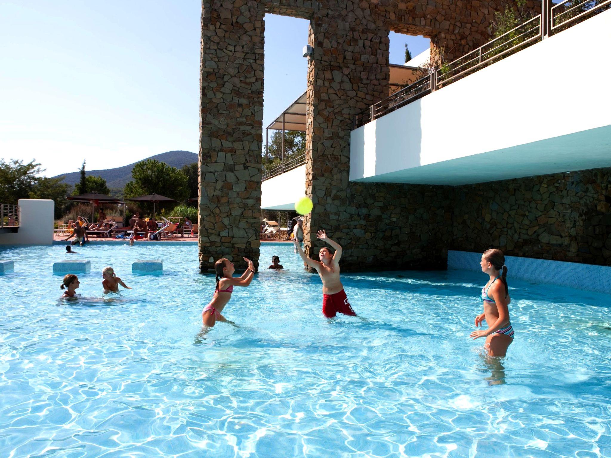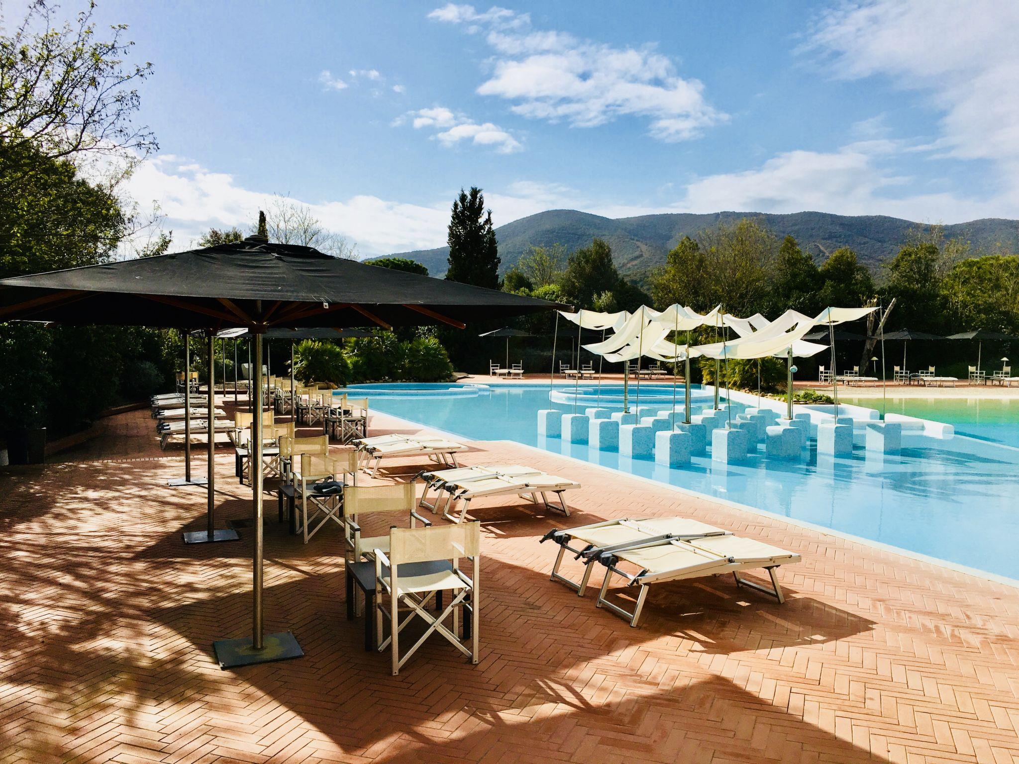 This holiday village is a perfect example of a well-guarded sea oasis spreads over an area of natural beauty. The guests can enjoy the private setting of the magnificent complex near the sea with a discreet and professional service. As a guest you have full access to the village private swimming pool (2000 sqm) with three hydro-massage. There are two children's areas, all surrounded by sun loungers (extra charge) and beach umbrellas. Padel tennis court, table tennis tables, outdoor gym, guided MTB tours. Modern, comfortable resort. In the hamlet Rocchette 7 km from the centre of Castiglione della Pescaia, 12 km from the centre of Punta Ala, in a sunny position, 600 m from the sea, road to cross. For shared use: park 70'000 m2 (fenced), natural garden, 3 swimming pools secured (seasonal availability: 17.Apr. - 19.Oct.). WC in the pool area, children's pool, outdoor shower, hot tub, table tennis, patio. In the complex: reception, restaurant, bar, WiFi, steam room, hot tub, shopping facilities (extra) bicycle rental. Full board half board possible on request (extra). Parking on the premises. Supermarket 6 km, sandy beach "Rocchette (extra, on request)" 600 m. Sailing school 10 km, riding stable 7 km. Nearby attractions: Umbrella and sundecks (on request,extra) 600 m. Please note: entertainment in the season. The complex has night security. Residence with electric gates. Mini-Club from 23/05 to 06/09, Entertainment activities from 23/05 to 06/09. Beach shuttle (June-September). Club card included in the price. Bike path Castiglione-Grosseto.