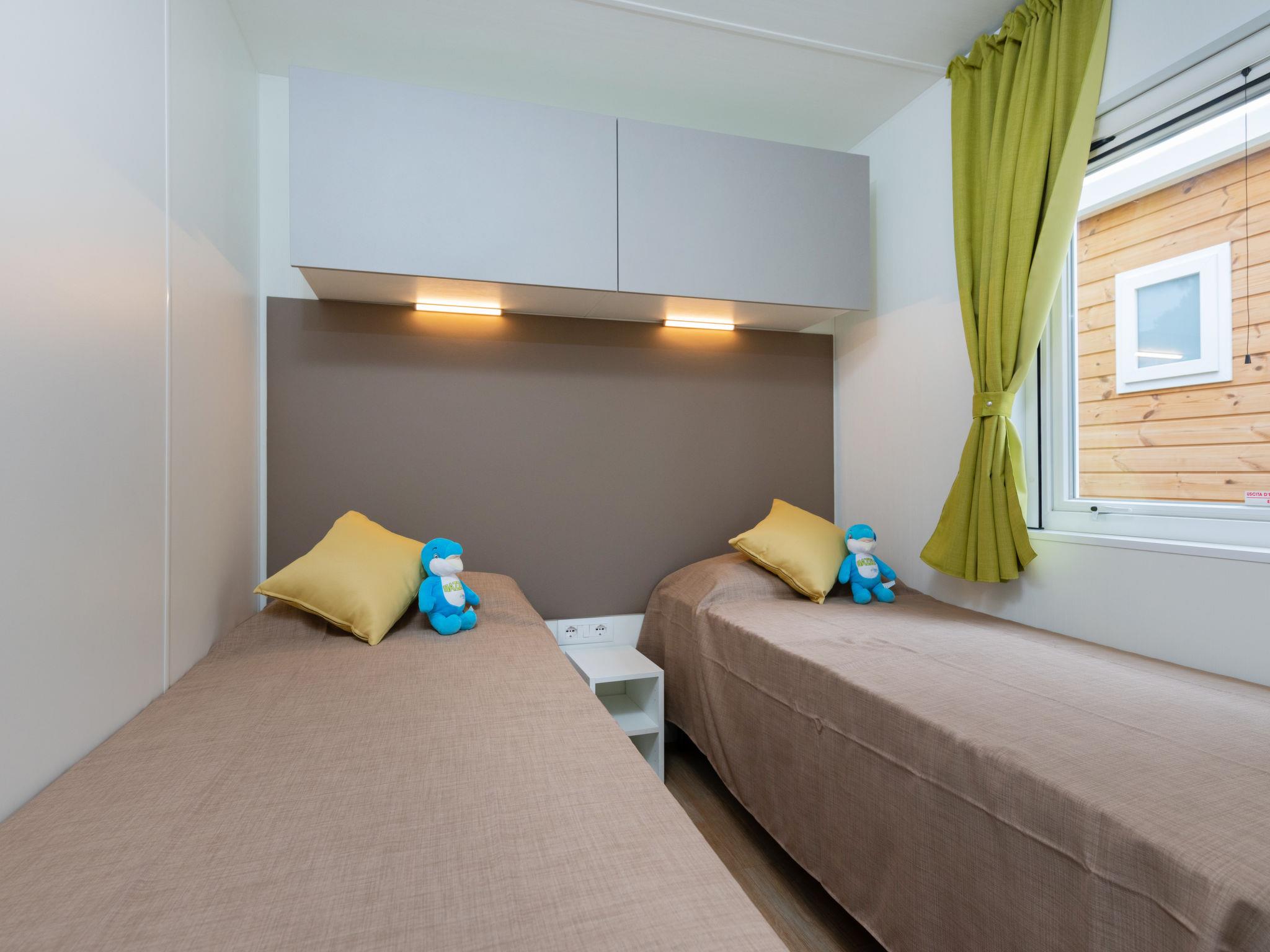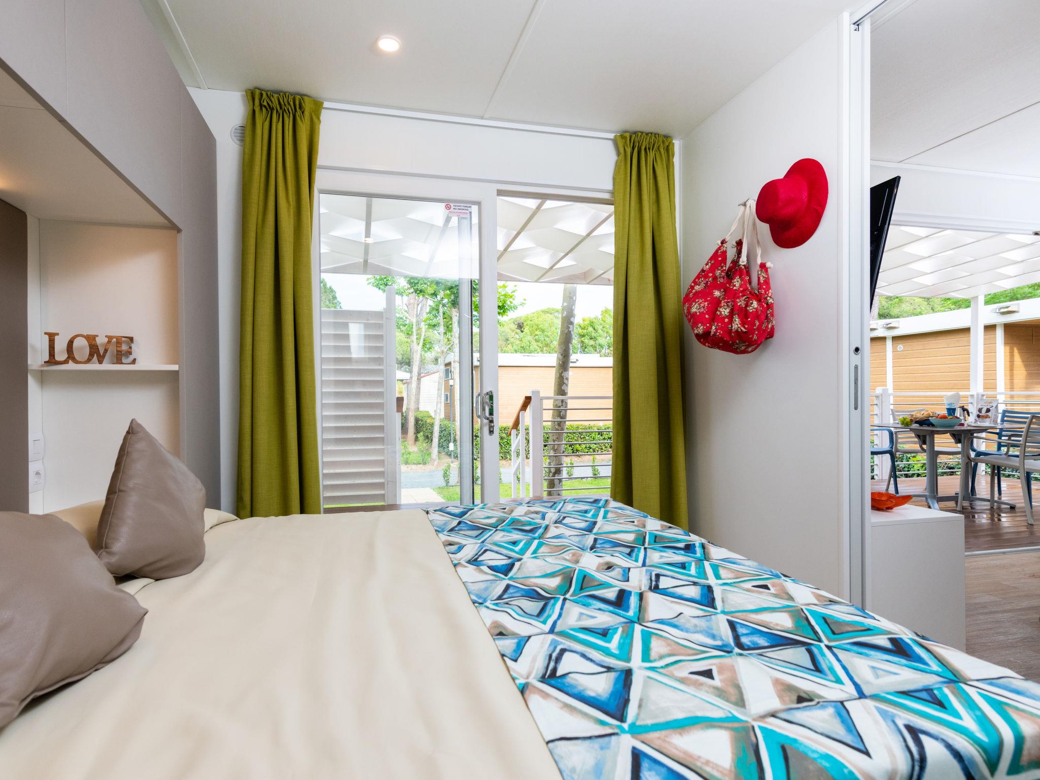 "Fashion", 3-room mobile home 38 m2, on the ground floor. Comfortable and modern furnishings: living/dining room with kitchen corner and TV. Exit to the garden, to the veranda. 1 double bedroom with shower/bidet/WC. 1 room with 2 beds. Shower/WC. Air-conditioning. Terrace, garden. Terrace furniture. Facilities: safe, mosquito net, hair dryer. Internet (WiFi, free). E-charging station. Please note: private entrance. IT053006B1ZWQW8ZUA