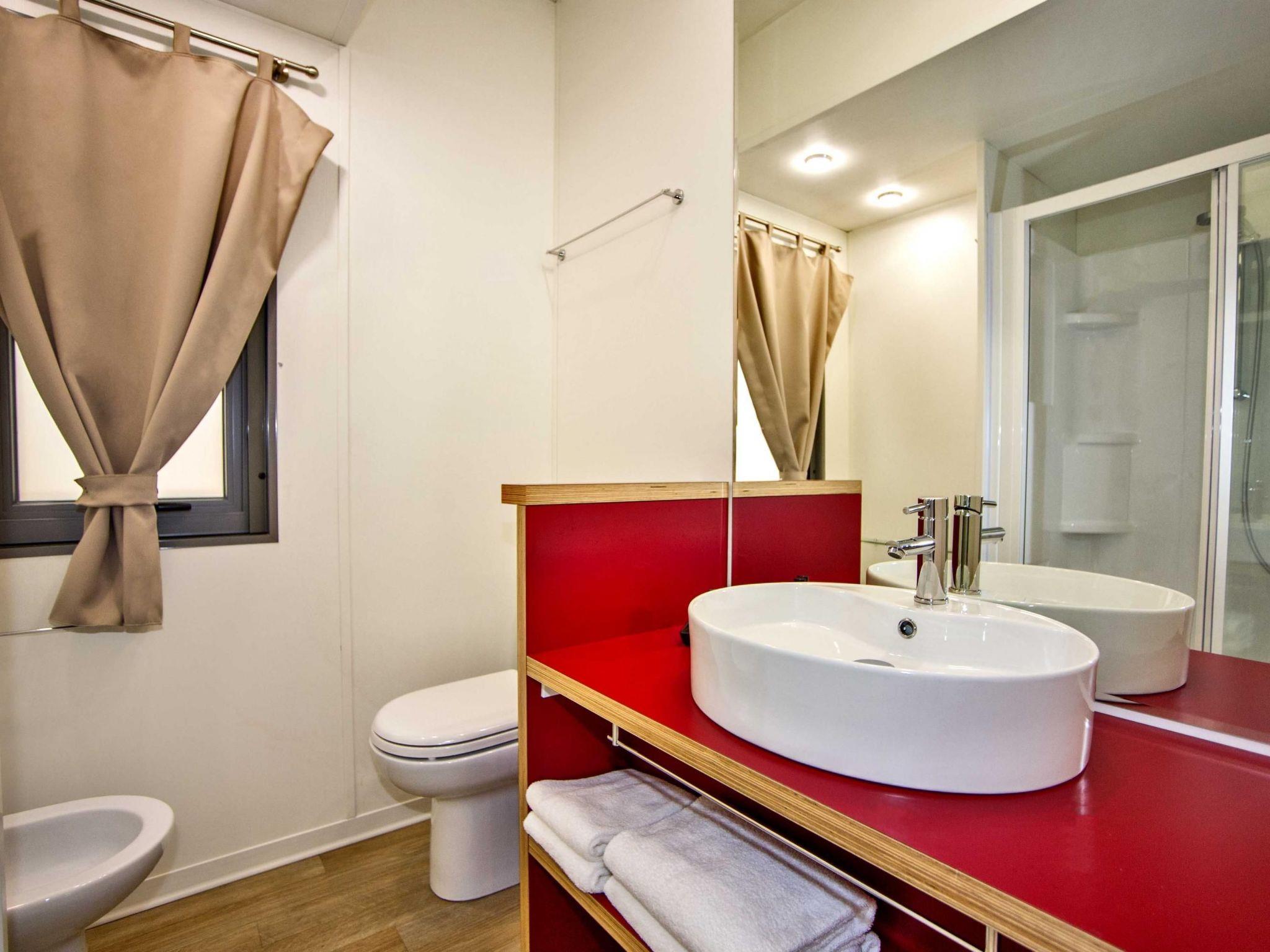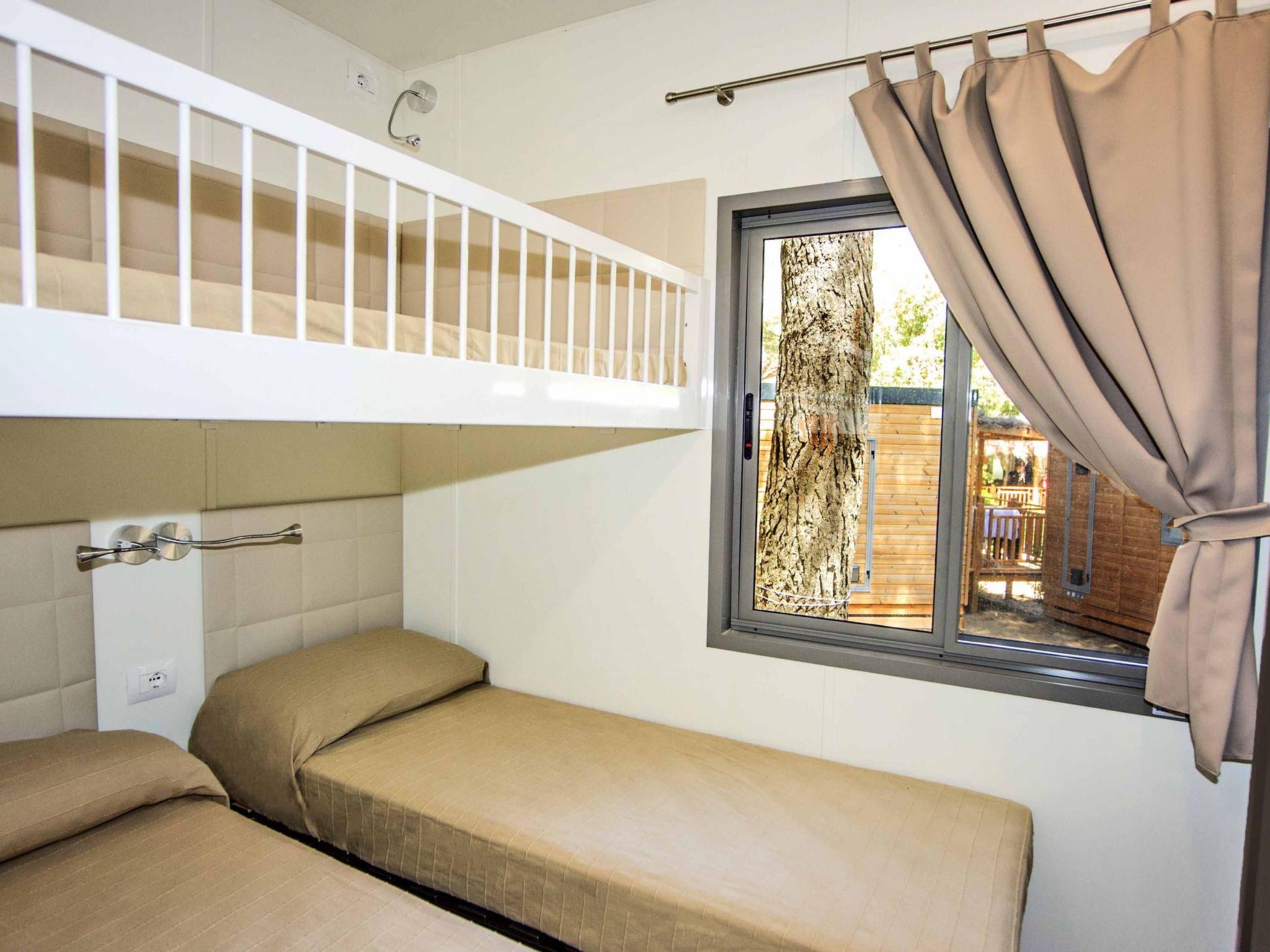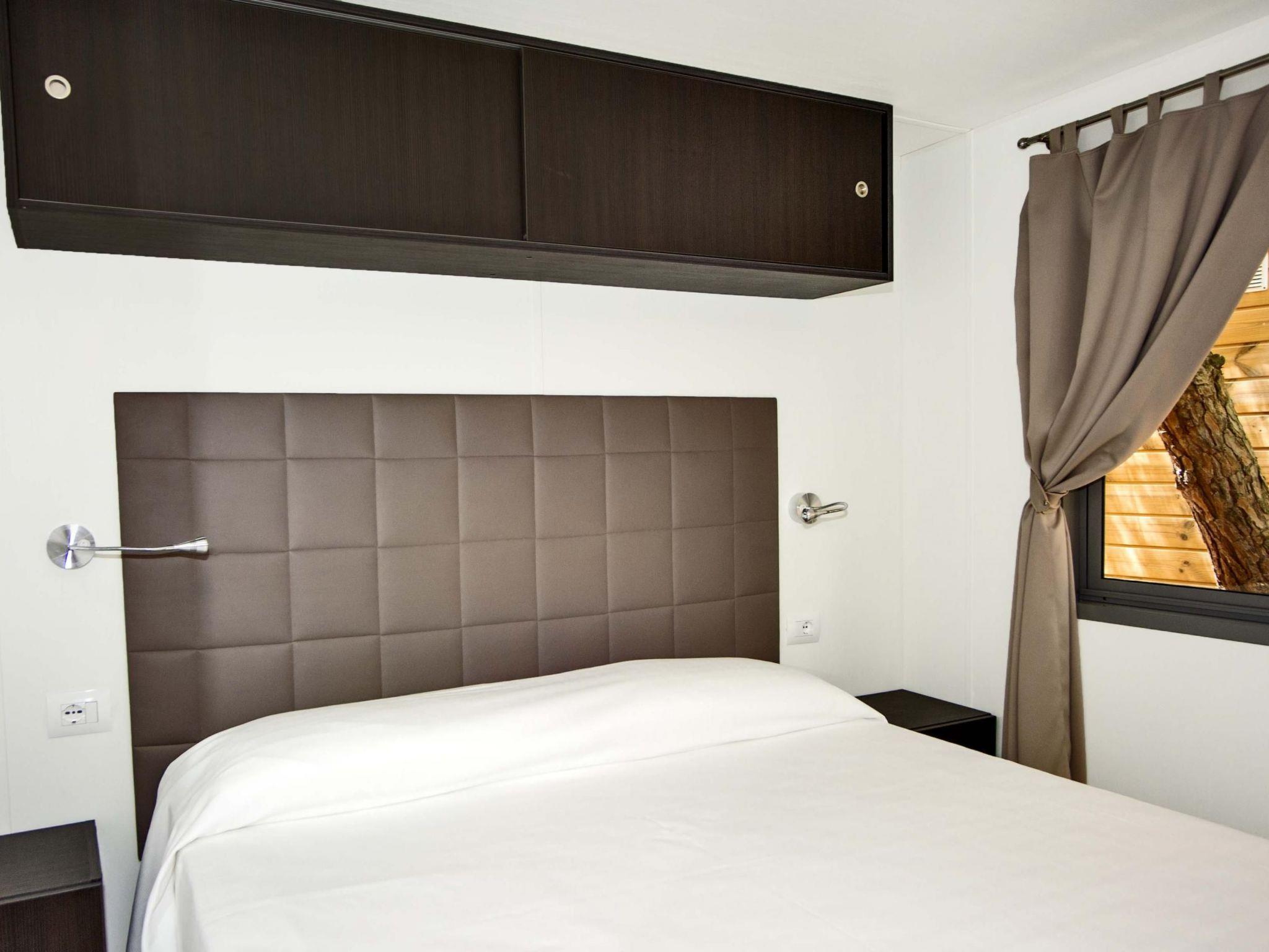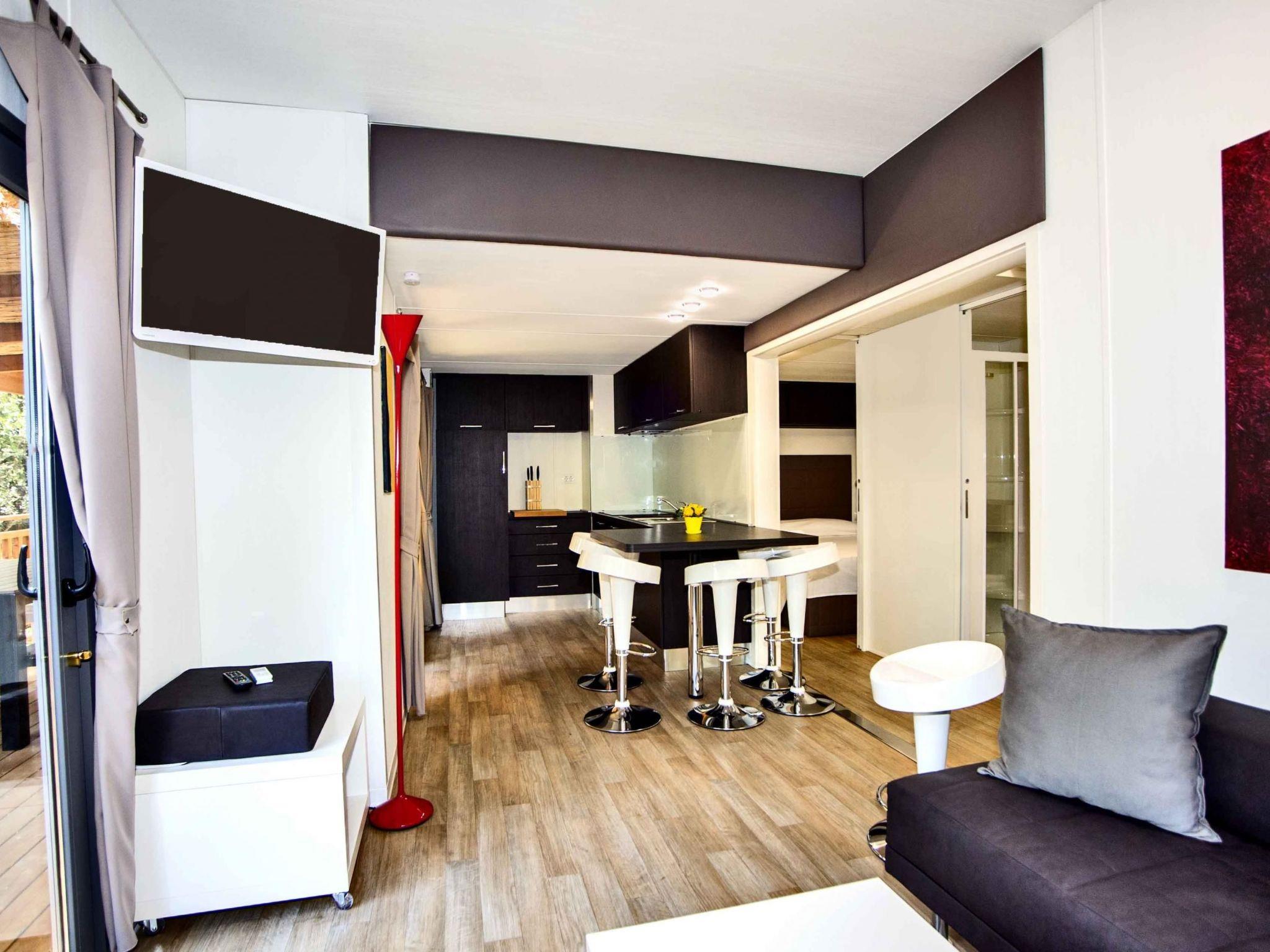 Spacious mobile home with a large bedroom with a double bed, a bedroom with two single beds, a bathroom with a WC, shower, washbasin and bidet, and a spacious living room-kitchen, a sofa bed, TV and air conditioning.