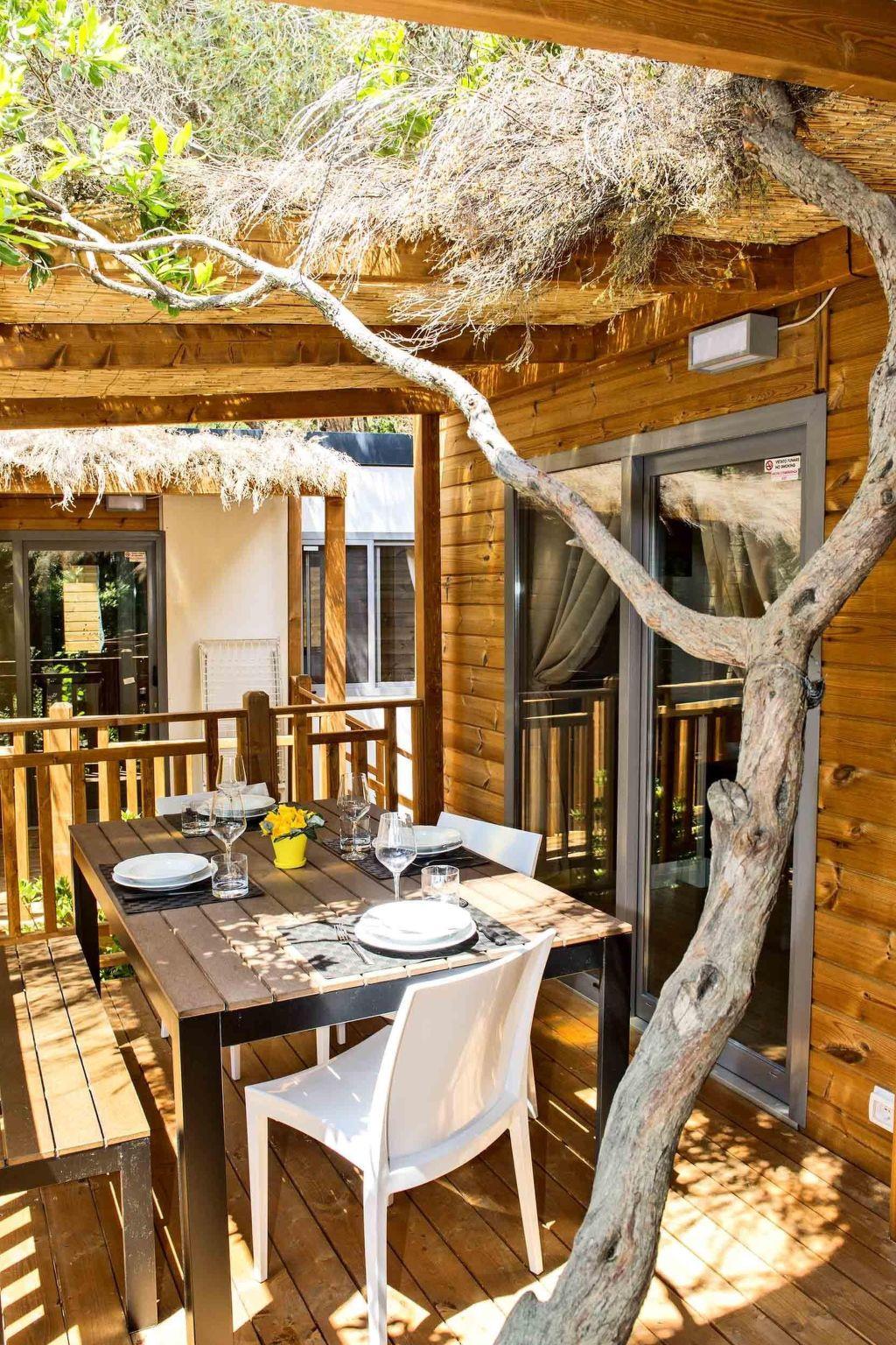 Outside there is a veranda with a table and chairs.