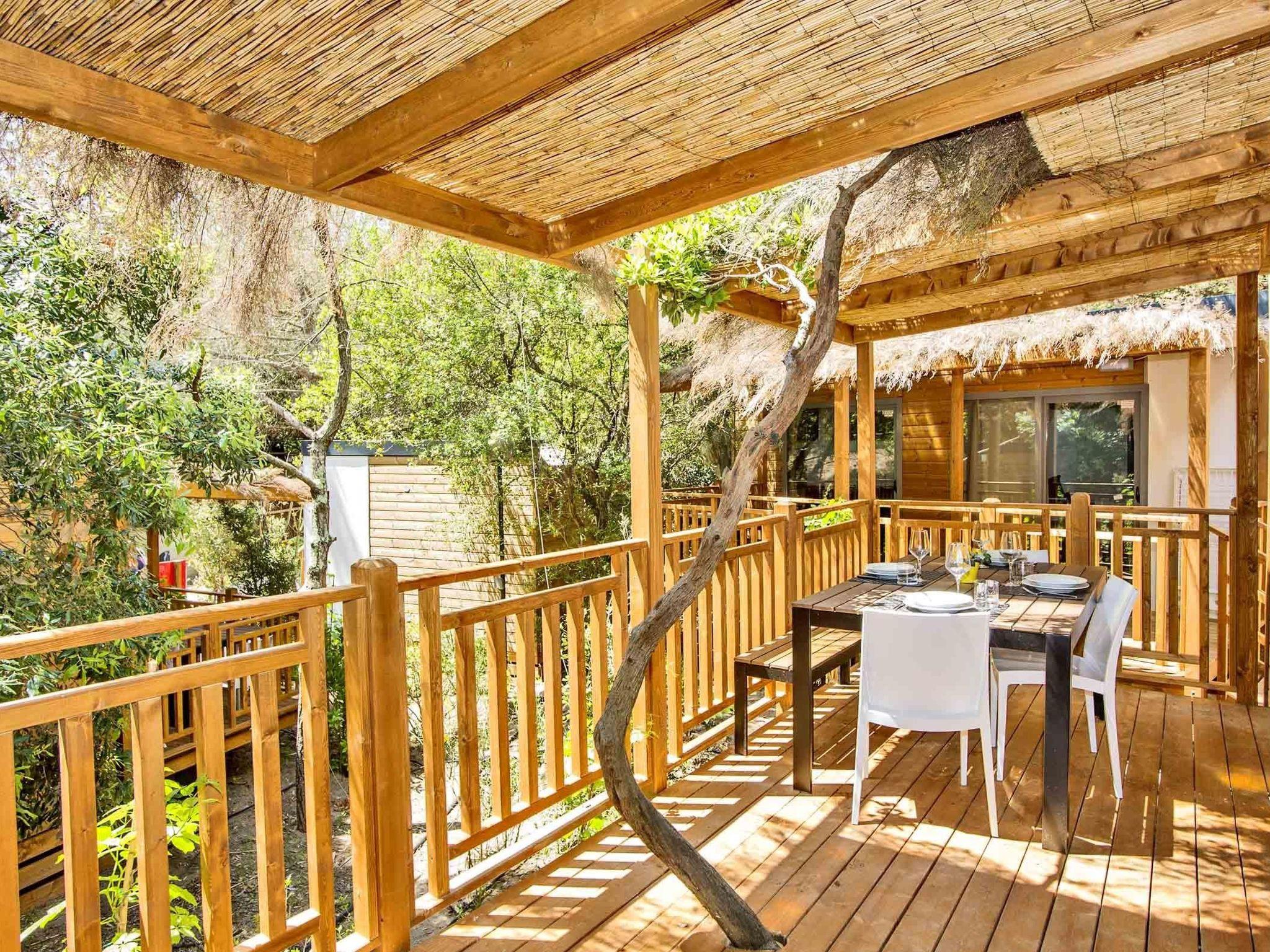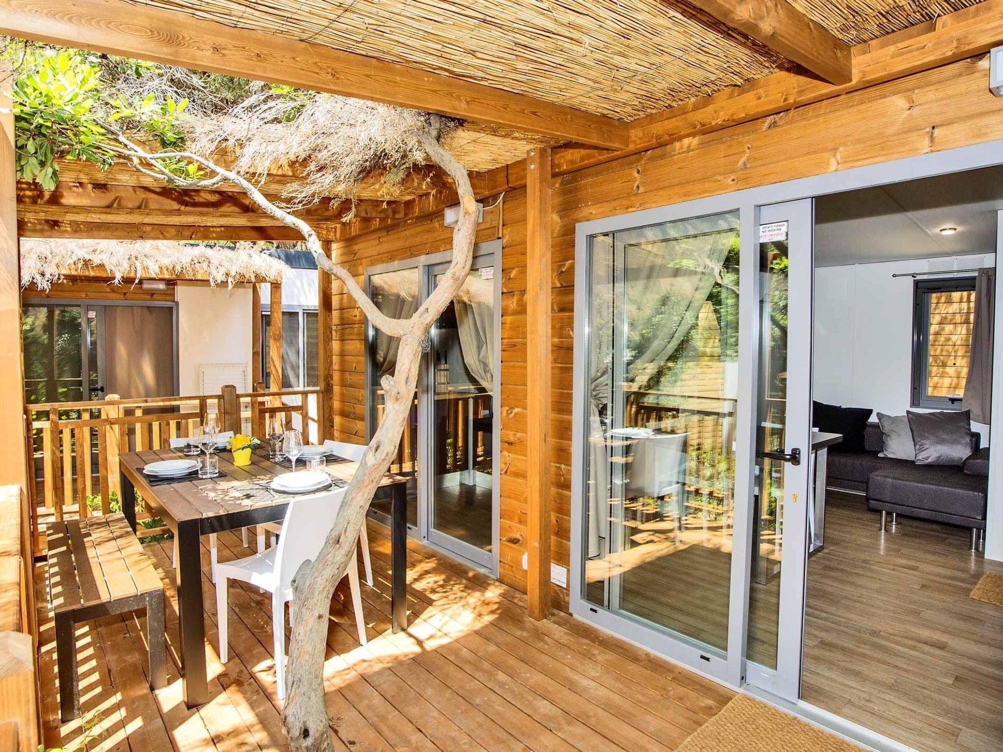 This has modern furnishings and fittings, ideal for a relaxing family holiday. It has a bedroom with a double bed, a bedroom with two single beds and a bunk bed, two bathrooms, a living room with a sofa bed, a TV, a well-equipped kitchen and air conditioning.