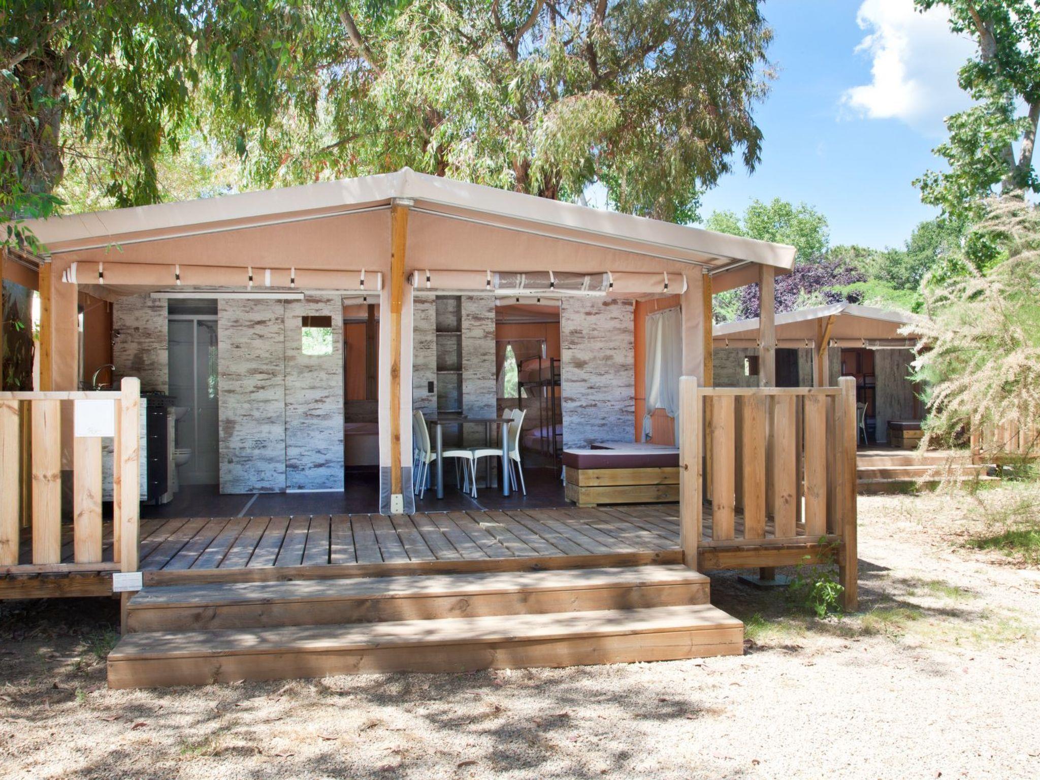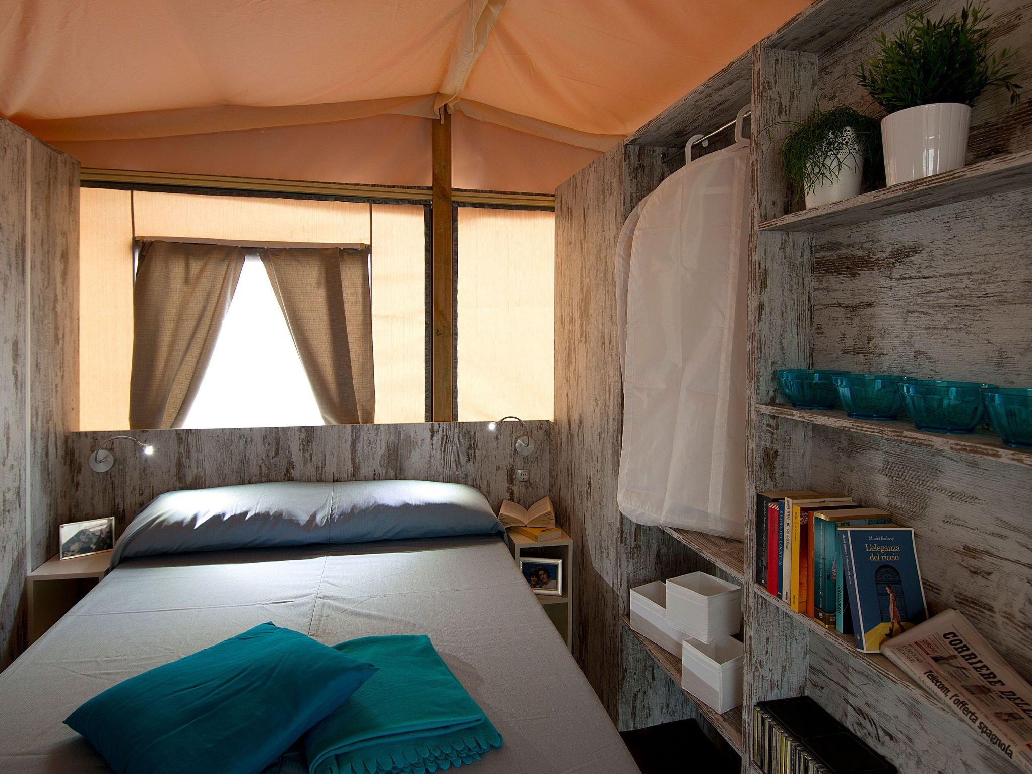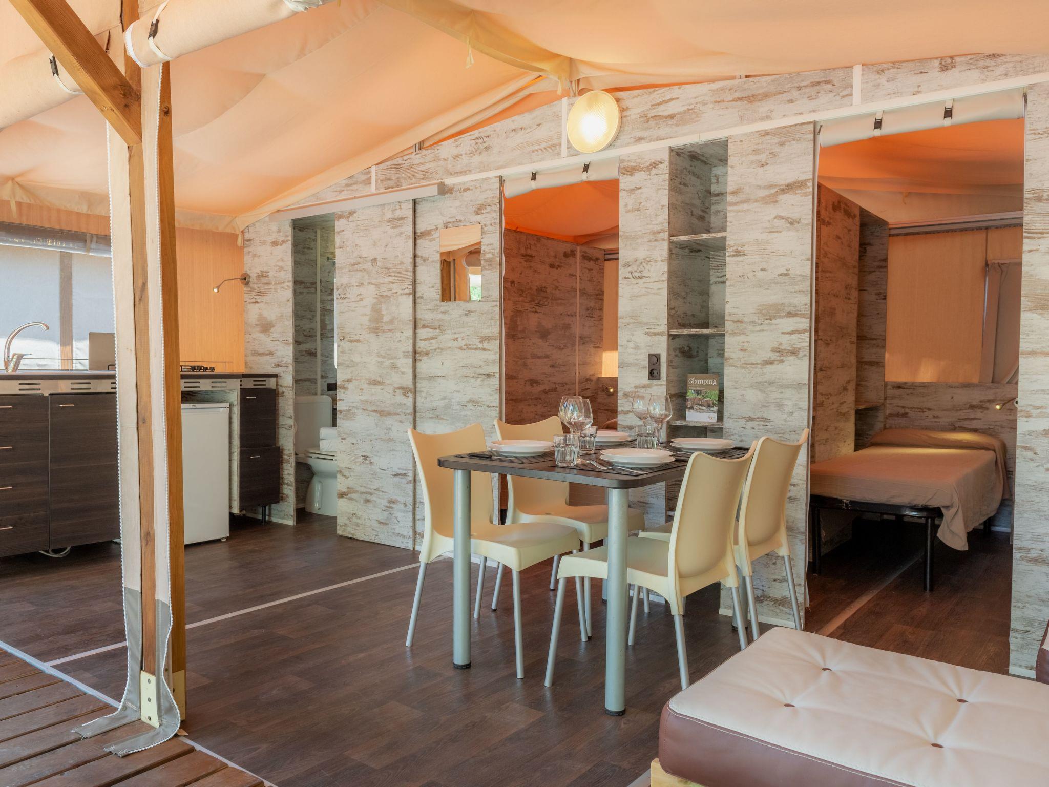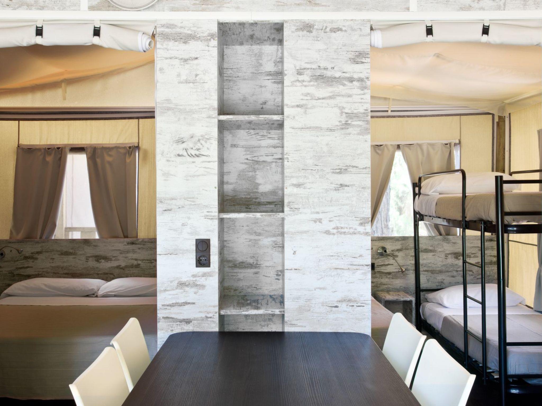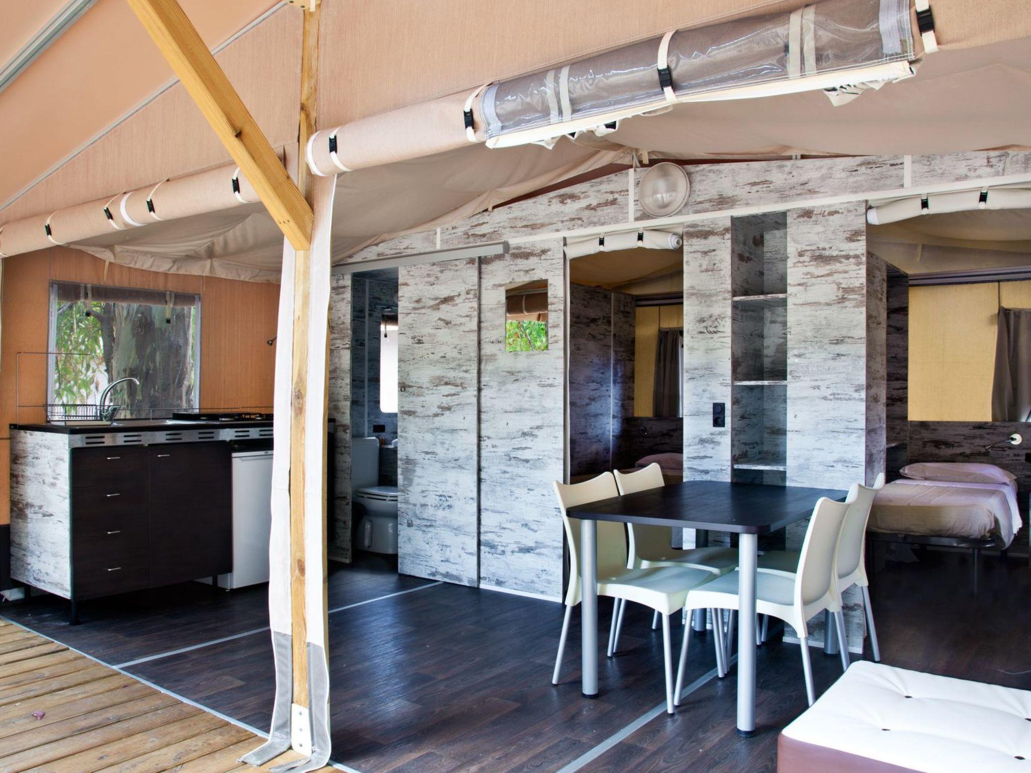 The Safari Lodge Tents are glamping tents equipped with every comfort. When the entrance curtains are opened, the living room becomes one with the large outdoor veranda, where you can relax. The wooden walls inside, in natural colours, blend in well with the surrounding environment, immersed in nature.Inside: a double room with French bed (140×190), a triple room with bunk beds, bathroom with shower cubicle and washbasin.Outside: veranda furnished with table, chairs and sofas, kitchenette equipped with utensils and crockery, fridge.