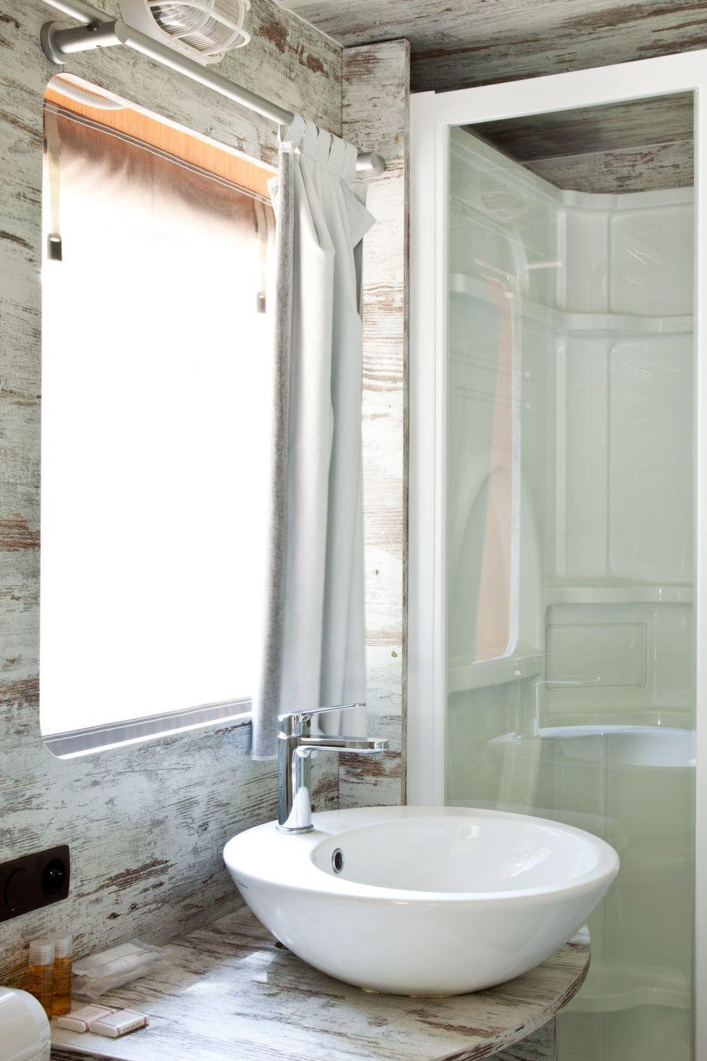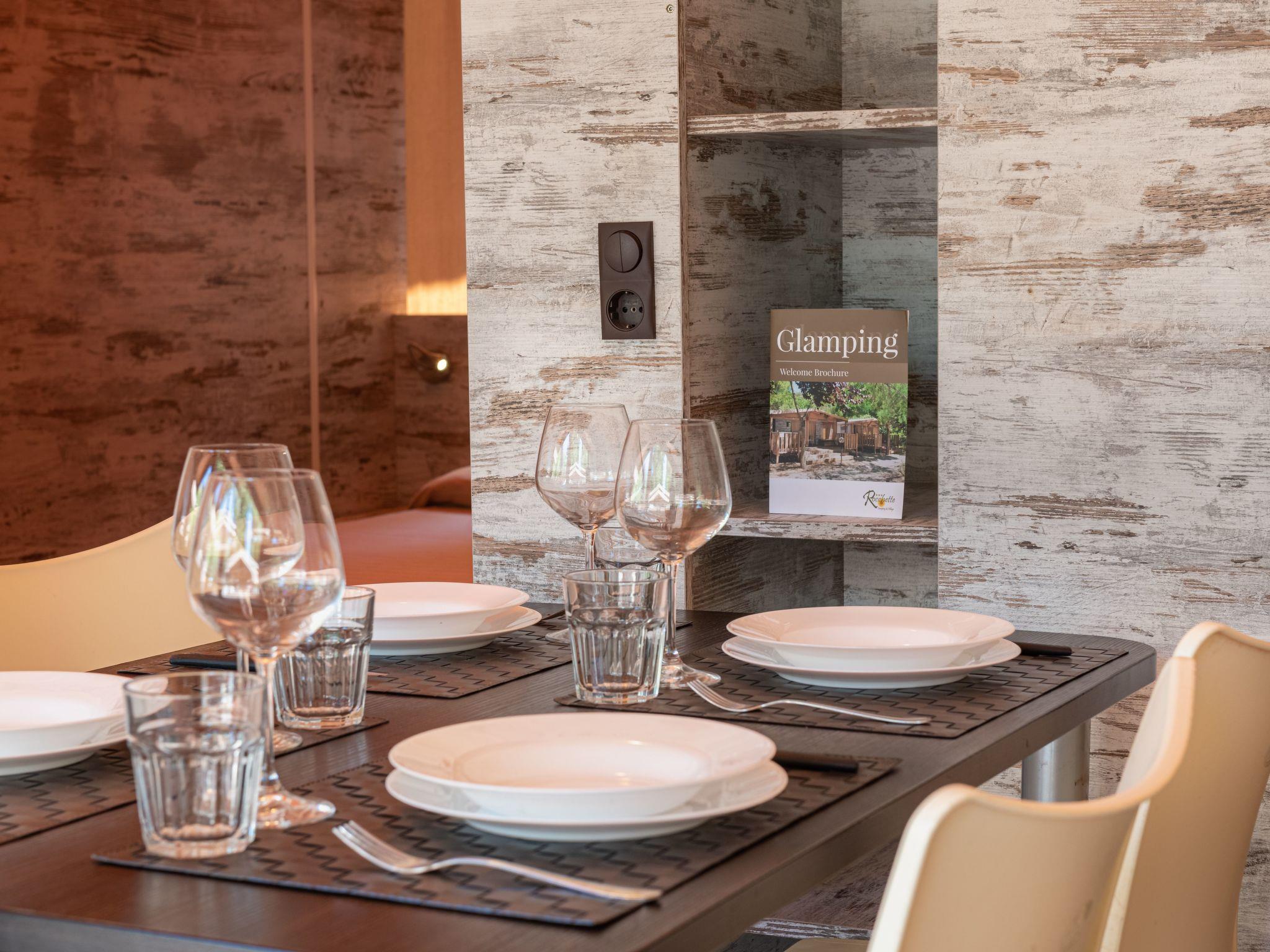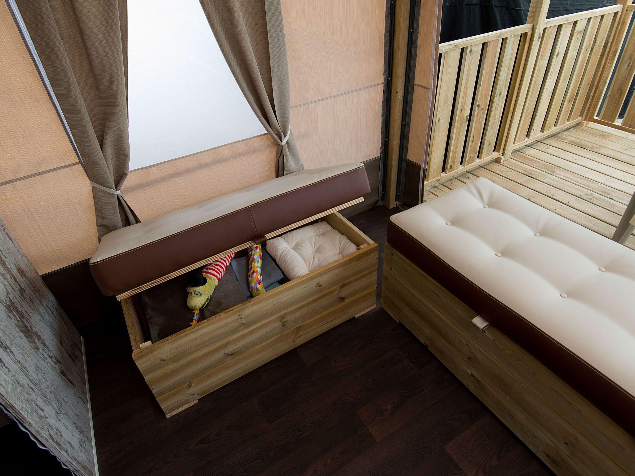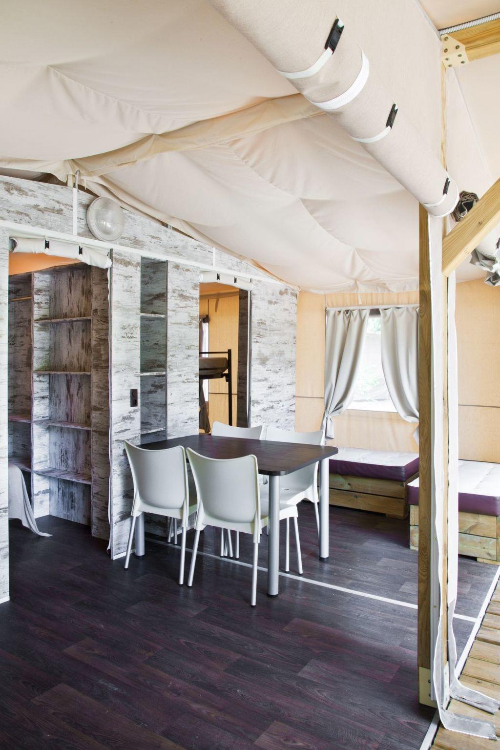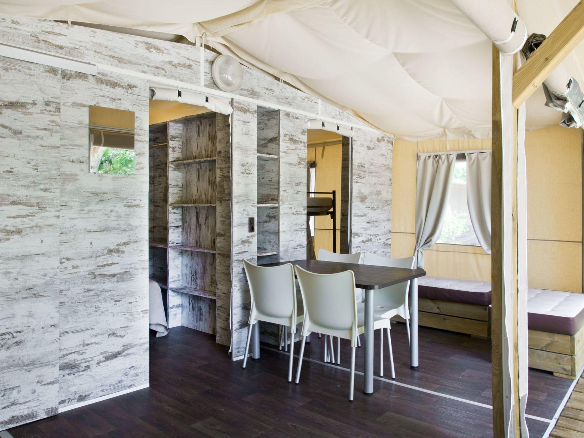 The Safari Lodge Tents are glamping tents equipped with every comfort. When the entrance curtains are opened, the living room becomes one with the large outdoor veranda, where you can relax. The wooden walls inside, in natural colours, blend in well with the surrounding environment, immersed in nature.Inside: a double room with French bed (140×190), a triple room with bunk beds, bathroom with shower cubicle and washbasin.Outside: veranda furnished with table, chairs and sofas, kitchenette equipped with utensils and crockery, fridge.