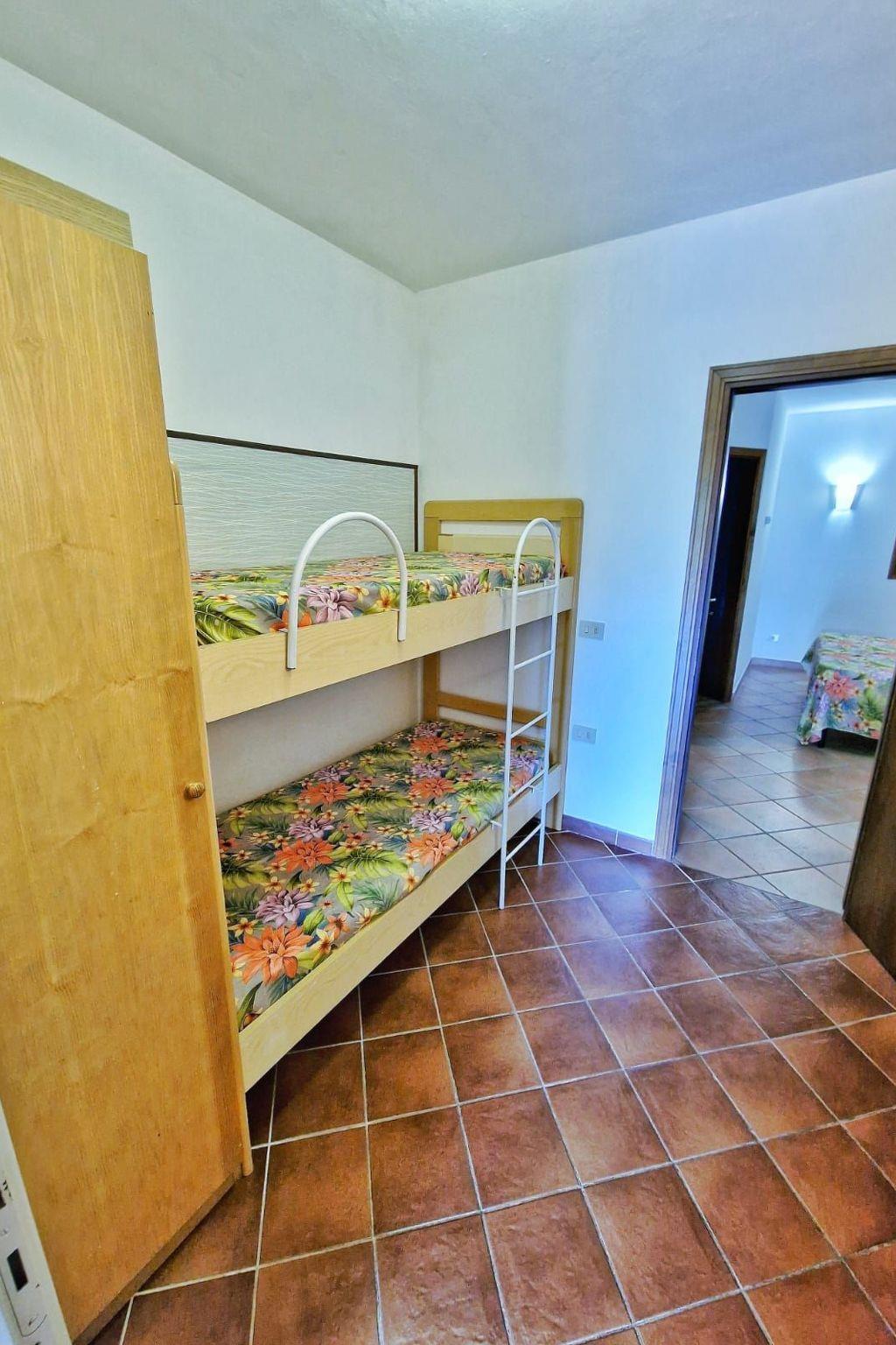 Comprising living room with kitchenette and double sofa bed (entrance with double French window, large ante-bathroom with bunk bed, private bathroom with shower cubicle (no window), bedroom (with window on service corridor side with natural light and naturally ventilated) with double bed + single bed and private service bathroom with window also on corridor side. Colour TV, air conditioning, standard fridge. Covered veranda equipped with table and chairs.