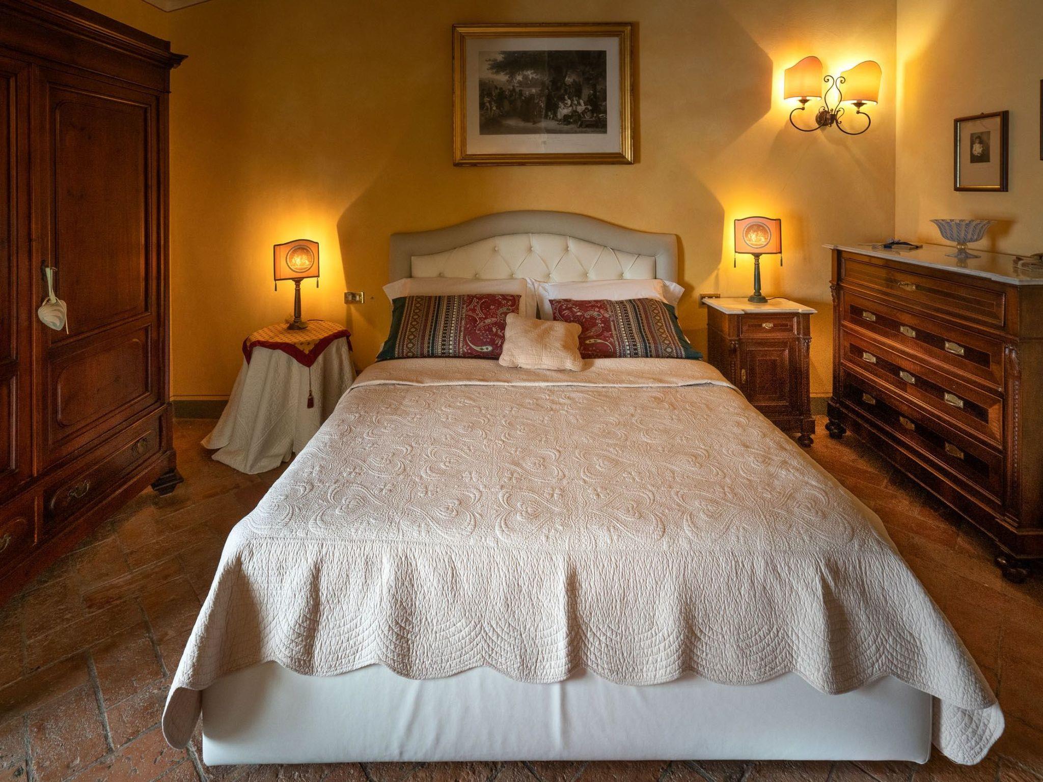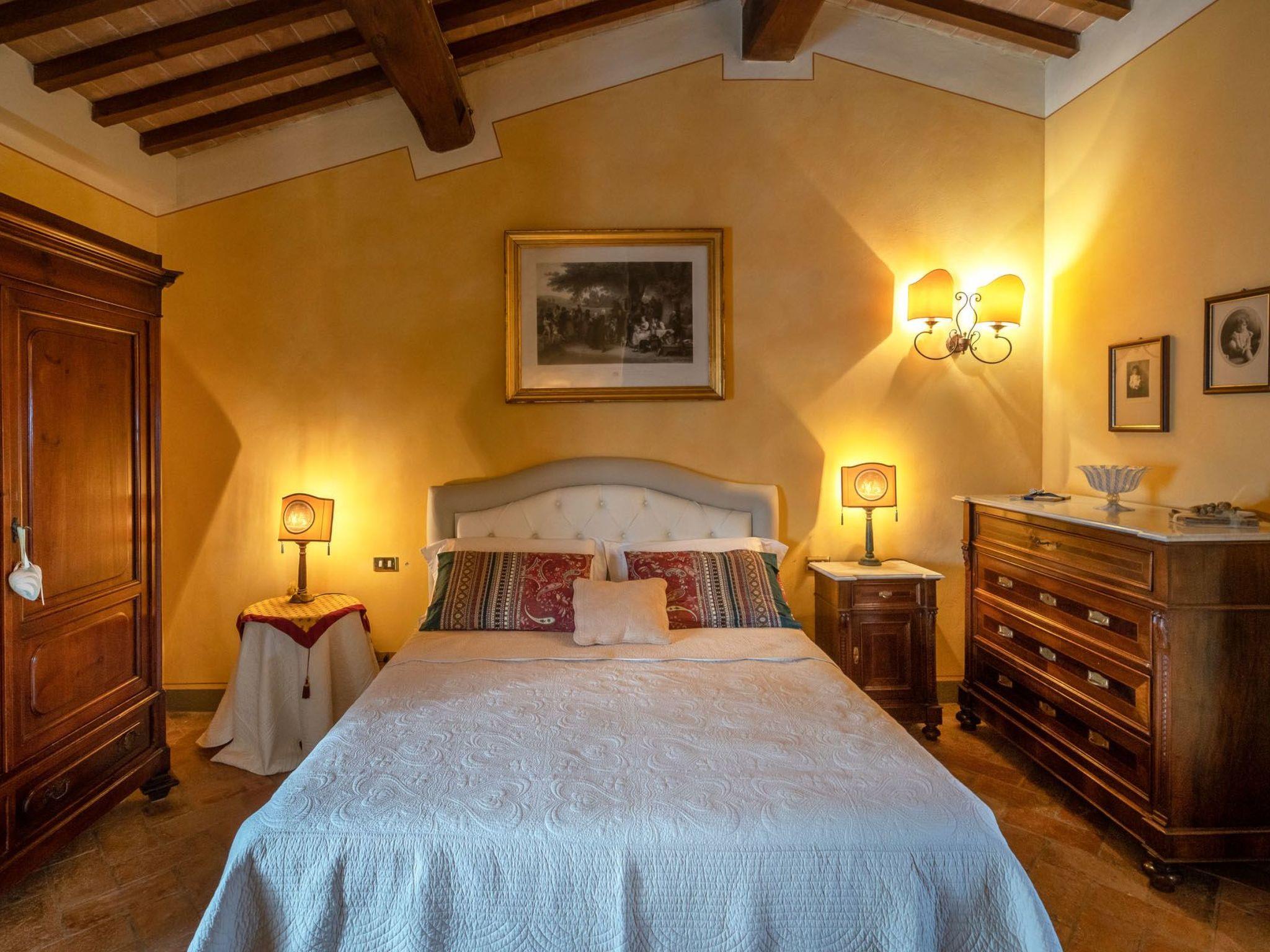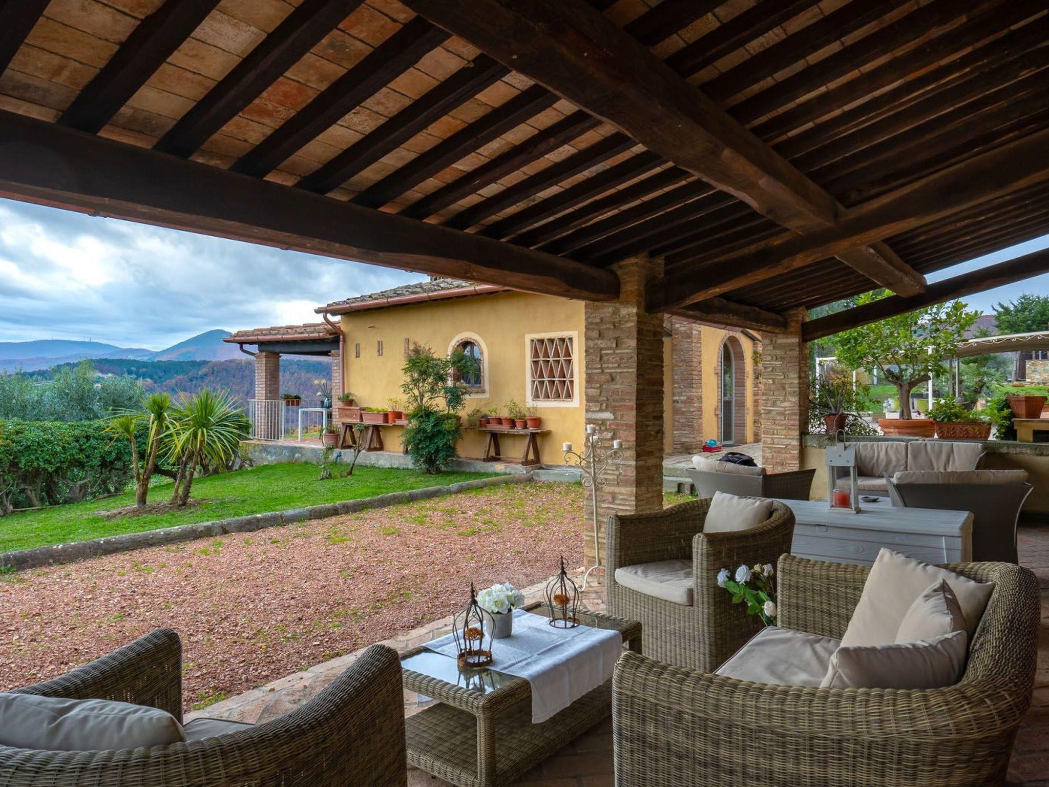 An external staircase, typical of Tuscan farmhouses, leads to the interior of the accommodation, consisting of a large living room, a fully equipped kitchen and two terraces with panoramic views. The sleeping area consists of two elegant double bedrooms with private bathrooms. On the ground floor there is a lovely portico surrounded by the garden, furnished with a sofa and armchairs. In front of the porch, for exclusive use, there is an outdoor kitchen with a covered veranda equipped for dinners for up to 8 people. From here, as well as from all sides of the house, there is a fantastic view of the surrounding hills and the town of Volterra.