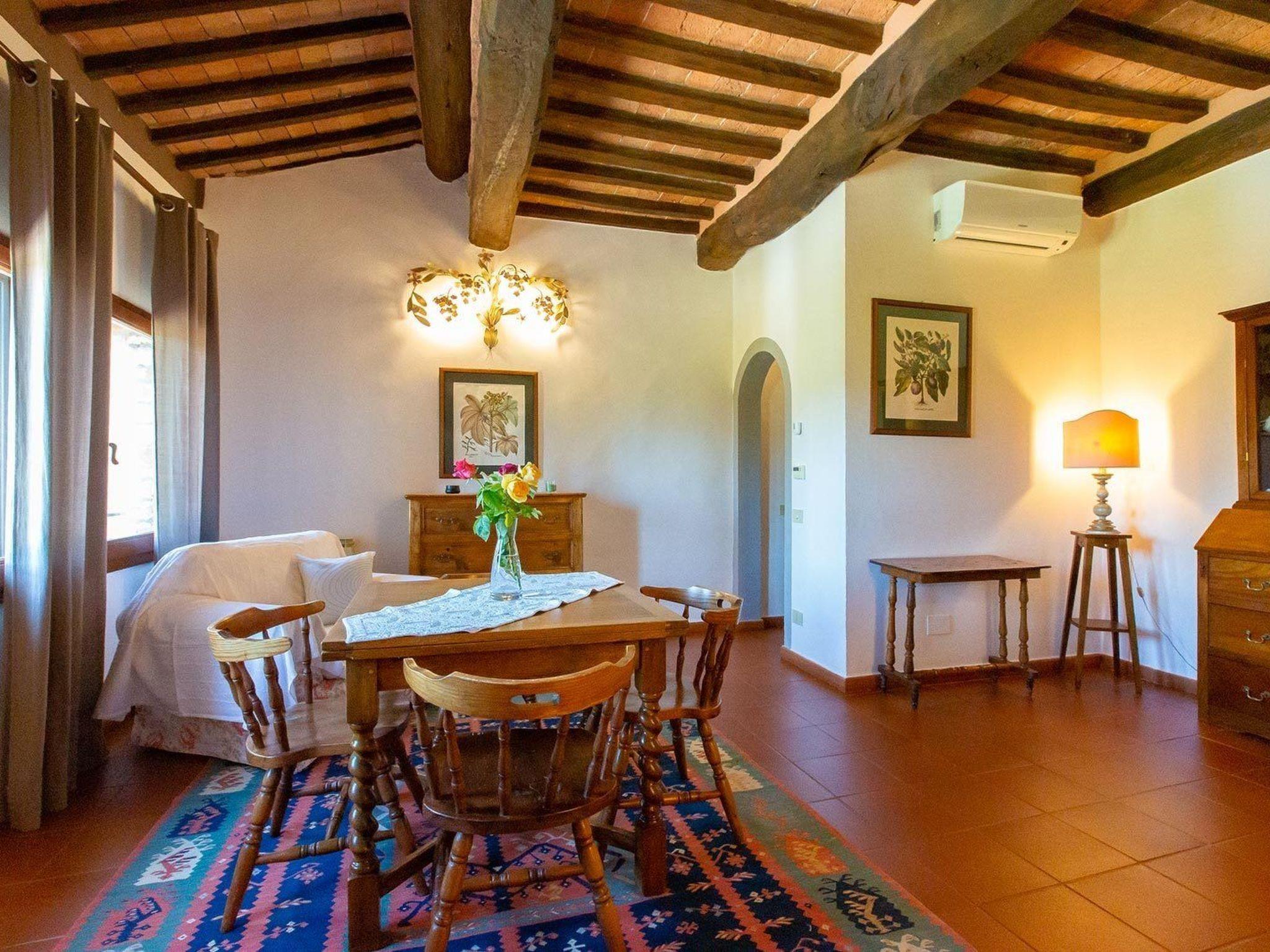 Location Macciano. In the middle of the splendid "Val di Chiana", situated on the first floor of a splendid 16th century farmhouse that has been completely renovated, the flat enjoys a marvellous view of the entire surrounding valley thanks to a living room created from an old window loggia.Vali Apartment situated on the first floor overlooking the villa's beautiful rose garden. Comprising living-dining room with sofa bed, open kitchen, double bedroom and bathroom with shower. Outdoor area equipped with parasol, table and chairs.