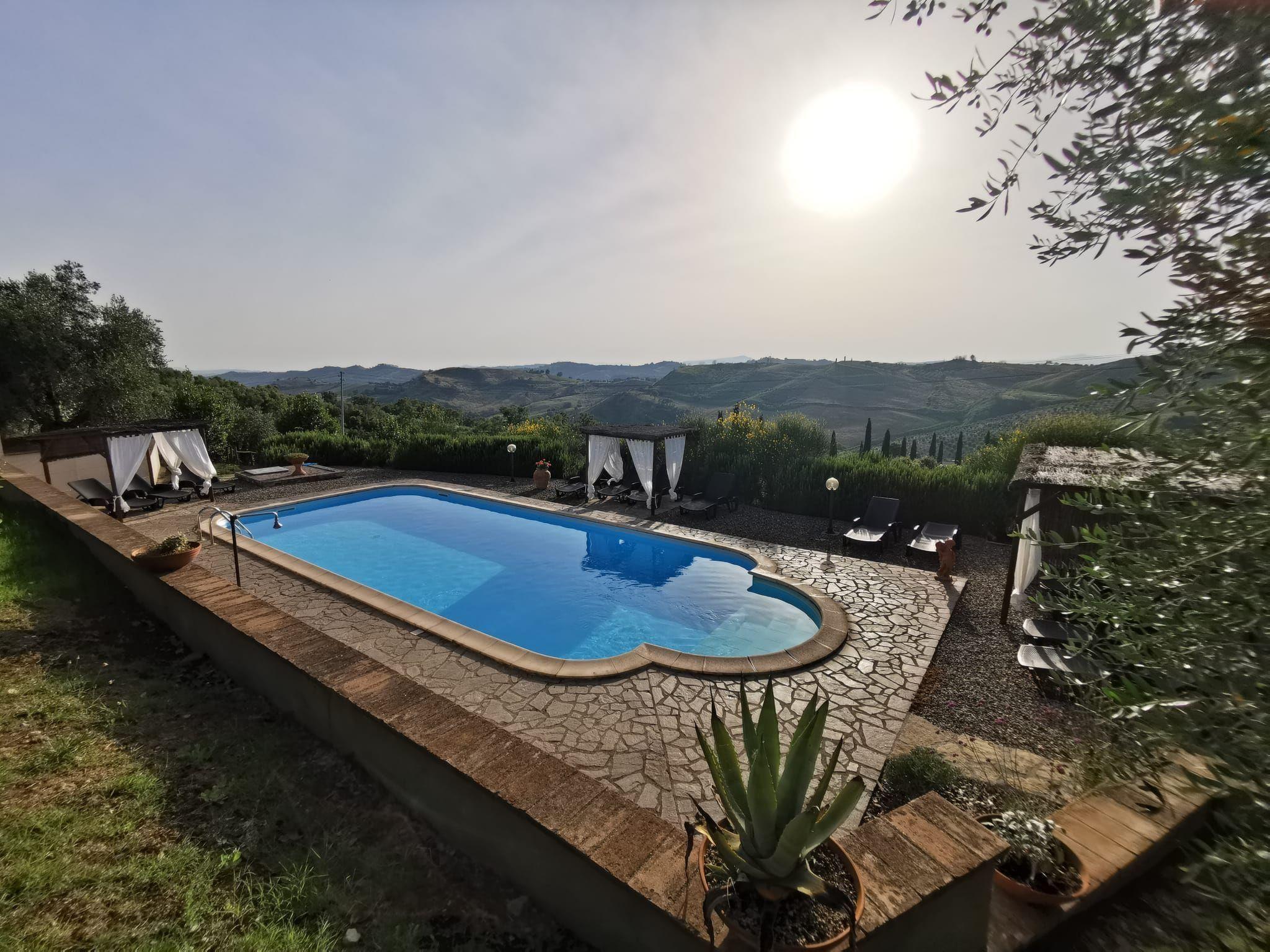 Outside, the cottage boasts a veranda furnished with table and chairs, perfect for al fresco dining while contemplating the splendid view of the Tuscan countryside. The private garden, with barbecue and exclusive parking, offers ample green space to relax or play in serenity. The swimming pool, for shared use with three other villas, is surrounded by an area equipped with a gazebo and personal sun loungers, promising moments of fresh fun and relaxation under the Tuscan sun.