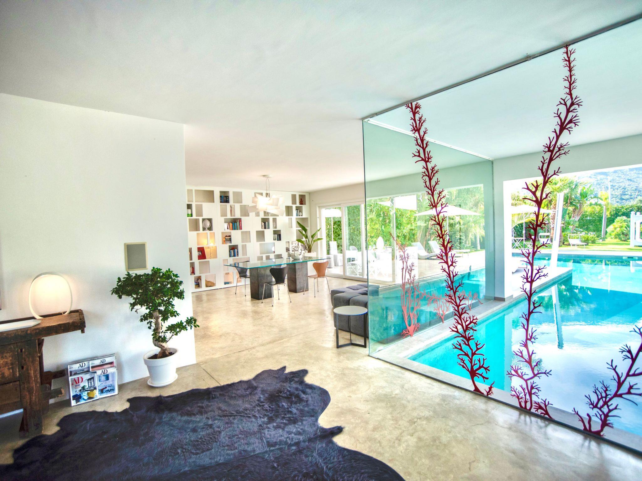 This modernist style property extends on one floor and is located in the garden that surrounds it, while the pure white structure immediately strikes the visitors attention. The large living area comprises living room, dining room and kitchen creating a fluid open-plan space, emphasized by the natural concrete floor and the large windows that redefine the interior space so that it becomes one with the outside. It allows you to enjoy the pool view and it seems as if it extends into the living area.