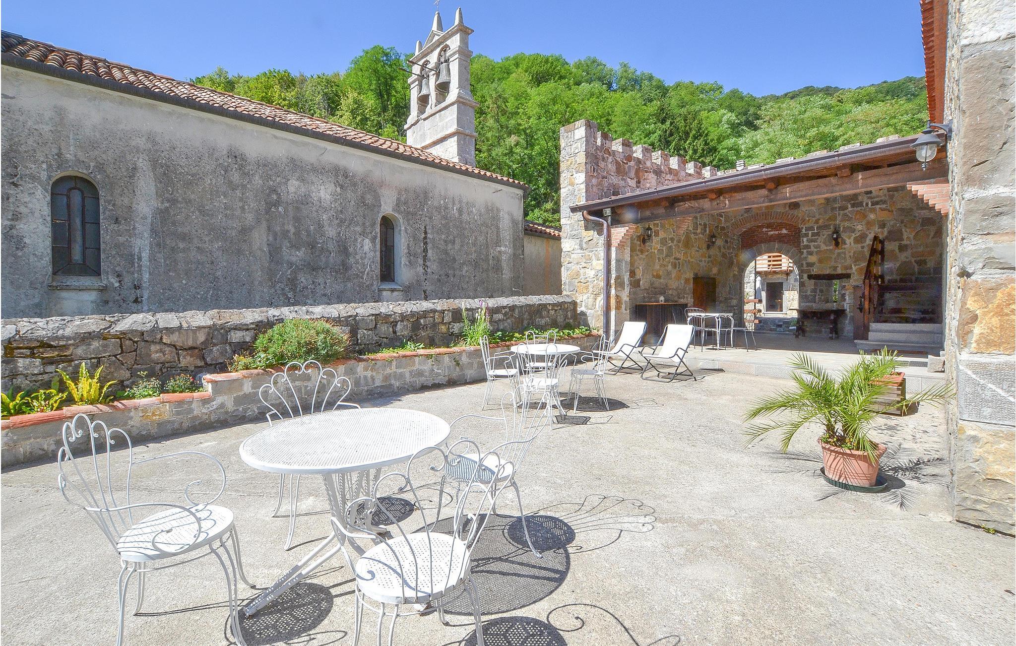Faktisk er huset beliggende i et slot, der er bygget i 1200, og det indlejret i den frodige natur med skove i Natisone-dalen, der ligger i en højde af omkring 300 meter. Dette område ligger ikke langt fra den slovenske grænse og er berømt for sine vandre- og cykelstier. Ved indgangen til stuen er der en stor, delvis overdækket og delvis fri terrasse, der har udsigt over de omkringliggende dale og bakker med et vidunderligt panorama. Et par meter fra stuedøren føres du ind i det store køkken med alle apparater.