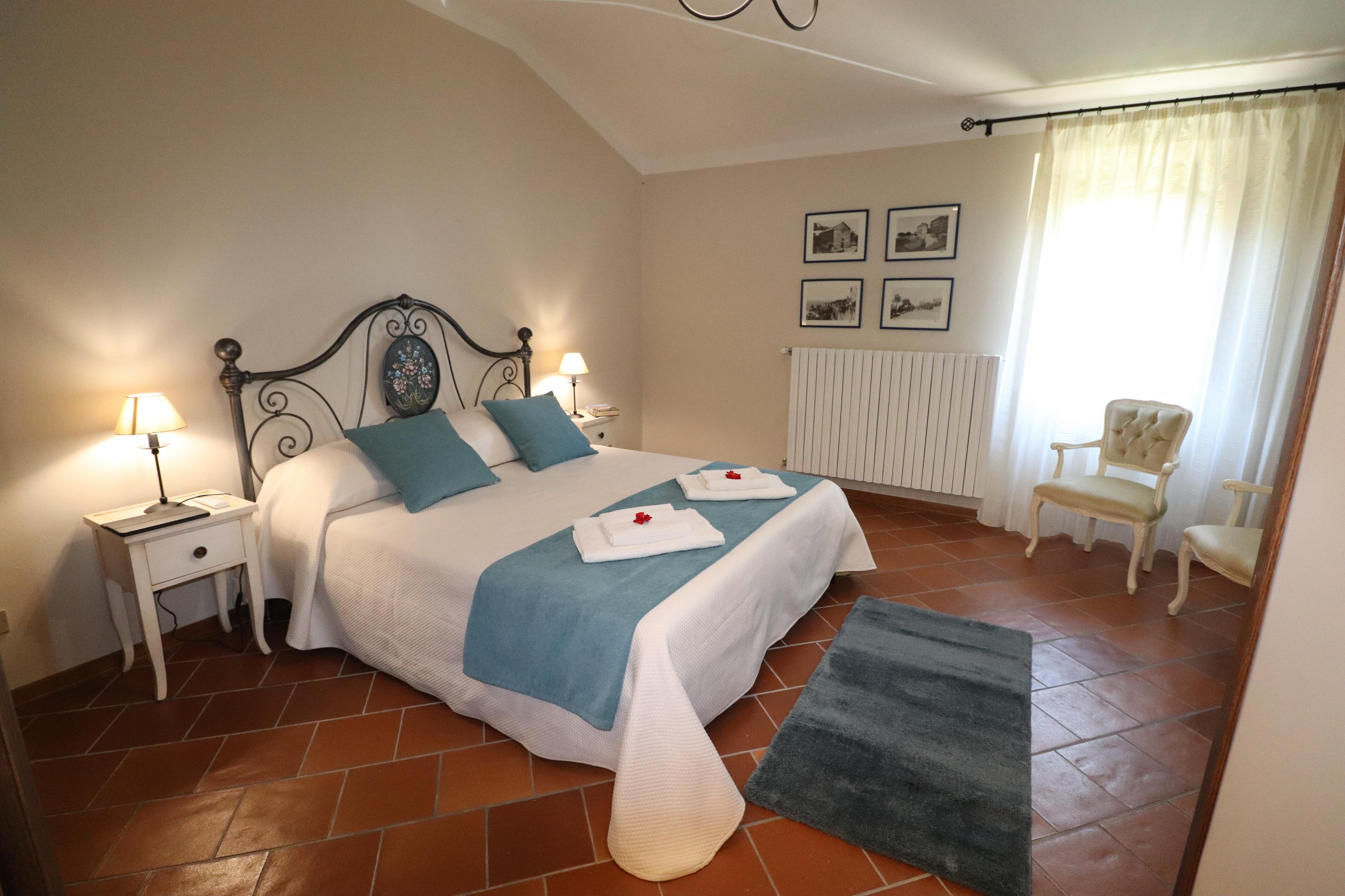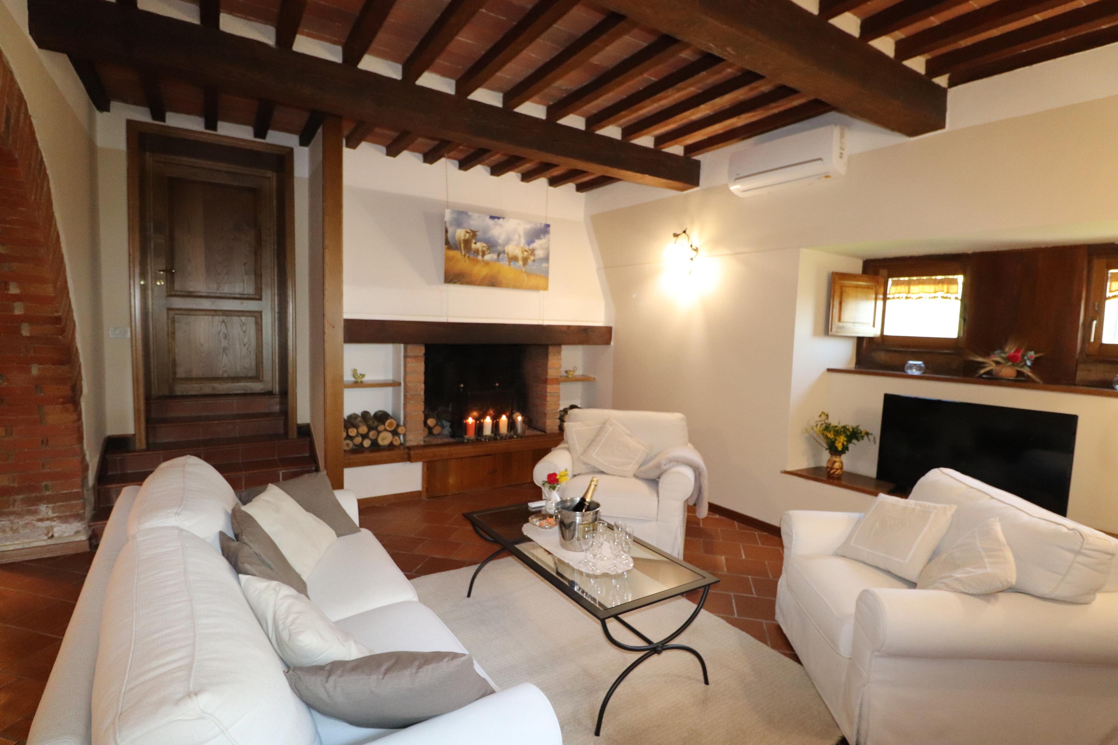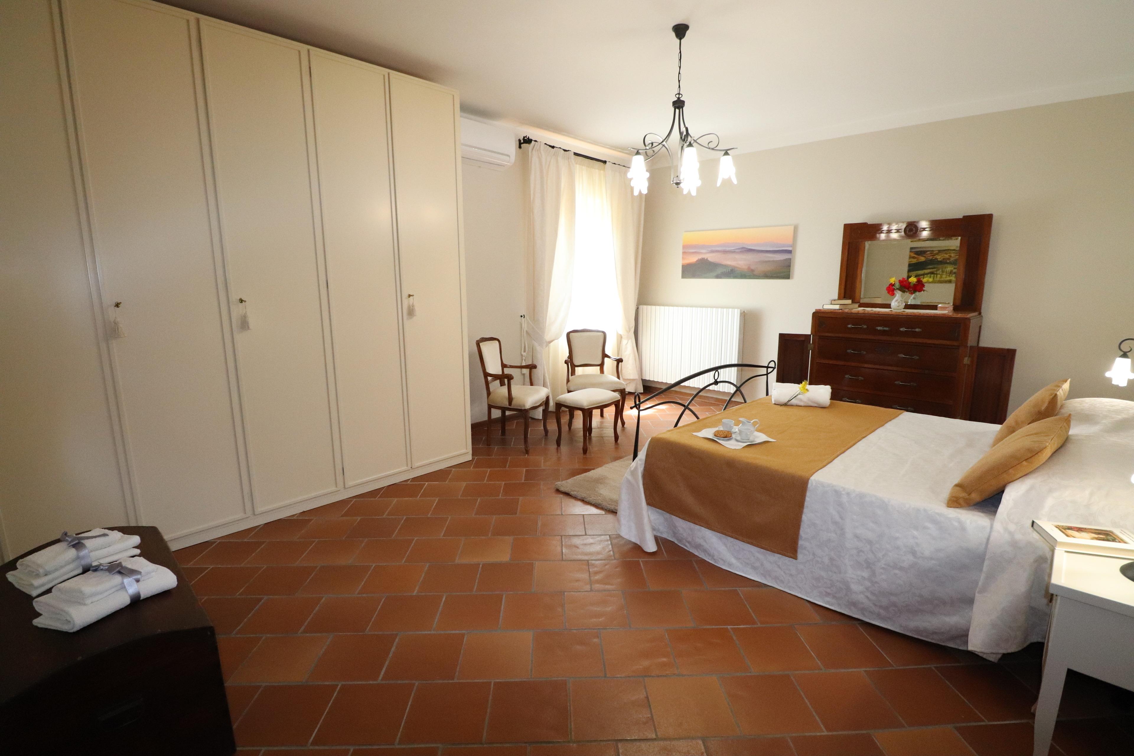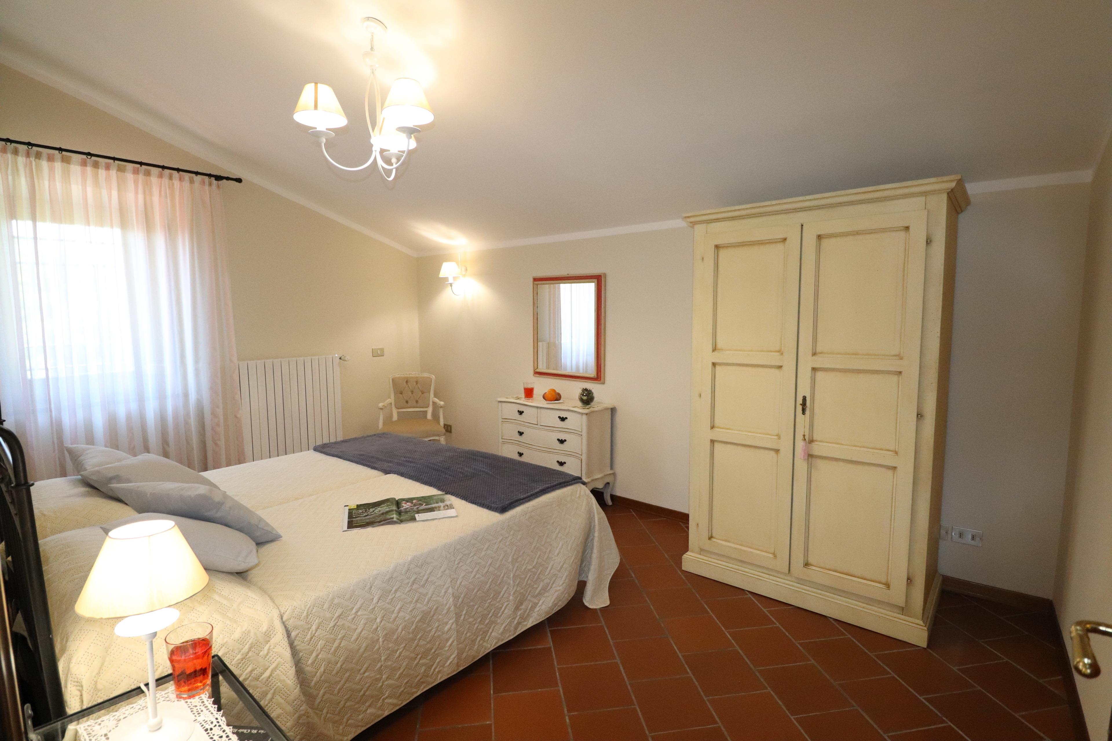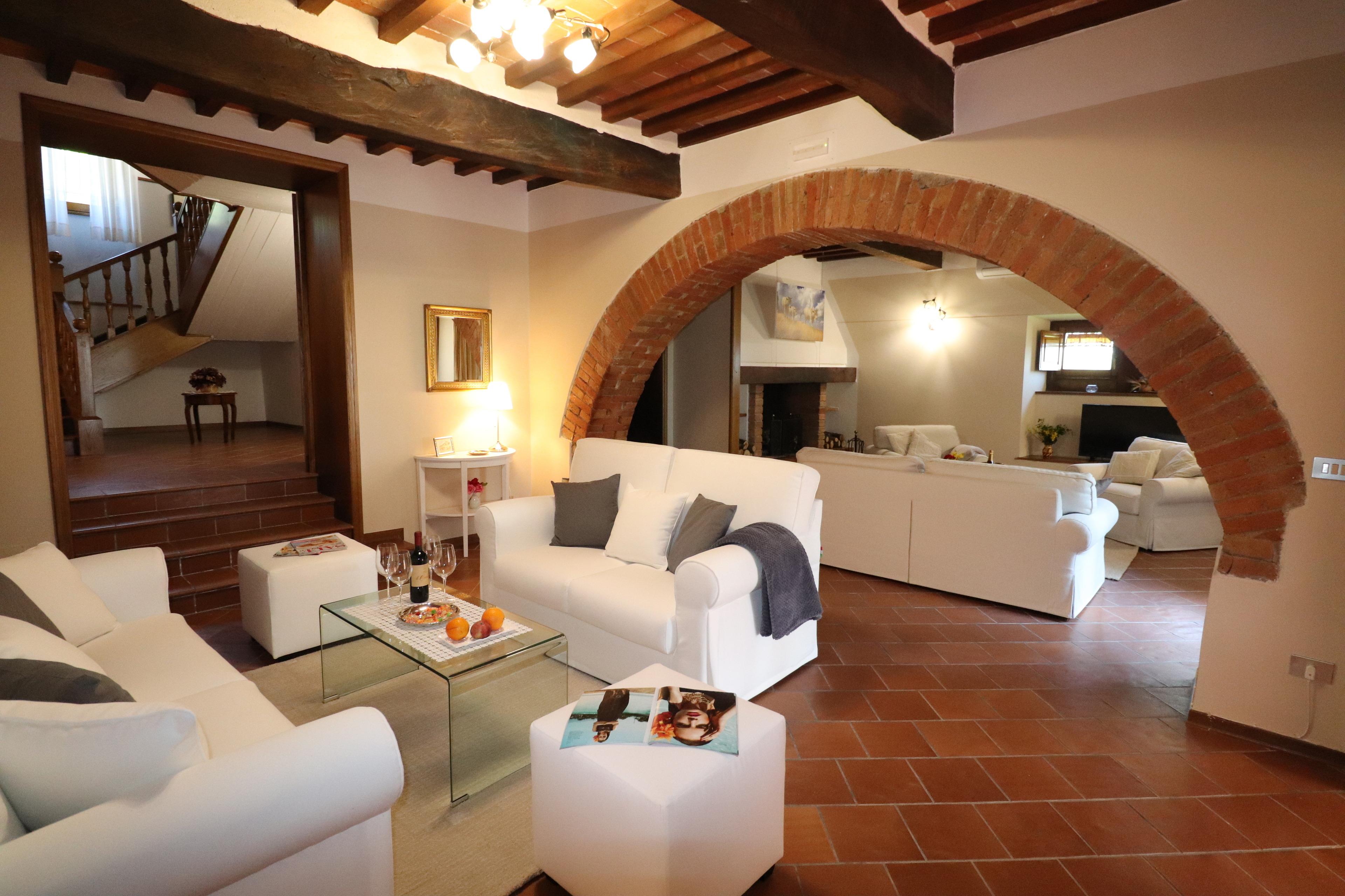 Die Innenräume der Villa Stefi sind geräumig (ca. 400m2) und hell und zeichnen sich durch Hallen mit Decken mit freiliegenden Holzbalken und Terrakotta-Böden im ganzen Haus aus, die an den weltberühmten rustikalen toskanischen Stil erinnern. Die Villa erstreckt sich über zwei Etagen, die sowohl intern als auch über eine Außentreppe aus Stein miteinander verbunden sind. Vom Erdgeschoss aus gelangt man in ein großes Wohnzimmer mit Sofas, Satellitenfernsehen und Kamin. Von dort aus gelangt man in den Essbereich mit Esstisch und angrenzender Küche, die mit allem ausgestattet ist, was man zum Kochen seiner Lieblingsgerichte braucht. Vervollständigen Sie das Erdgeschoss, Klettern 5 Stufen, ein großes Schlafzimmer mit Doppelbett und ein Badezimmer mit Dusche.
