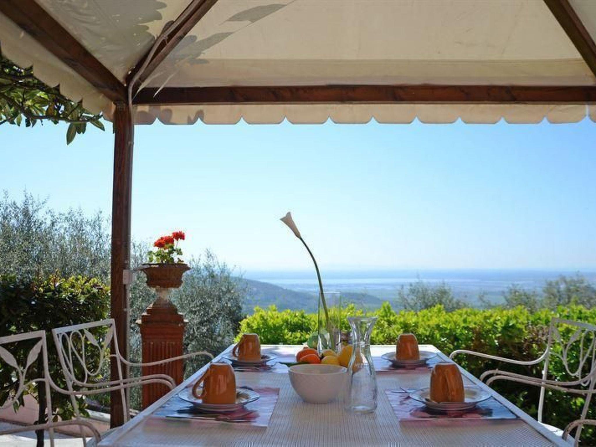 The outdoor patio, for exclusive use, with a gazebo table and chairs and a sofa is a comfortable and charming space with a view sweeping from the sea to the lake and the hills.
