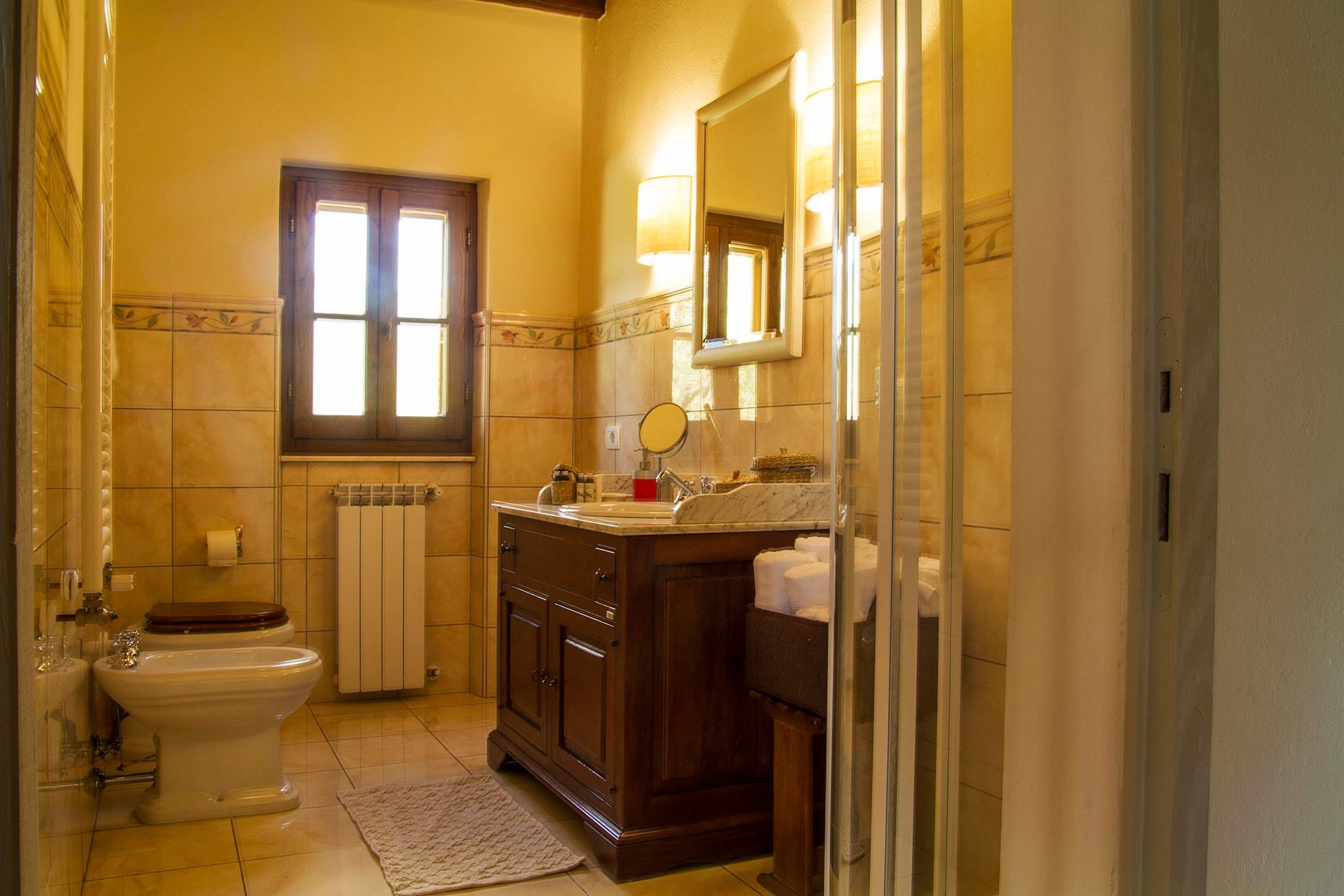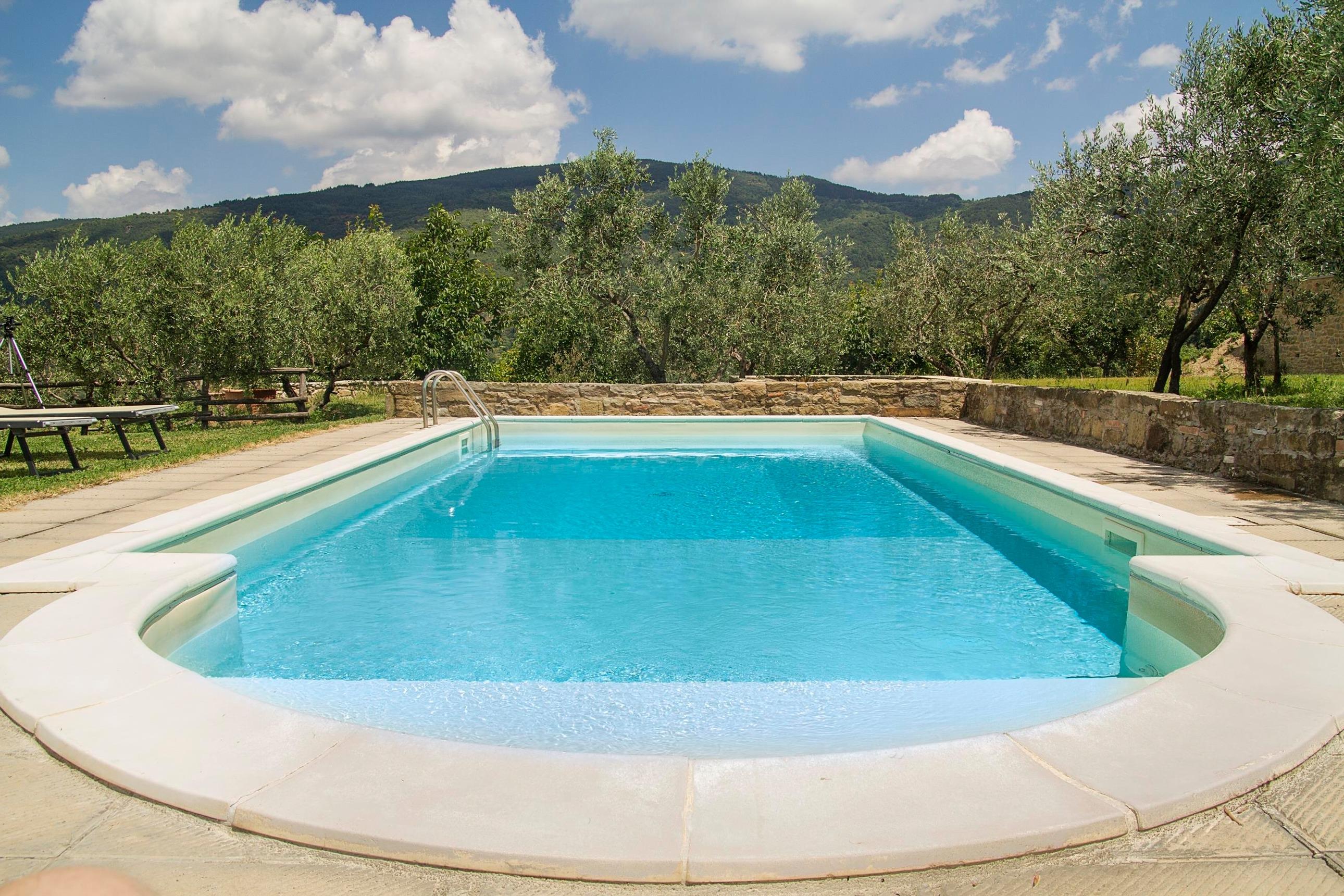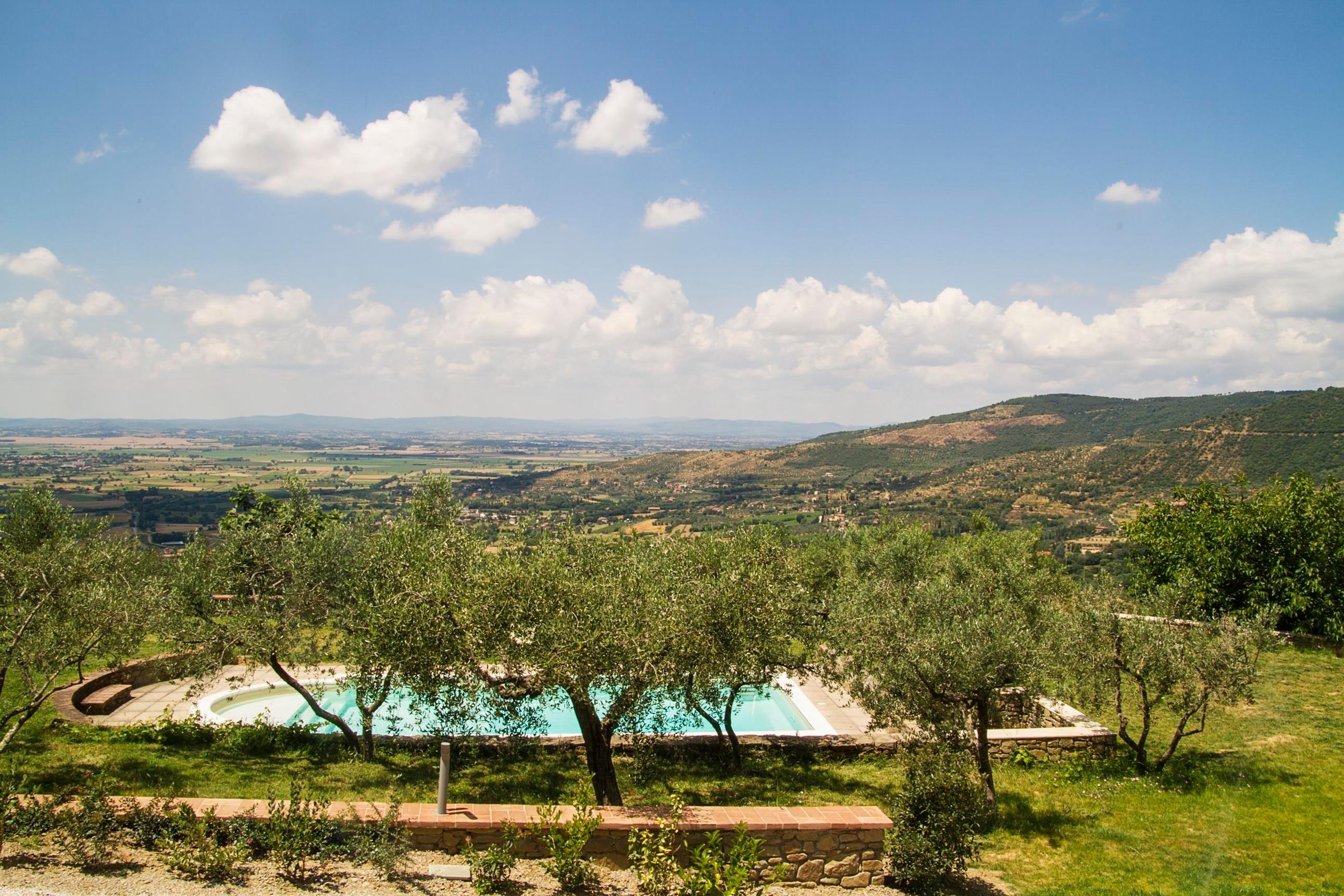 Sie verfügen über einen schönen Swimmingpool mit römischer Treppe, umgeben von einer großen Sonnenterrasse mit Sonnenliegen und Pavillon mit Blick auf das Val di Chiana. Die Villa hat einen privaten Parkplatz.