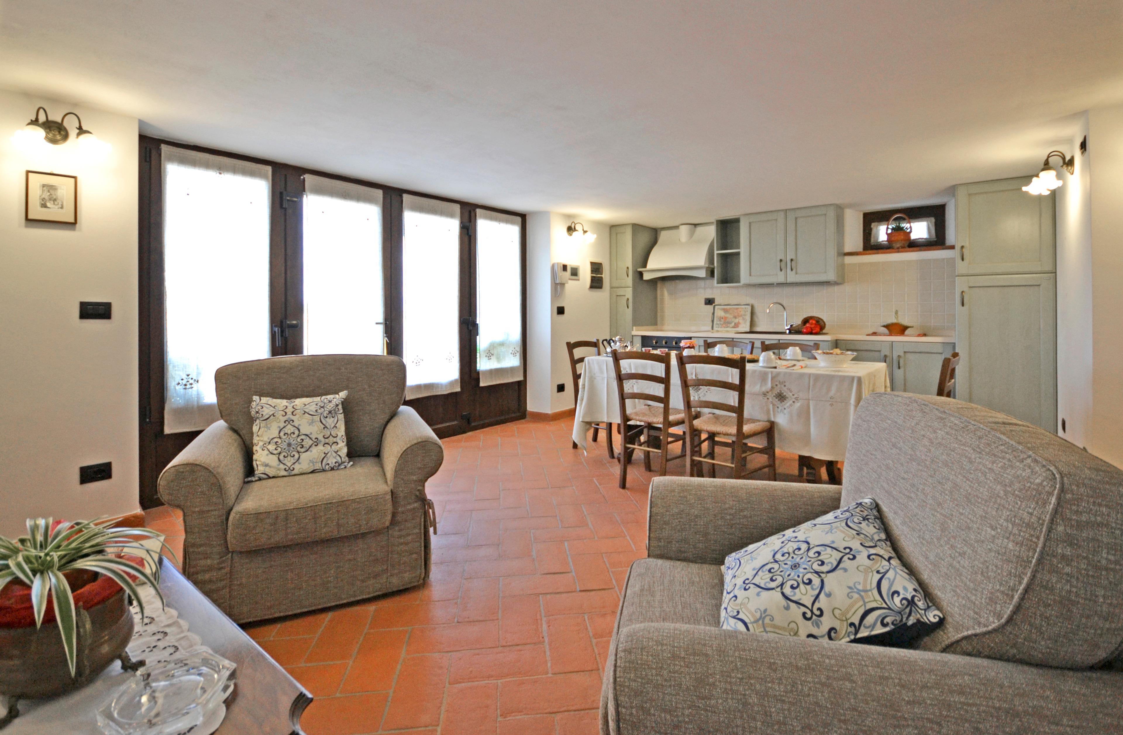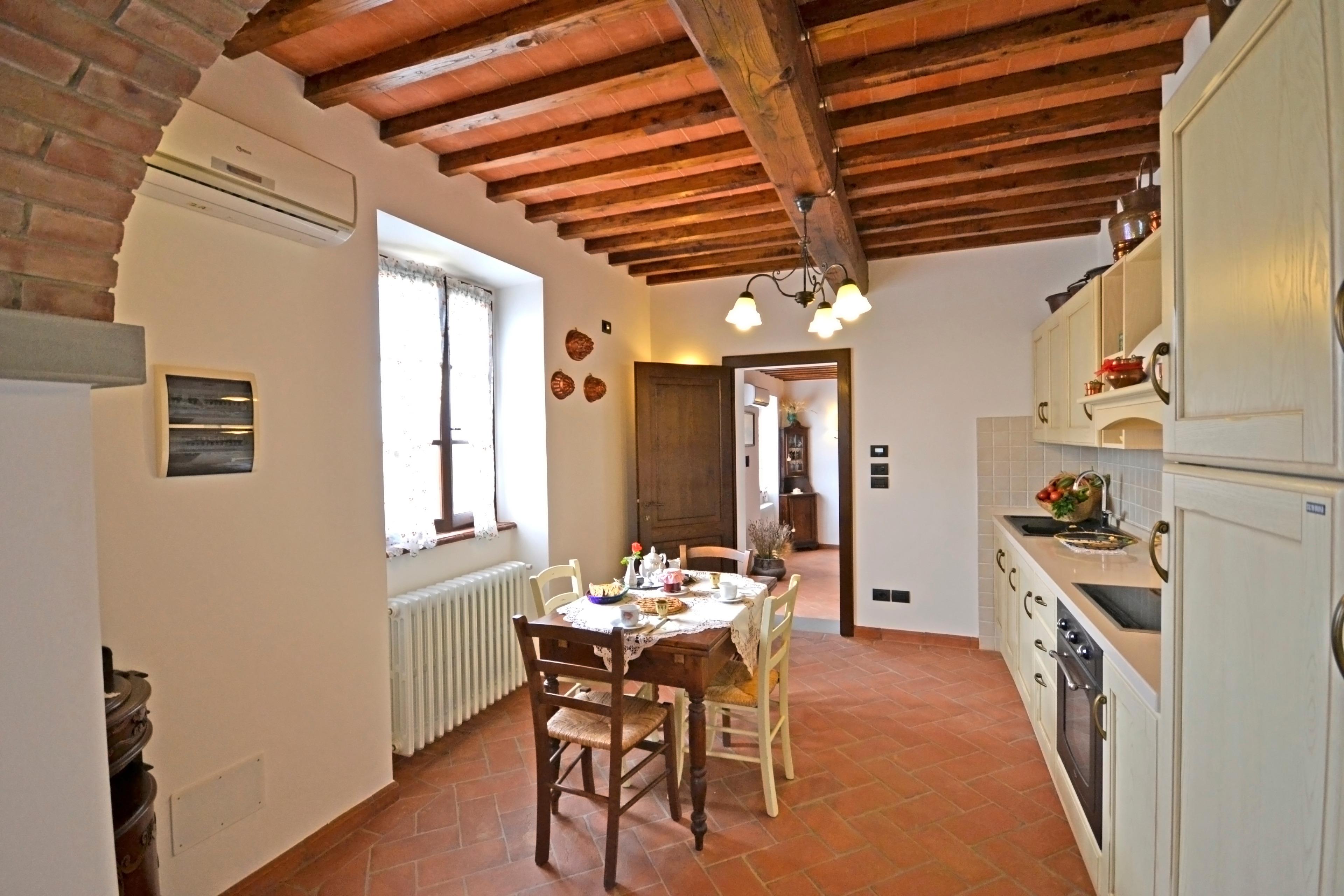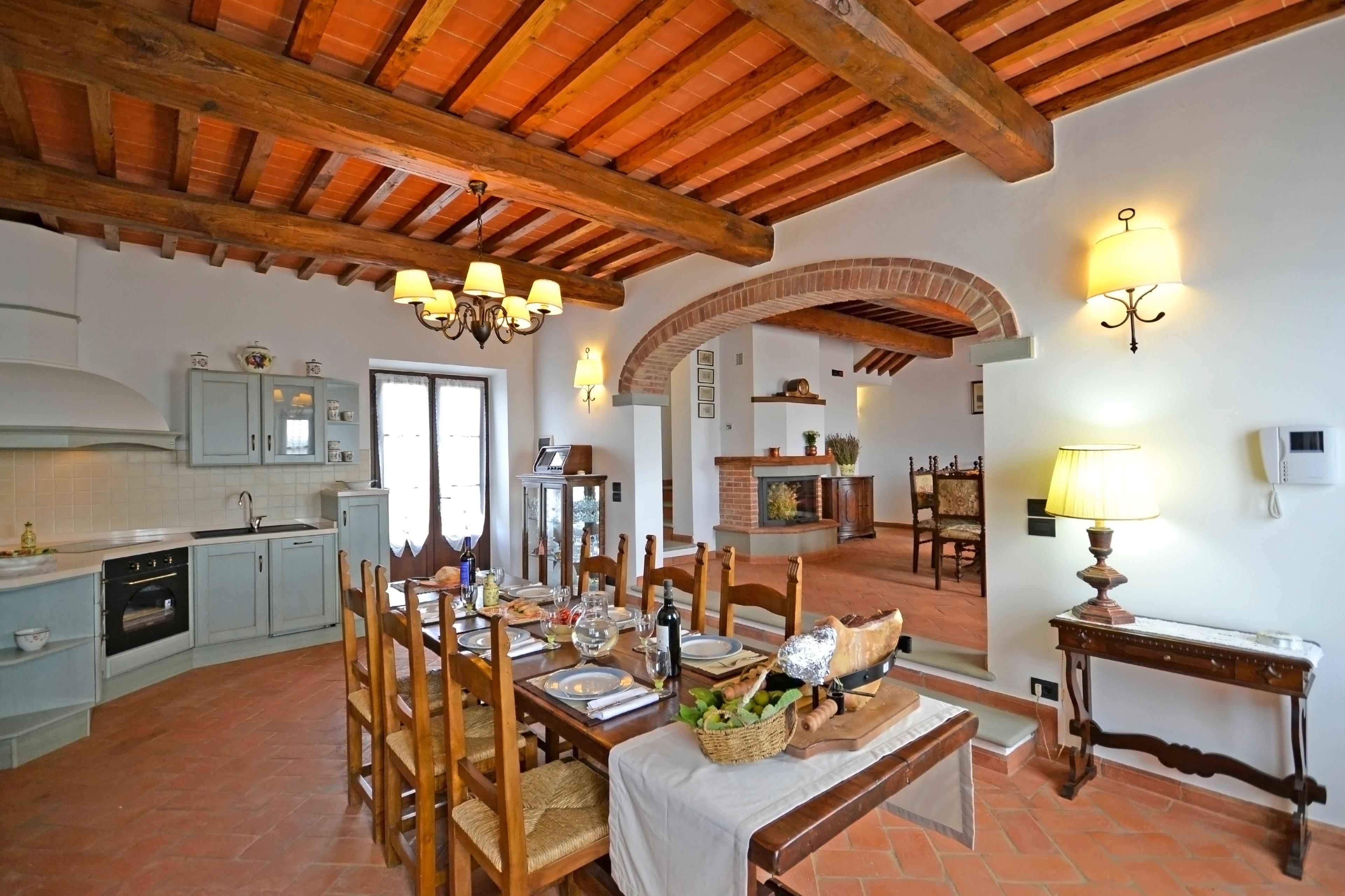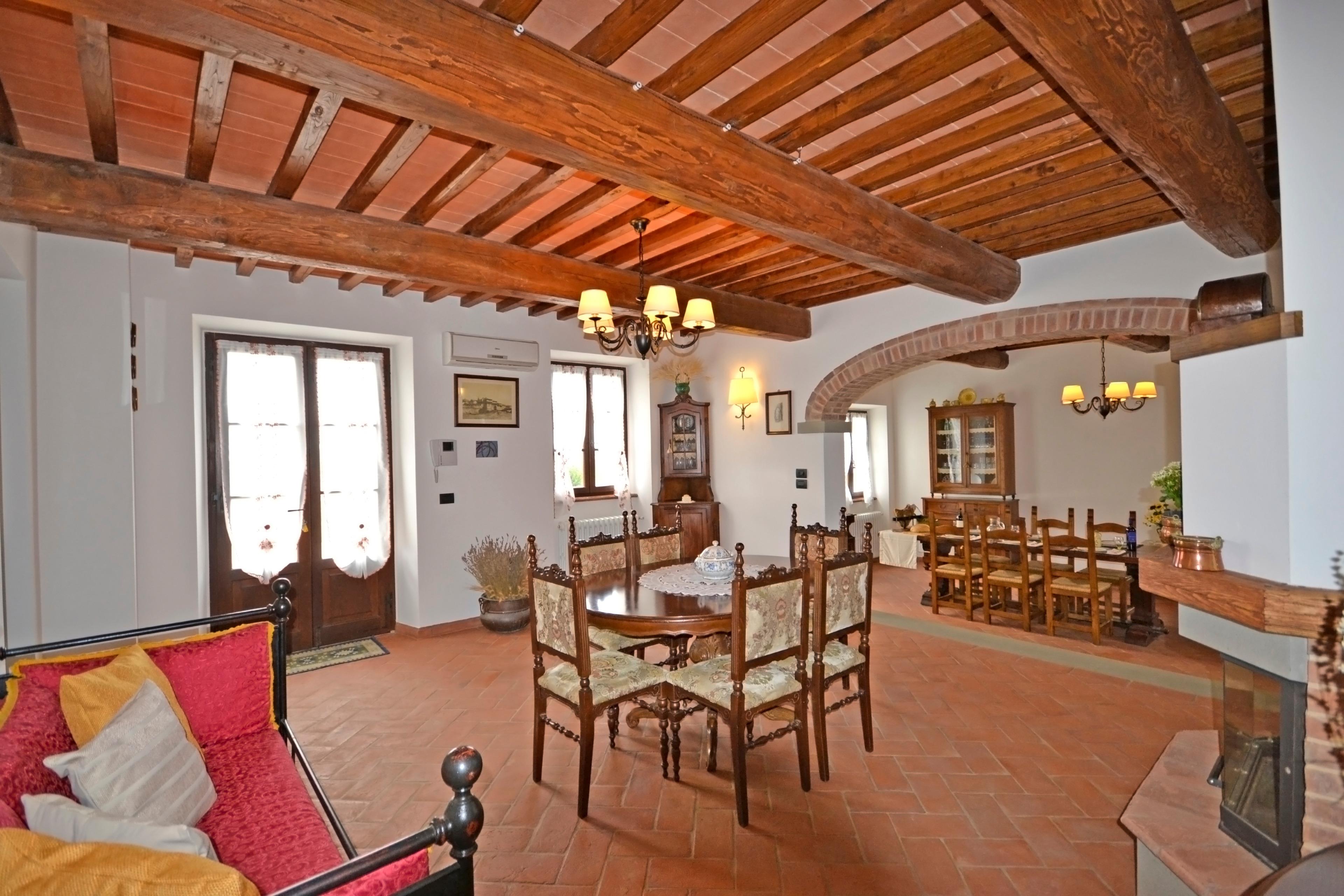 Die Innenräume von Villa Anita sind geräumig, hell und durch Decken mit freiliegenden Holzbalken und Terrakottaböden geprägt, die an den rustikalen toskanischen Stil erinnern, der auf der ganzen Welt berühmt ist. Die Villa erstreckt sich über drei Etagen und ist in drei Wohnungen aufgeteilt, die miteinander kommunizieren. Eine Eigenschaft, die es für große Gruppen ideal macht, alle zusammen zu sein und gleichzeitig die Privatsphäre zu wahren. Man kann das Erdgeschoss von drei verschiedenen Eingängen aus erreichen: der erste Eingang bietet Zugang zu einem Wohnzimmer mit Steinkamin, Sofa und Sat-TV, das zu einer voll ausgestatteten Küche und einem Esstisch sowie zu einem Einzelzimmer, einem Doppelzimmer und einem Schlafzimmer mit Badezimmer mit Dusche führt. Über den zweiten Eingang gelangen Sie in den größten Raum des Hauses, der mit einem Steinkamin und einem großen Esstisch ausgestattet ist. Von hier aus gelangt man über eine Steintreppe in den ersten Stock, wo sich ein Hauptschlafzimmer mit Bad mit Dusche und Badewanne befindet. Der Salon führt in eine zweite Küche, die ebenfalls komplett mit Esstisch und Sat-TV ausgestattet ist. Das Erdgeschoss wird durch zwei weitere Schlafzimmer ergänzt, ein Doppel- und ein Schlafzimmer mit Etagenbett und Badezimmer mit Dusche.