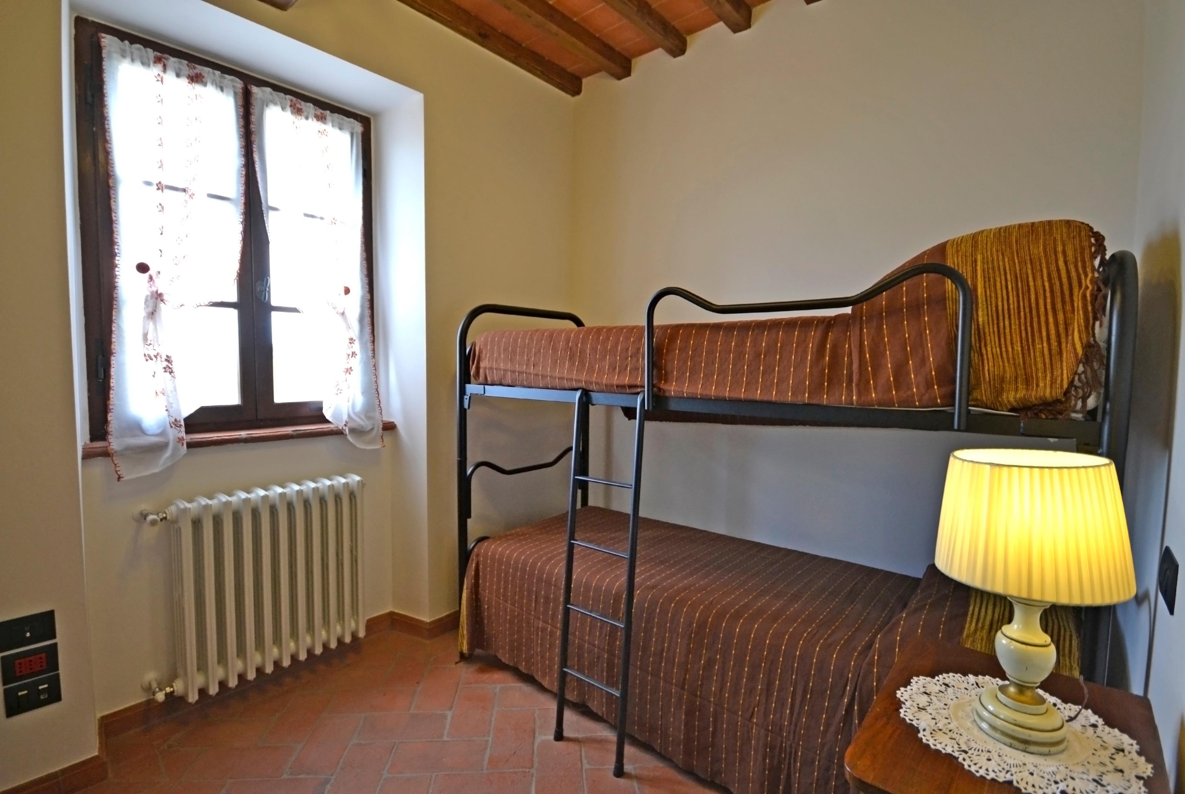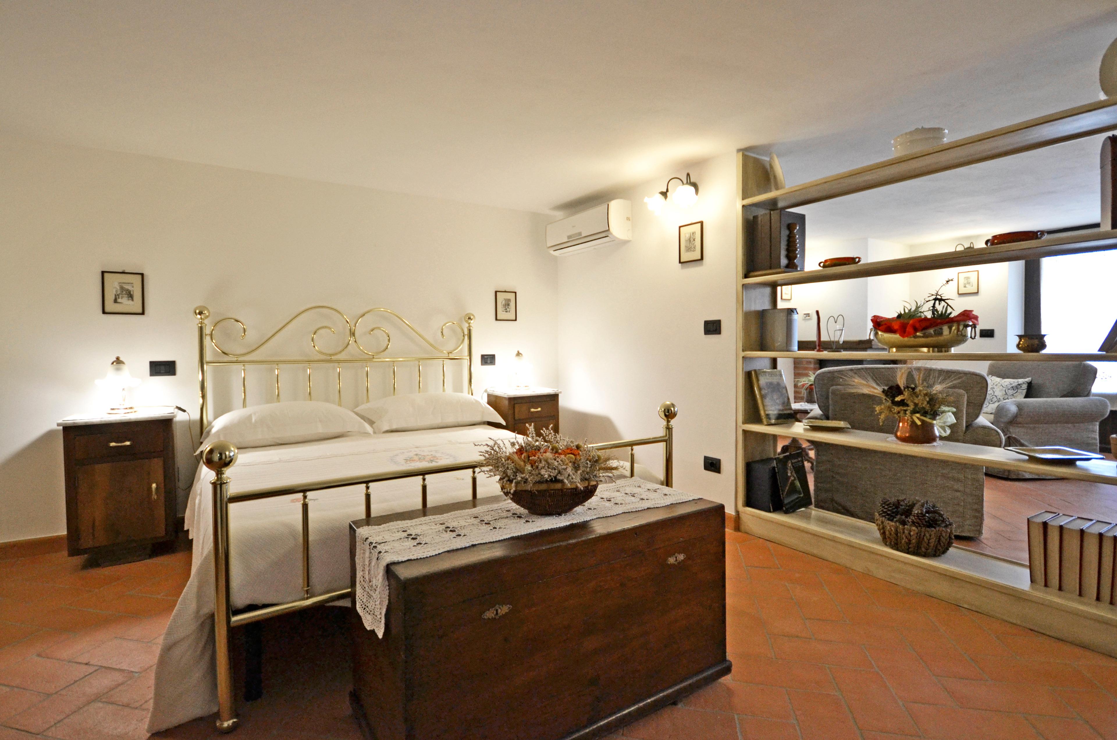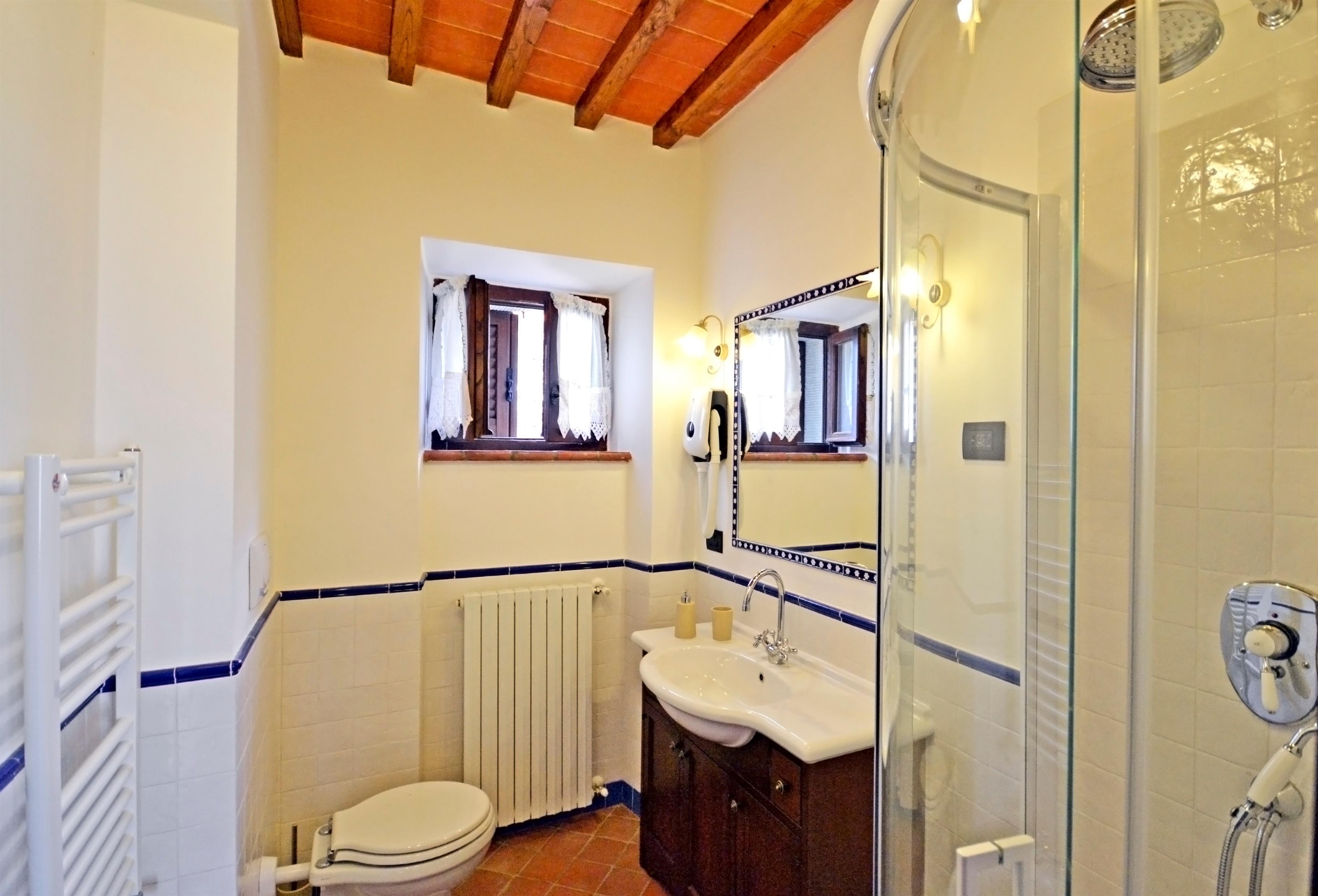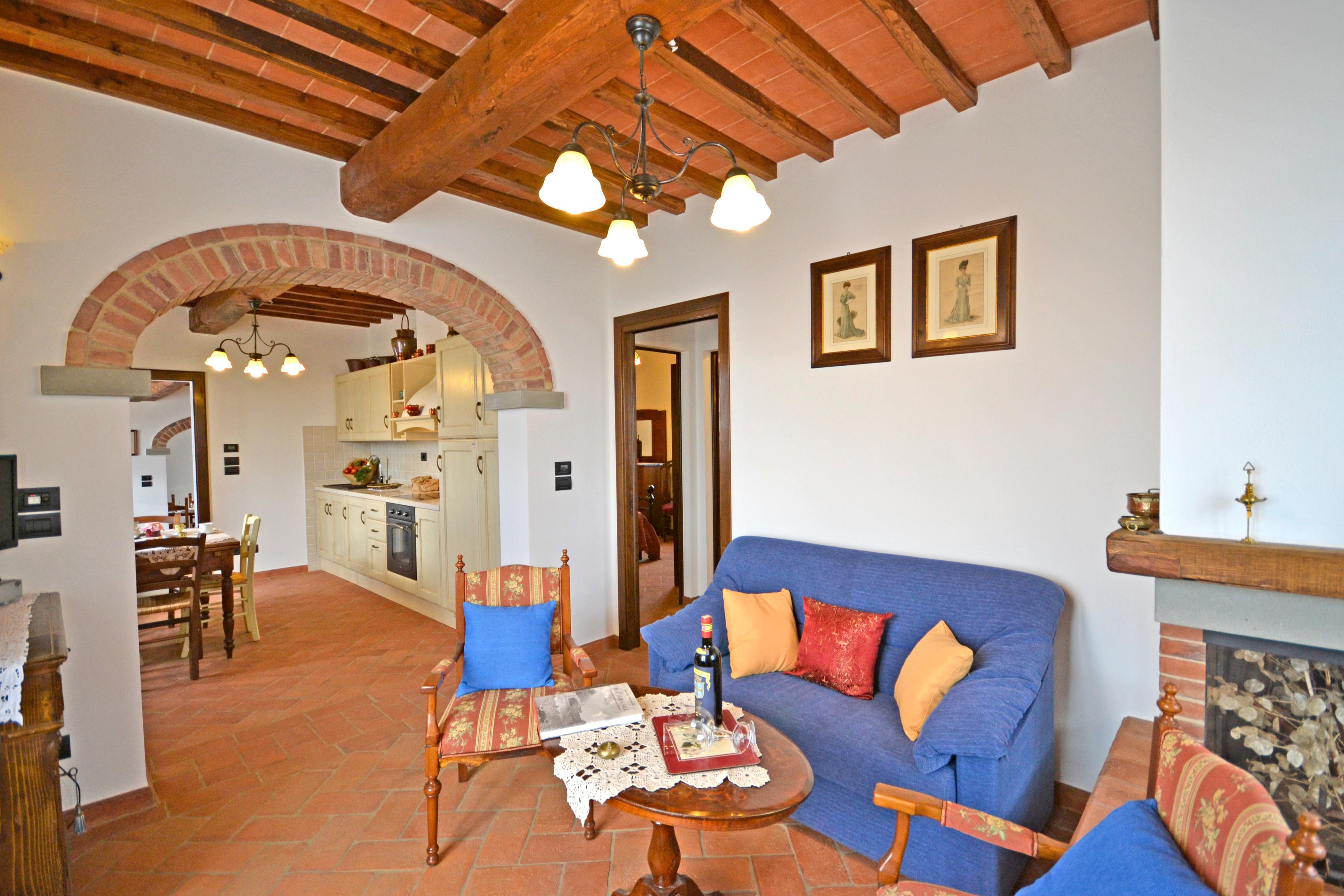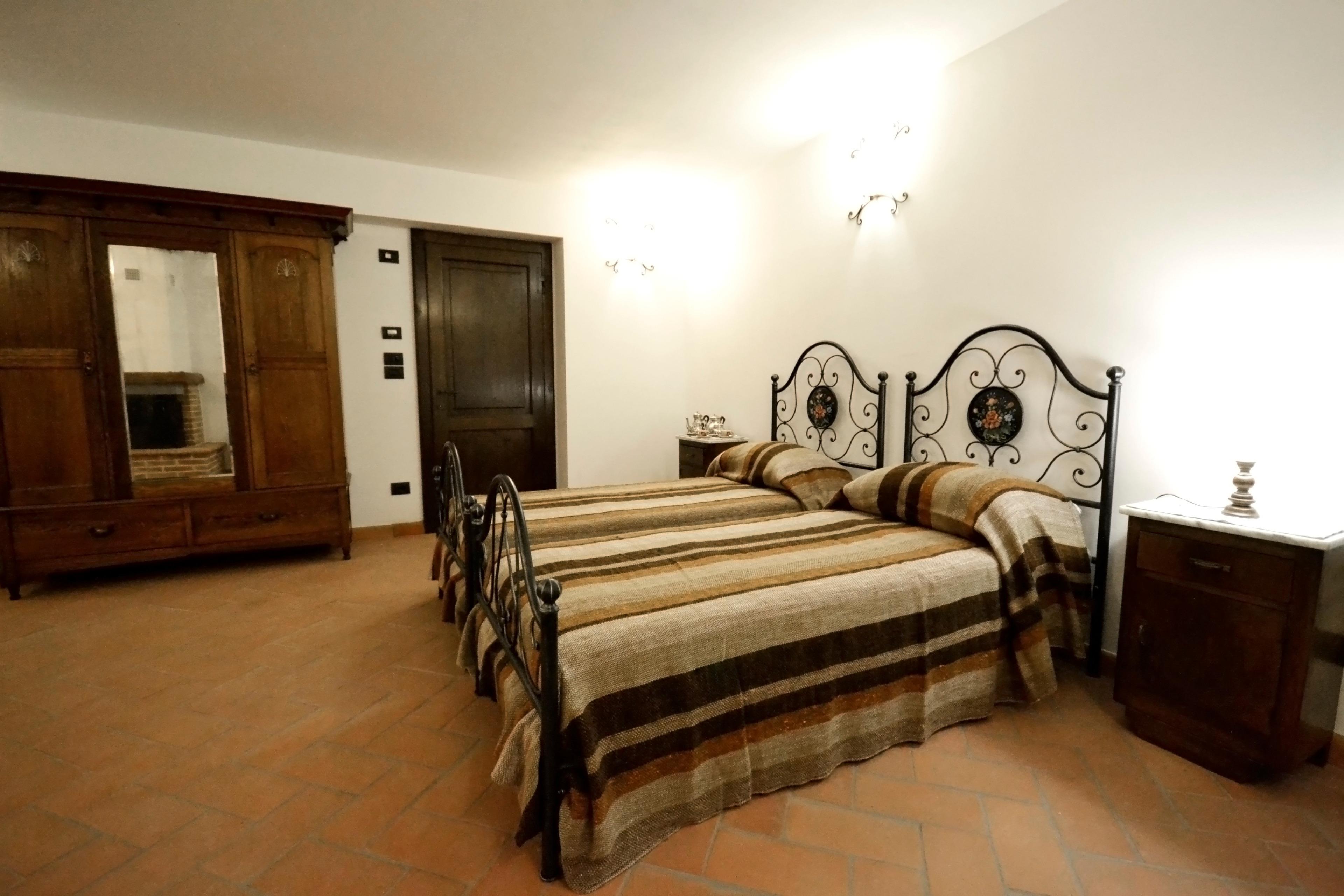 Die Innenräume von Villa Anita sind geräumig, hell und durch Decken mit freiliegenden Holzbalken und Terrakottaböden geprägt, die an den rustikalen toskanischen Stil erinnern, der auf der ganzen Welt berühmt ist. Die Villa erstreckt sich über drei Etagen und ist in drei Wohnungen aufgeteilt, die miteinander kommunizieren. Eine Eigenschaft, die es für große Gruppen ideal macht, alle zusammen zu sein und gleichzeitig die Privatsphäre zu wahren. Man kann das Erdgeschoss von drei verschiedenen Eingängen aus erreichen: der erste Eingang bietet Zugang zu einem Wohnzimmer mit Steinkamin, Sofa und Sat-TV, das zu einer voll ausgestatteten Küche und einem Esstisch sowie zu einem Einzelzimmer, einem Doppelzimmer und einem Schlafzimmer mit Badezimmer mit Dusche führt. Über den zweiten Eingang gelangen Sie in den größten Raum des Hauses, der mit einem Steinkamin und einem großen Esstisch ausgestattet ist. Von hier aus gelangt man über eine Steintreppe in den ersten Stock, wo sich ein Hauptschlafzimmer mit Bad mit Dusche und Badewanne befindet. Der Salon führt in eine zweite Küche, die ebenfalls komplett mit Esstisch und Sat-TV ausgestattet ist. Das Erdgeschoss wird durch zwei weitere Schlafzimmer ergänzt, ein Doppel- und ein Schlafzimmer mit Etagenbett und Badezimmer mit Dusche.