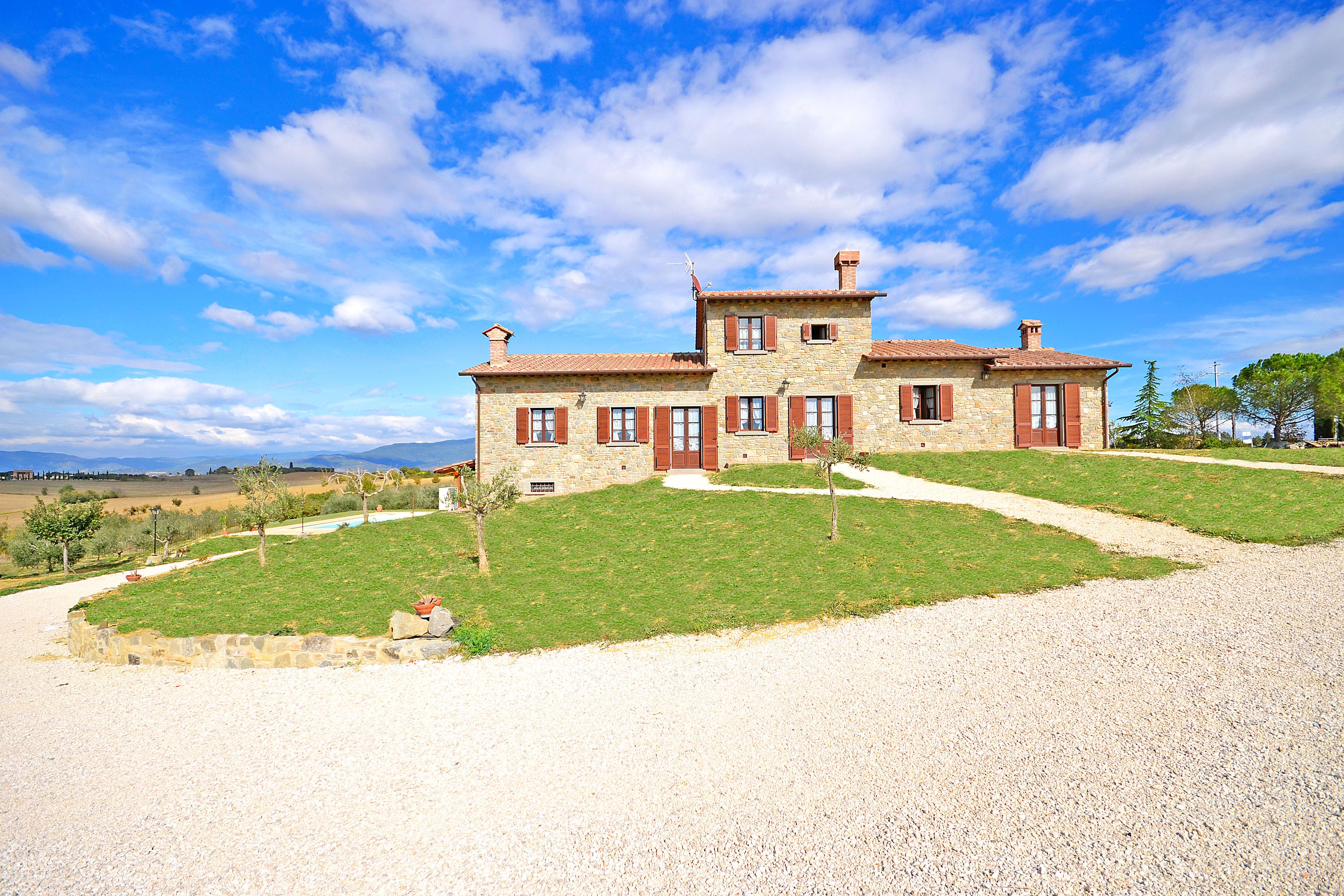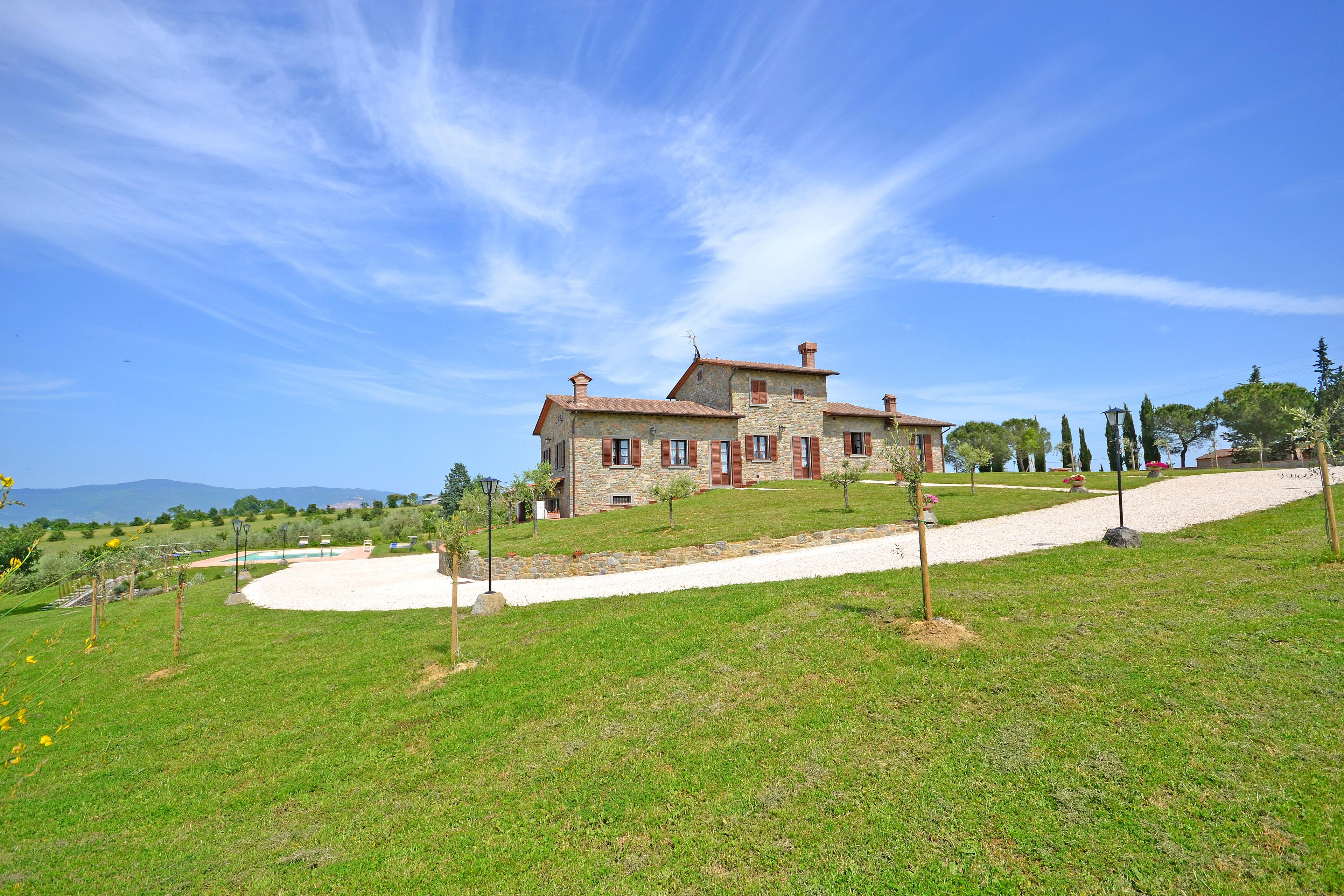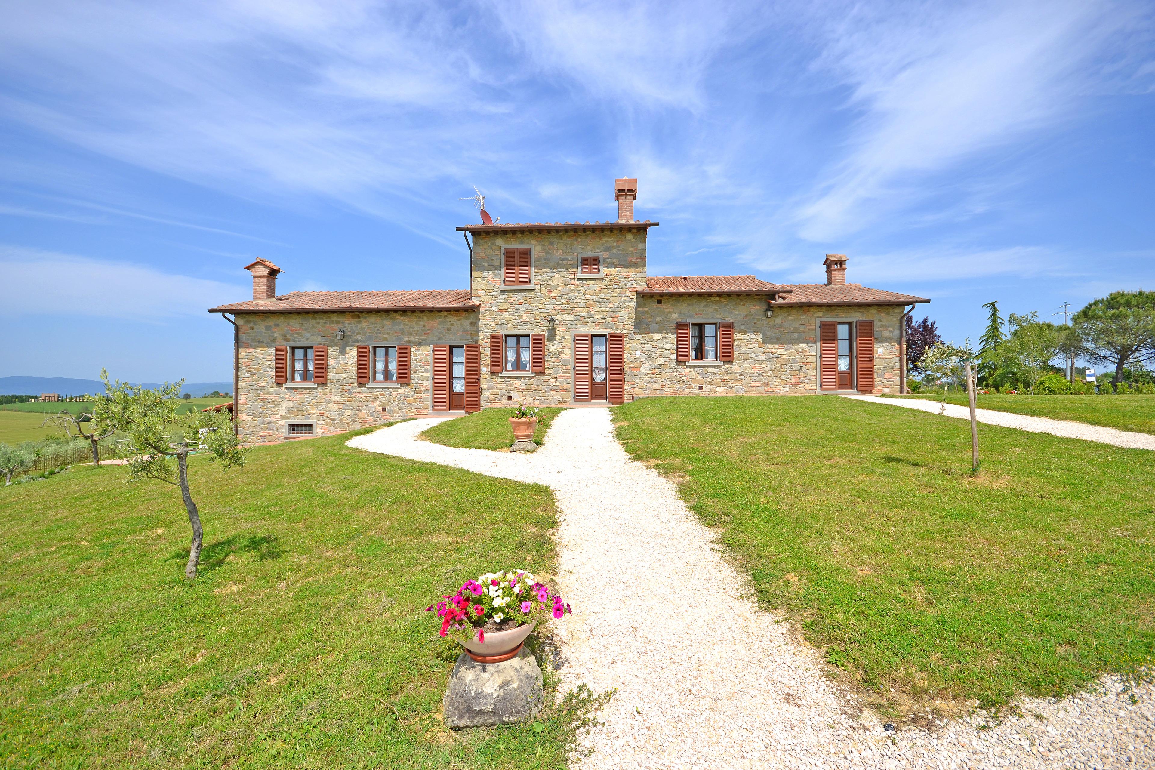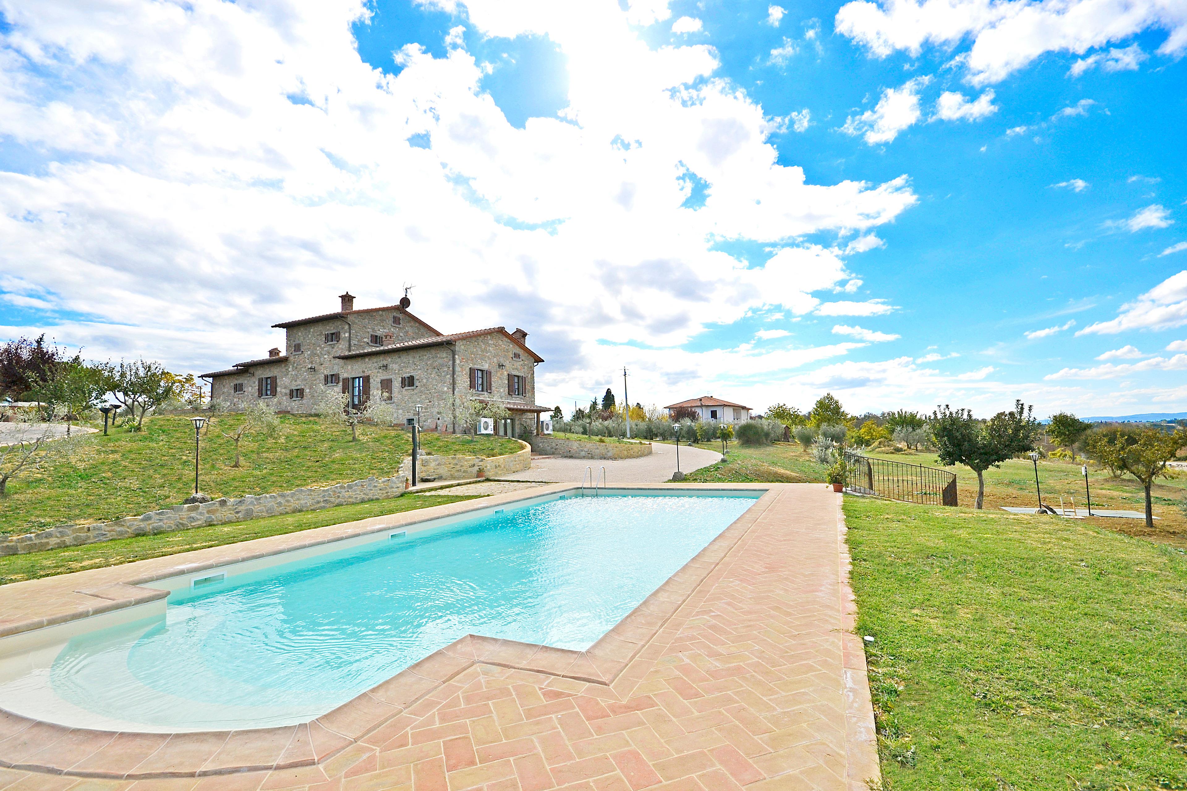 Die kürzlich renovierte Villa ist vollständig aus Stein gebaut und liegt in einem großen Garten voller Blumen und Pflanzen. Ihre Lage macht es zum idealen Ort, um die schönsten Städte der Toskana und Umbriens wie Cortona, Montepulciano, Montalcino, Perugia, Assisi, Pienza und viele weitere zu entdecken, alle in weniger als einer Autostunde. Der Garten ist privat und verfügt über ausreichend Parkplätze. Das schöne Schwimmbad (6 x 12 m, Mindesthöhe 1 m - Maximalhöhe 1,70 m, geöffnet von Mai bis September) befindet sich in Panoramalage und ist der Sonne gut ausgesetzt. Der Pool ist mit Massagedüsen ausgestattet und verfügt über Sonnenliegen, Stühle, Sonnenschirme und eine Solardusche. Vom Pool aus verliert sich der Blick auf die umliegende Landschaft, die Sie mit ihren Farben und Düften berauschen wird und unvergessliche Sonnenuntergänge verspricht.