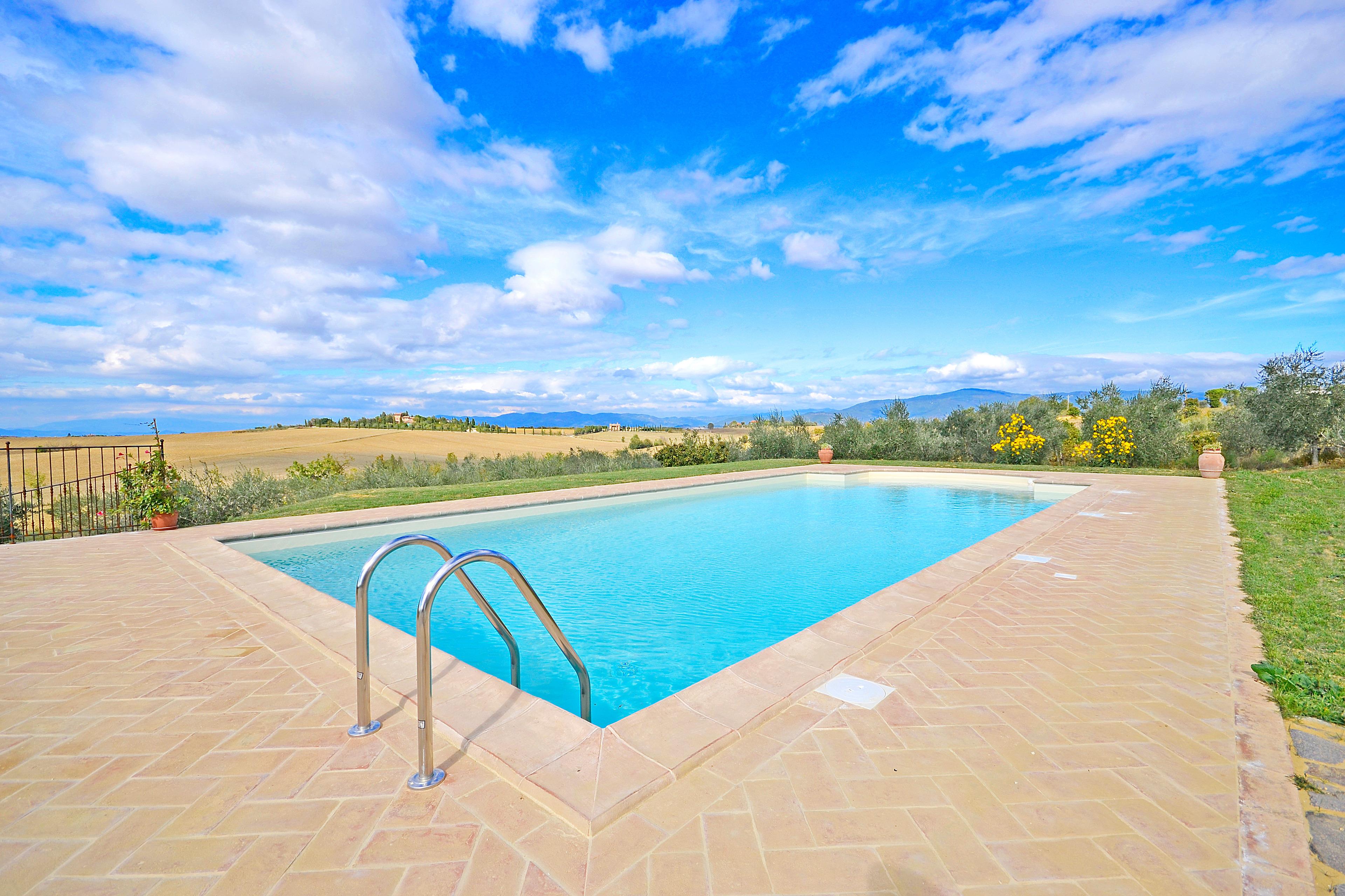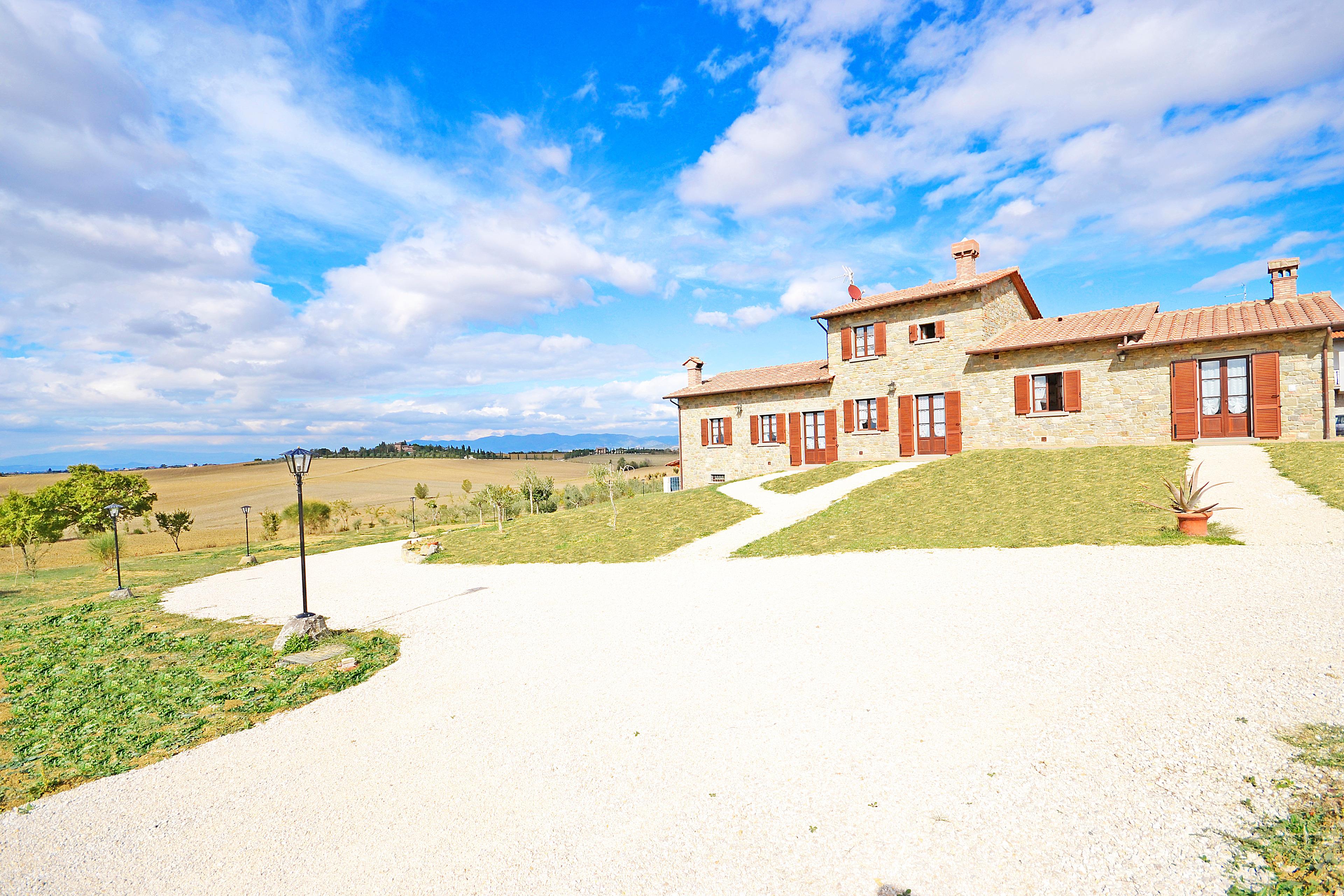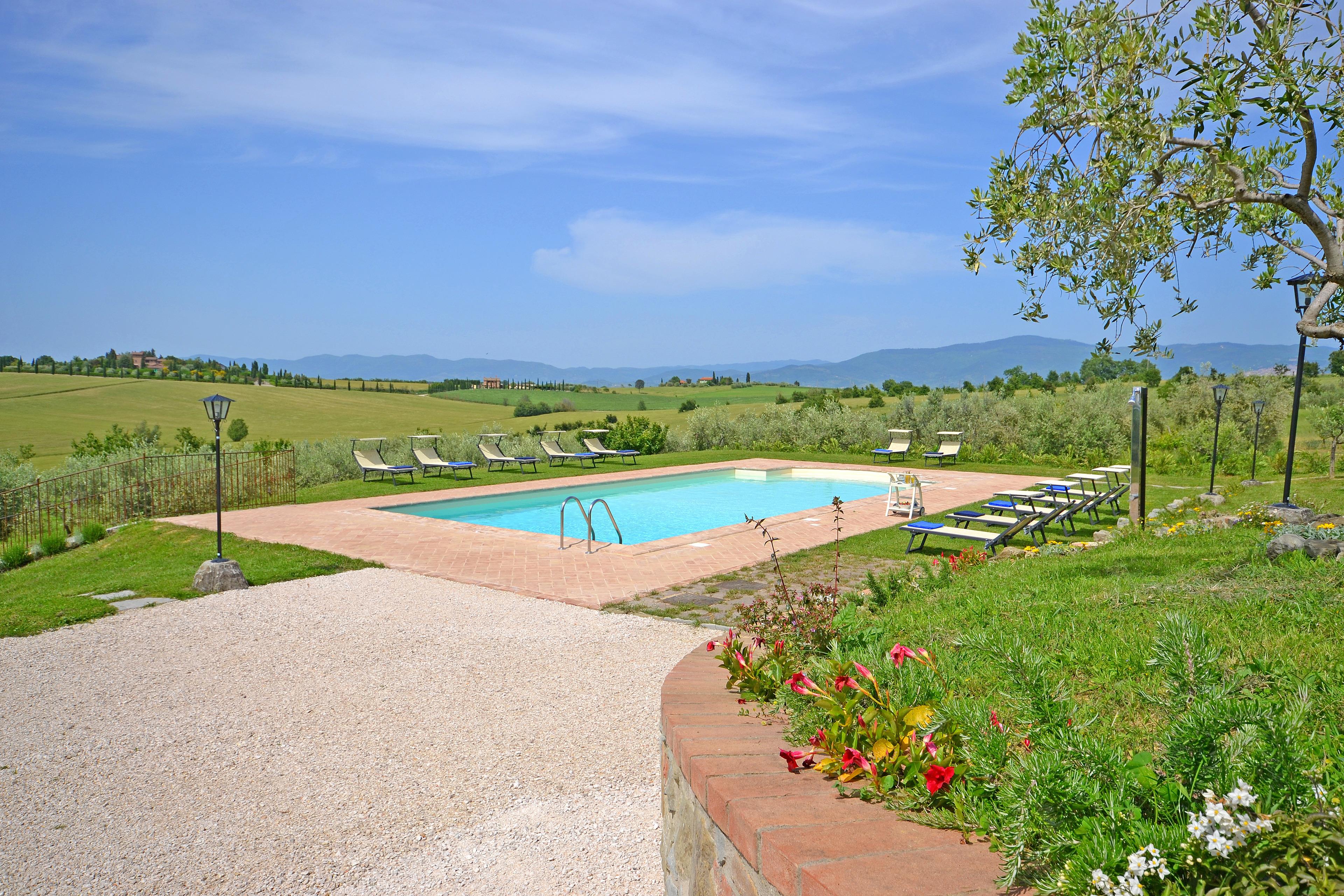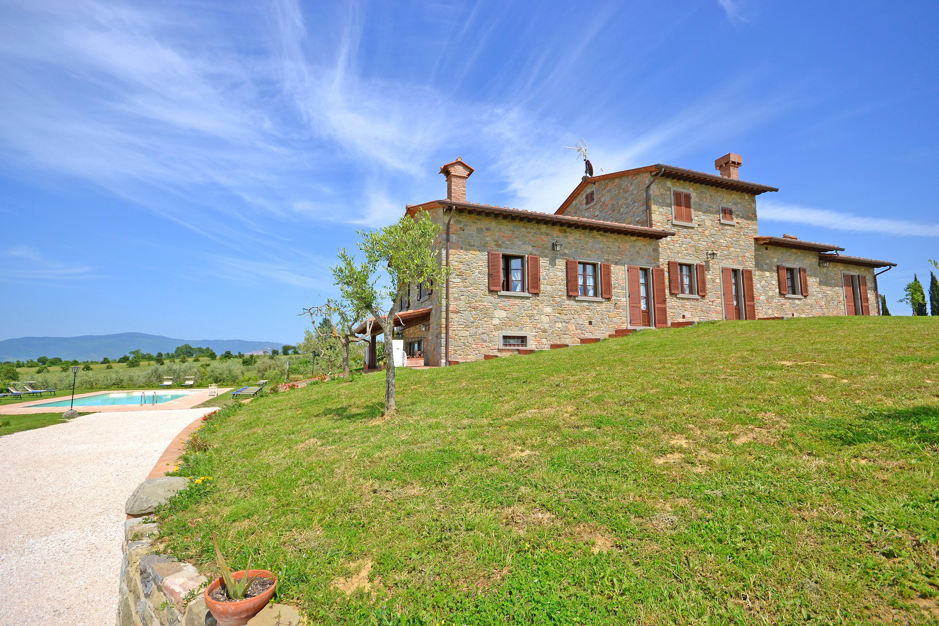 Die kürzlich renovierte Villa ist vollständig aus Stein gebaut und liegt in einem großen Garten voller Blumen und Pflanzen. Ihre Lage macht es zum idealen Ort, um die schönsten Städte der Toskana und Umbriens wie Cortona, Montepulciano, Montalcino, Perugia, Assisi, Pienza und viele weitere zu entdecken, alle in weniger als einer Autostunde. Der Garten ist privat und verfügt über ausreichend Parkplätze. Das schöne Schwimmbad (6 x 12 m, Mindesthöhe 1 m - Maximalhöhe 1,70 m, geöffnet von Mai bis September) befindet sich in Panoramalage und ist der Sonne gut ausgesetzt. Der Pool ist mit Massagedüsen ausgestattet und verfügt über Sonnenliegen, Stühle, Sonnenschirme und eine Solardusche. Vom Pool aus verliert sich der Blick auf die umliegende Landschaft, die Sie mit ihren Farben und Düften berauschen wird und unvergessliche Sonnenuntergänge verspricht.
