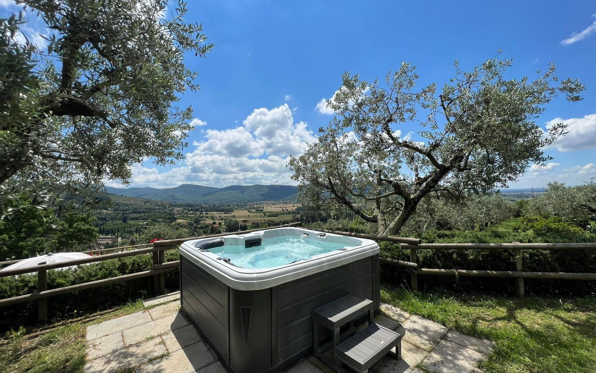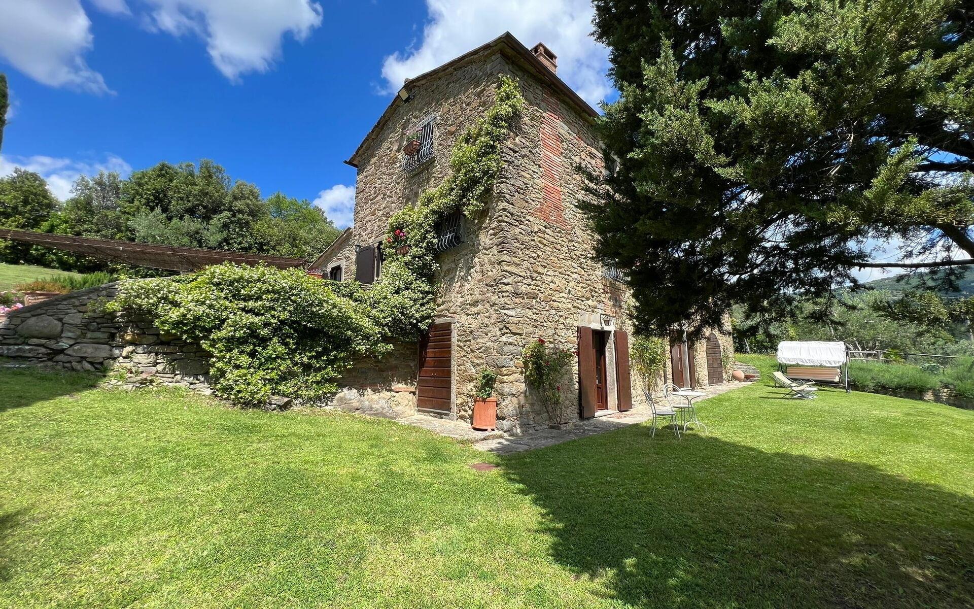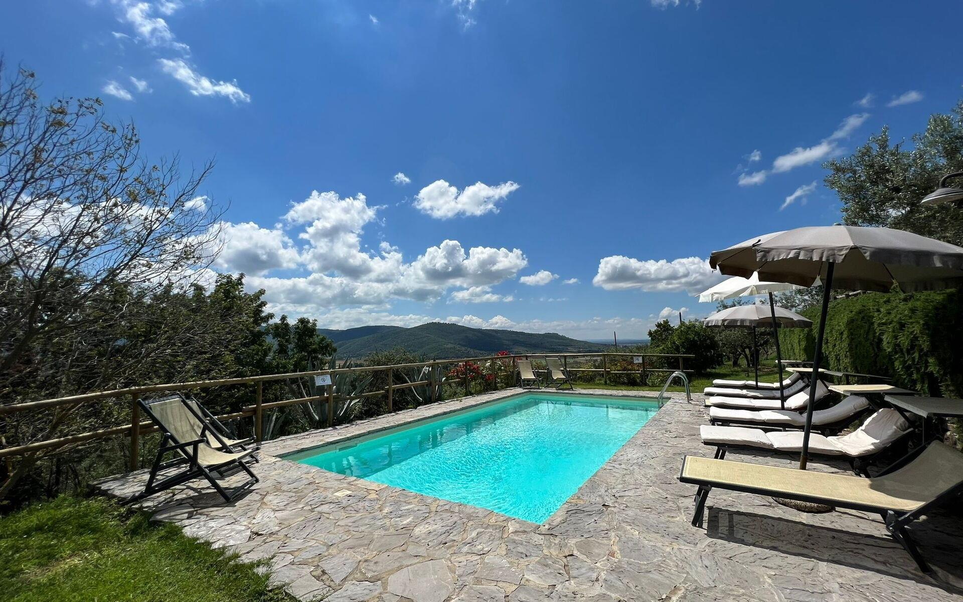 Die Villa ist komplett eingezäunt mit Zugang über ein automatisches Tor. Zwei große Zypressen prägen die Hauptfassade, hier kann der Reisende die toskanische Atmosphäre auf sich wirken lassen. Der Garten erstreckt sich über eine Fläche von 5000 Metern und folgt den Konturen des Hügels. Unter der Terrasse vor der Küche befindet sich ein gepflasterter Essbereich mit Grill, Tisch und Stühlen, der sich ideal für Mahlzeiten im Freien eignet. Rund um das Haus gibt es mehrere Lese- und Entspannungsbereiche, um Ihren Aufenthalt zu genießen. Der Bereich, in dem sich der Pool befindet, ist auf verschiedenen Ebenen angeordnet und von Olivenbäumen umgeben. Auf der unteren Ebene befindet sich der Pool (4x8 mit einer maximalen Tiefe von 2 Metern und einer Mindesttiefe von 1,20 Metern, Öffnungszeit 1. Mai - 30. September), eine Sonnenterrasse mit Liegestühlen und Sonnenliegen, eine Dusche und ein Pavillon, die es Ihnen ermöglichen, den Poolbereich auch in den heißesten Stunden des Tages zu genießen. Der Jacuzzi befindet sich auf der oberen Ebene, umgeben von zwei alten Olivenbäumen. Den Gästen steht kostenloses Wifi im Außen- und Innenbereich der Villa zur Verfügung, ein großer Parkplatz.