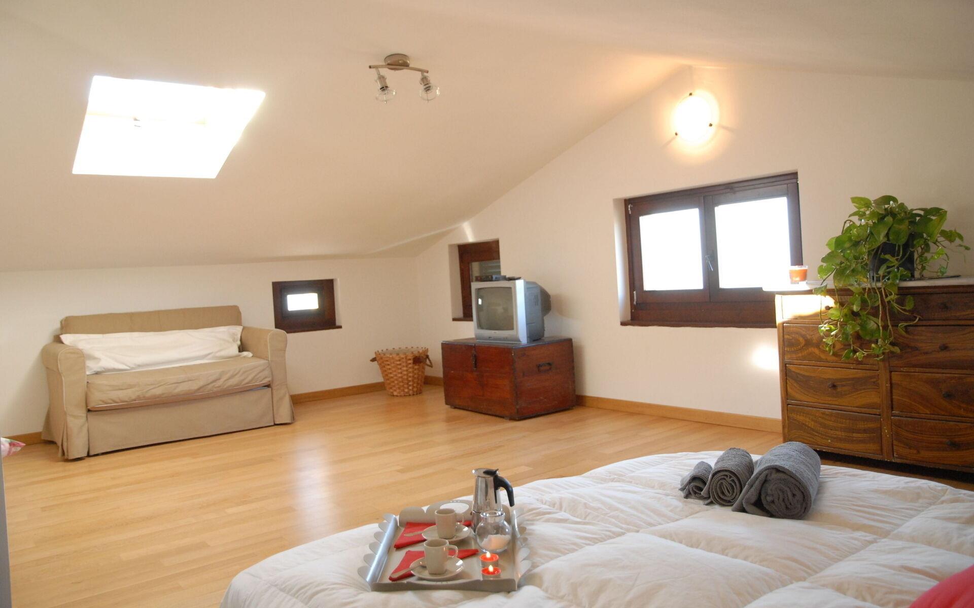 Über eine Innentreppe erreicht man den letzten Raum, einen großen Dachboden mit einem Doppelbett und einem Doppelschlafsofa (auf Anfrage und gegen Aufpreis). Das Badezimmer ist en-suite und hat eine Dusche.