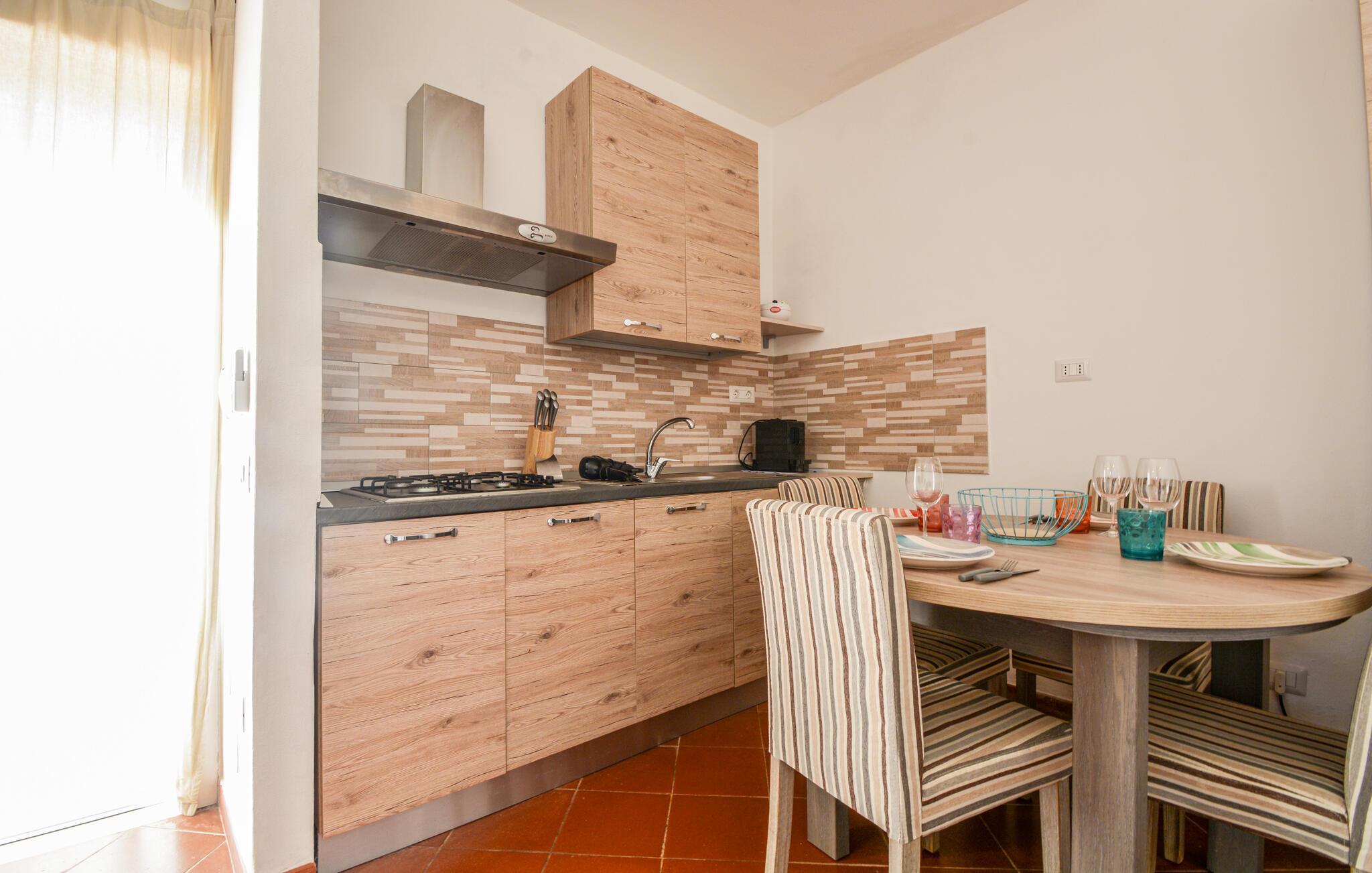 Denne ferielejlighed tilbyder moderne komfort i rolige omgivelser med en fantastisk udsigt over det omkringliggende landskab. Den smagfulde opholdsstue kombinerer et åbent tekøkken med spiseplads og et komfortabelt siddeområde med sofa og tv. De varme træmøbler skaber en indbydende atmosfære.