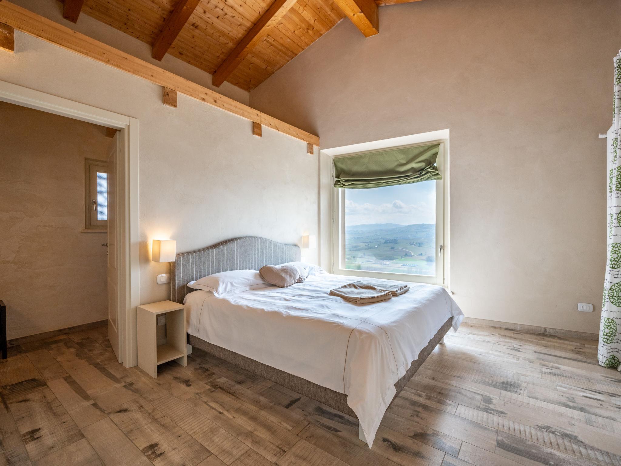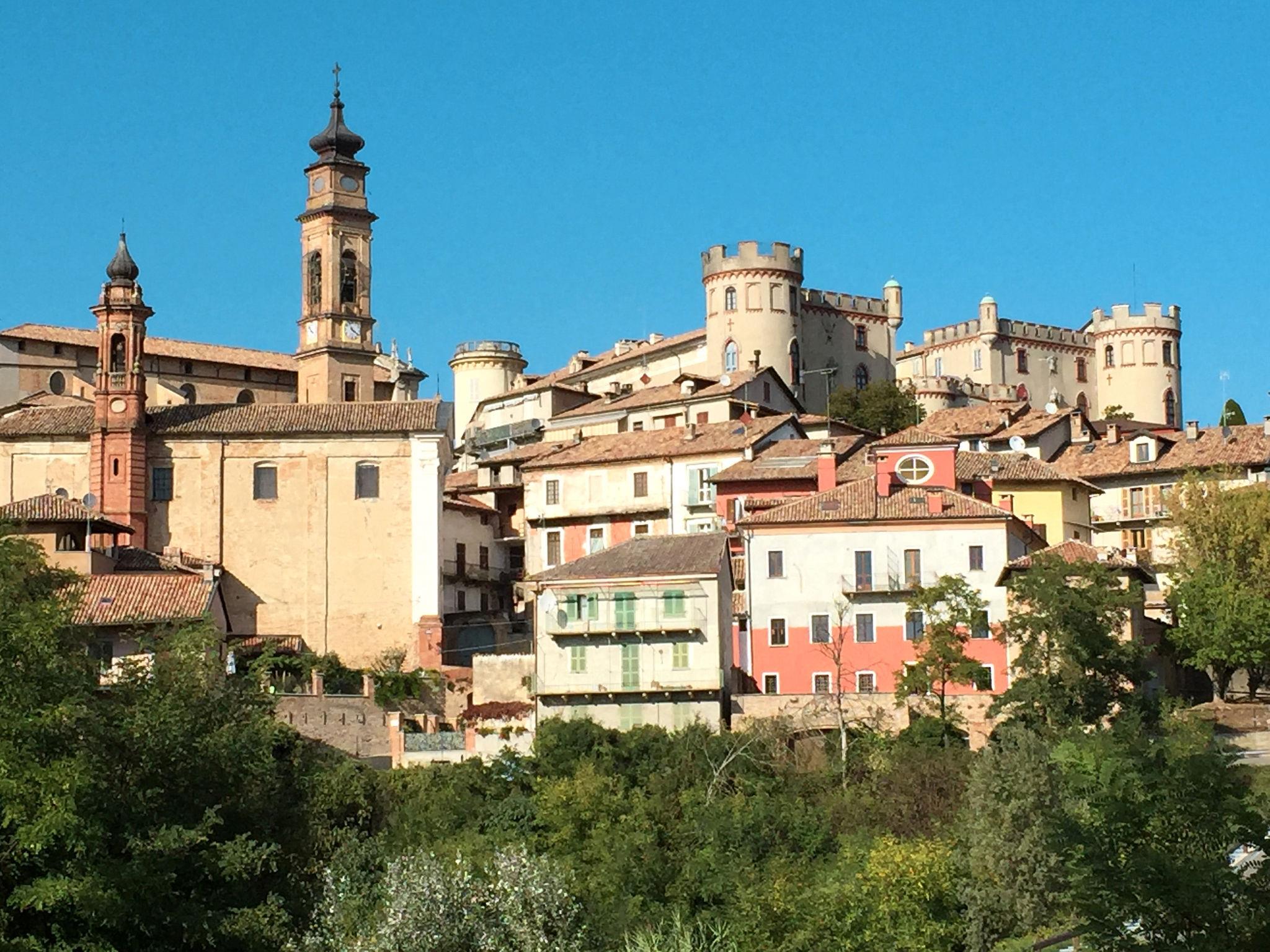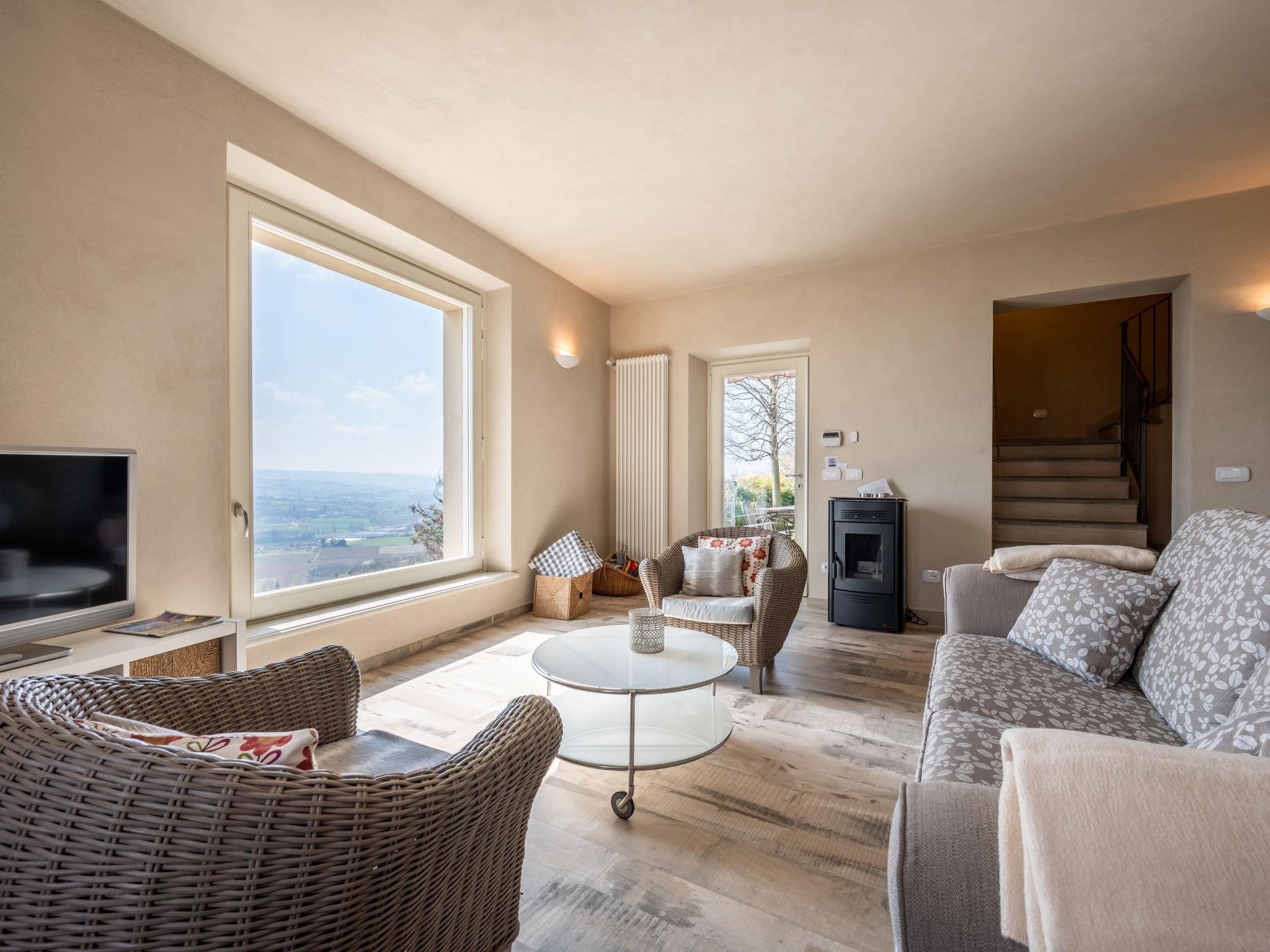 "Cascina Vigne", 3-room semi-detached house 95 m2 on 2 levels. Comfortable and modern furnishings: living/sleeping room with 1 sofabed, Scandinavian wood stove, dining table, satellite TV and hi-fi system. Exit to the terrace. Open kitchen (dishwasher, 4 induction hot plates, toaster, kettle, freezer, electric coffee machine). Sep. WC. Upper floor: 2 rooms, each room with 1 double bed (180 cm, length 200 cm), shower/WC. Exit to the balcony. Heating, air-conditioning. Natural stone floors. Balcony, 2 terraces partly roofed, garden, lawn. Terrace furniture, balcony furniture, barbecue (portable). Very beautiful panoramic view of the countryside and the town. Facilities: iron, mosquito net, children's high chair, baby cot. Internet (WiFi, free). Please note: non-smokers only. Private entrance. The sofa bed is suitable for one person up to 14 years of age. Bedlinen, towels, final cleaning and all energy costs are included. IT005050B4F3ON9SBR