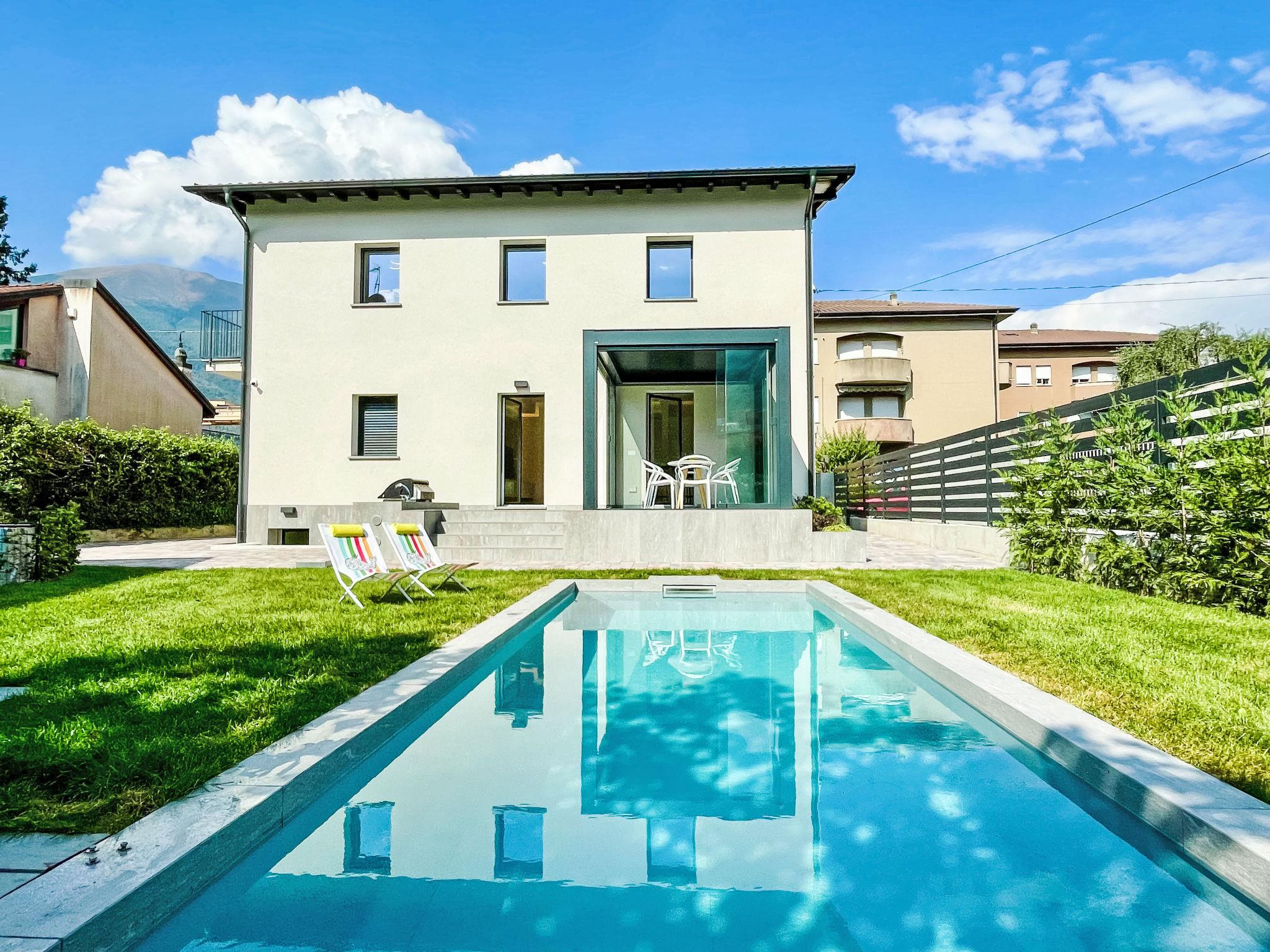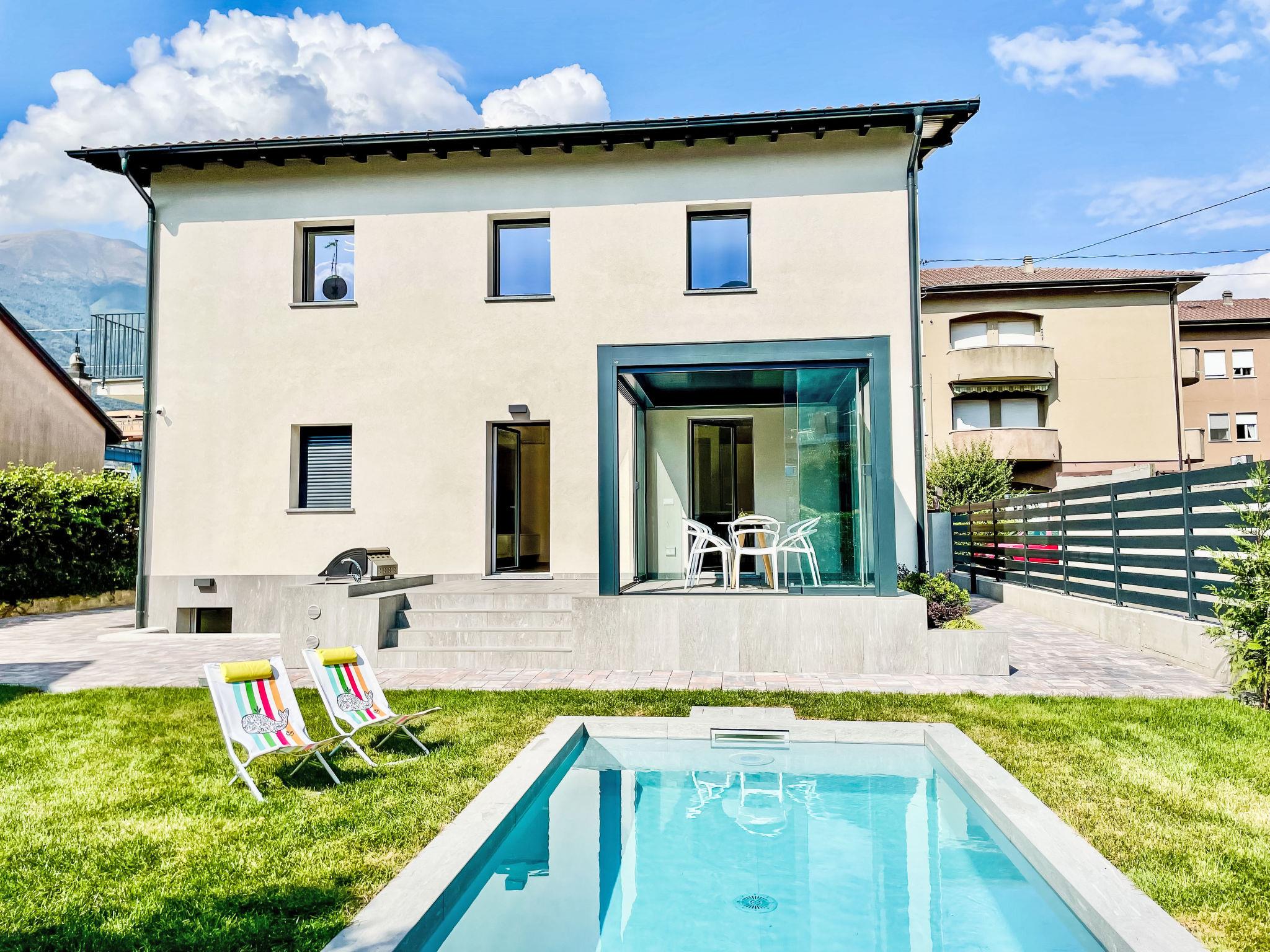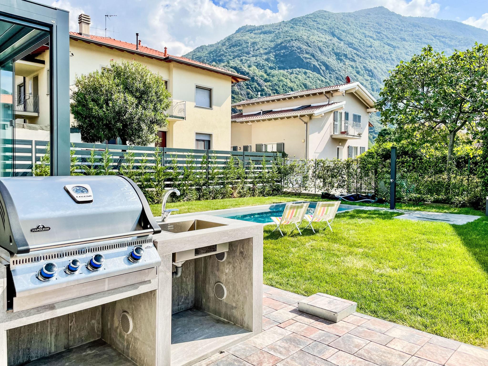 Large, modern, comfortable house "Allegra", 2 storeys. 2 apartments in the property. In the resort Dervio, 10 km from the centre of Colico, 30 km from the centre of Lecco, in the residential district, 150 m from the lake. Private: property 400 m2 (fenced) with lawn and wildlife garden, swimming pool angular, heated (7 x 3 m, depth 130 cm, seasonal availability: 01.Apr. - 30.Oct.) with salt water and salt-electrolysis pool-cleaning system. Outdoor shower, pool maintenance by the owner/gardener. Linen change (suppl. charge extra). Towel change (suppl. charge extra). Room cleaning on request (extra). Parking on the premises. Shop 700 m, supermarket 800 m, restaurant 250 m, bar 350 m, bus stop 600 m, pebble beach "Dervio" 200 m. Sports harbour, surf school 200 m, children's playground 600 m. Nearby attractions: Torre di Orezia, Corenno Plinio, Orrido di Bellano. Well-known lakes can easily be reached: Lago di Mezzola. Hiking paths: Valvarrone, Sentiero del Viandante, Monte Basso di Dervio. Please note: no lift. Baby equipment on request (extra). Groups of teenagers on request only. The owner does not accept any youth groups.