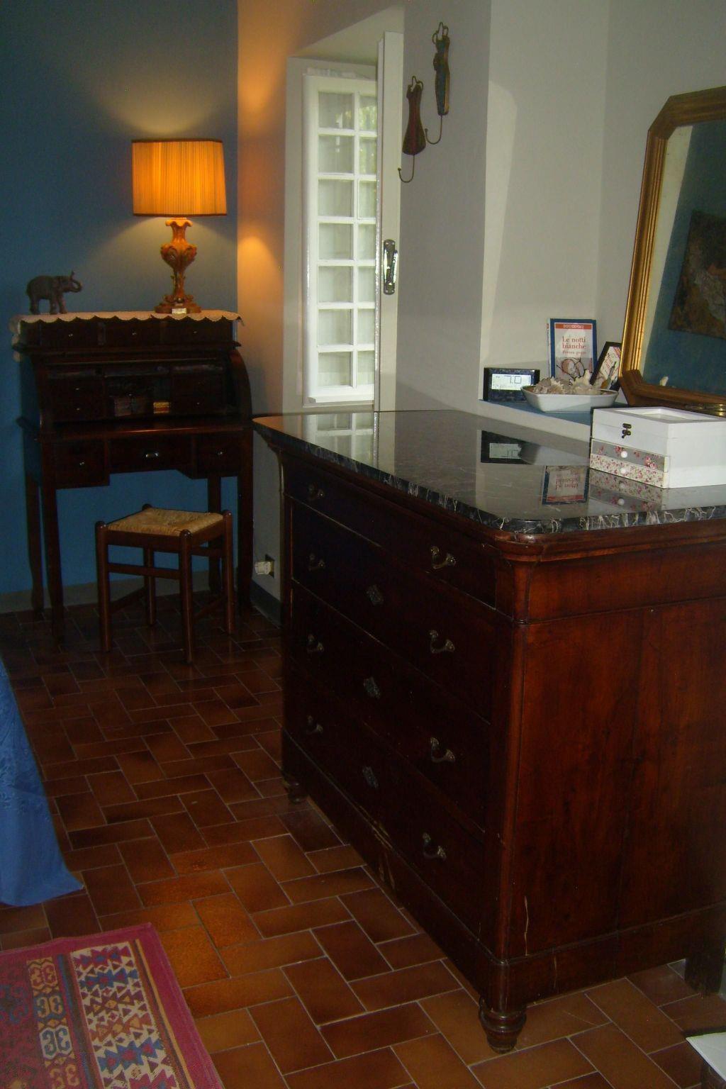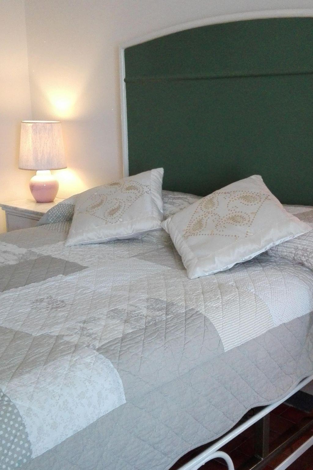 The living space (approx. 110 m²) is on two levels. On the ground floor there is a kitchen-dining room and a living room with a fireplace, sofa and Smart TV. The living room is furnished with a large marble table and 6 chairs. The kitchen is equipped with a gas cooker, oven, coffee machine, toaster, kettle and refrigerator with freezer. In the pantry you will find something to eat for the first day (e.g. rusks, homemade jam, milk, tea and coffee, but also pasta, tomato puree, olive oil, tuna, breadsticks). Air conditioning units are installed in every room. On the first floor there are: the Green room with a double bed (160 x 200 cm), the Blue room with a double bed (180 x 200 cm) and a bathroom with shower. The house is fully heated. Wireless Internet access (WLAN, free of charge) is available.