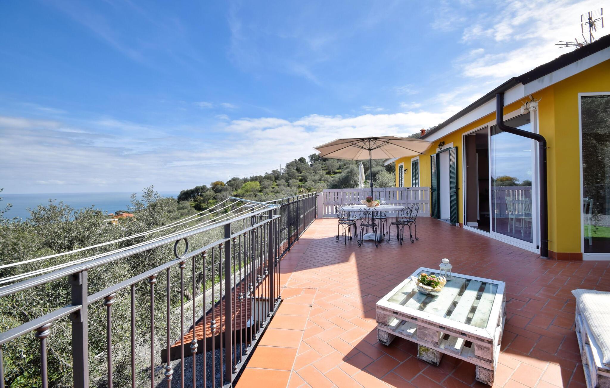 Udnyt den storslåede udsigt fra terrassen fuldt ud og lad blikket vandre over det omkringliggende landskab og ud på havet.