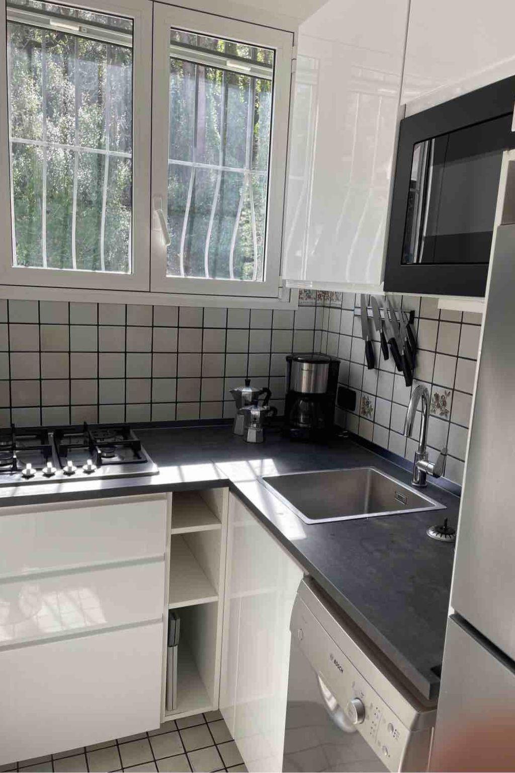 The entrance door leads directly to the living room, which has a large French window giving access to the sun terrace. The living room is furnished with a sofa bed for two persons (160x180cm) and a table with chairs. A small hallway leads to the bedroom with a double bed (180x190cm), the bathroom with shower and bidet and the small kitchen with dishwasher, five-burner gas hob and a large refrigerator.
