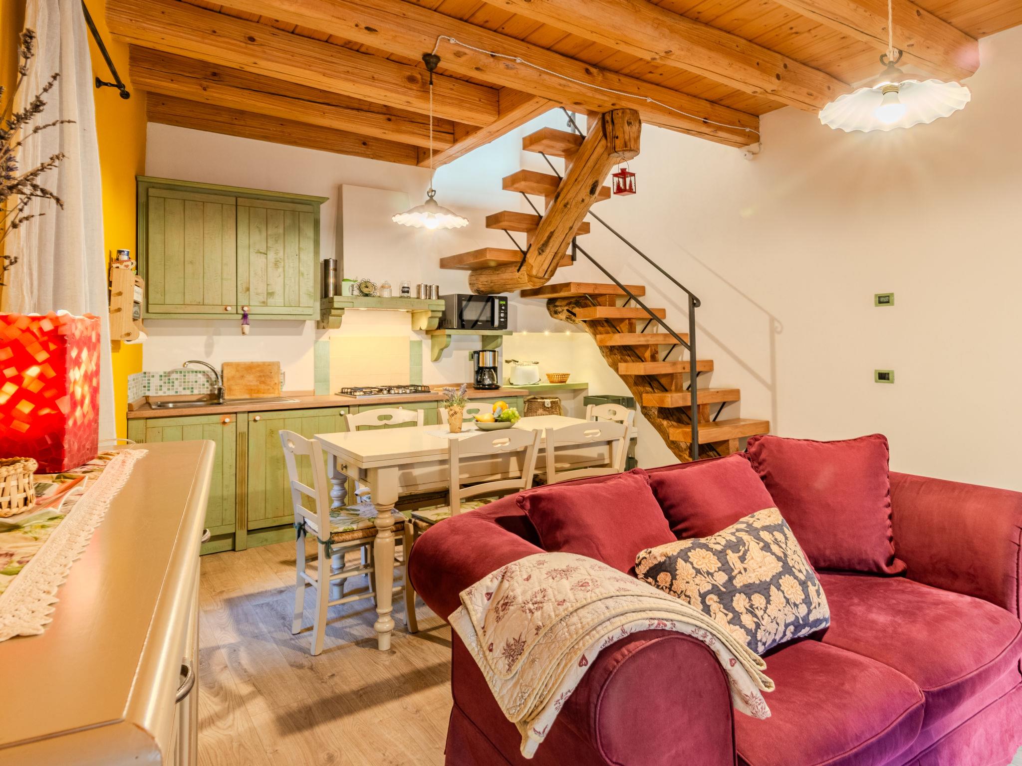 3-room house 60 m2 on 2 levels. Comfortable and cosy furnishings: living/dining room with satellite TV. Exit to the terrace. Open kitchen (oven, dishwasher, 4 gas rings, toaster, kettle, electric coffee machine) with dining table. On the lower ground floor: (exterior staircase), 1 room with 2 beds and shower/WC. Upper floor: 1 room with 1 double bed and 2 folding beds. Shower/bidet/WC. Forced-air heating. Heating available only from 15.10. to 15.04. Terrace. Terrace furniture, deck chairs (2). Marvellous view of the lake and the countryside. Facilities: washing machine, hair dryer. Internet (WiFi, free). Please note: non-smoking house. Smoke alarm, fire extinguisher, no lift. IT013089C22EJBS3FJ
