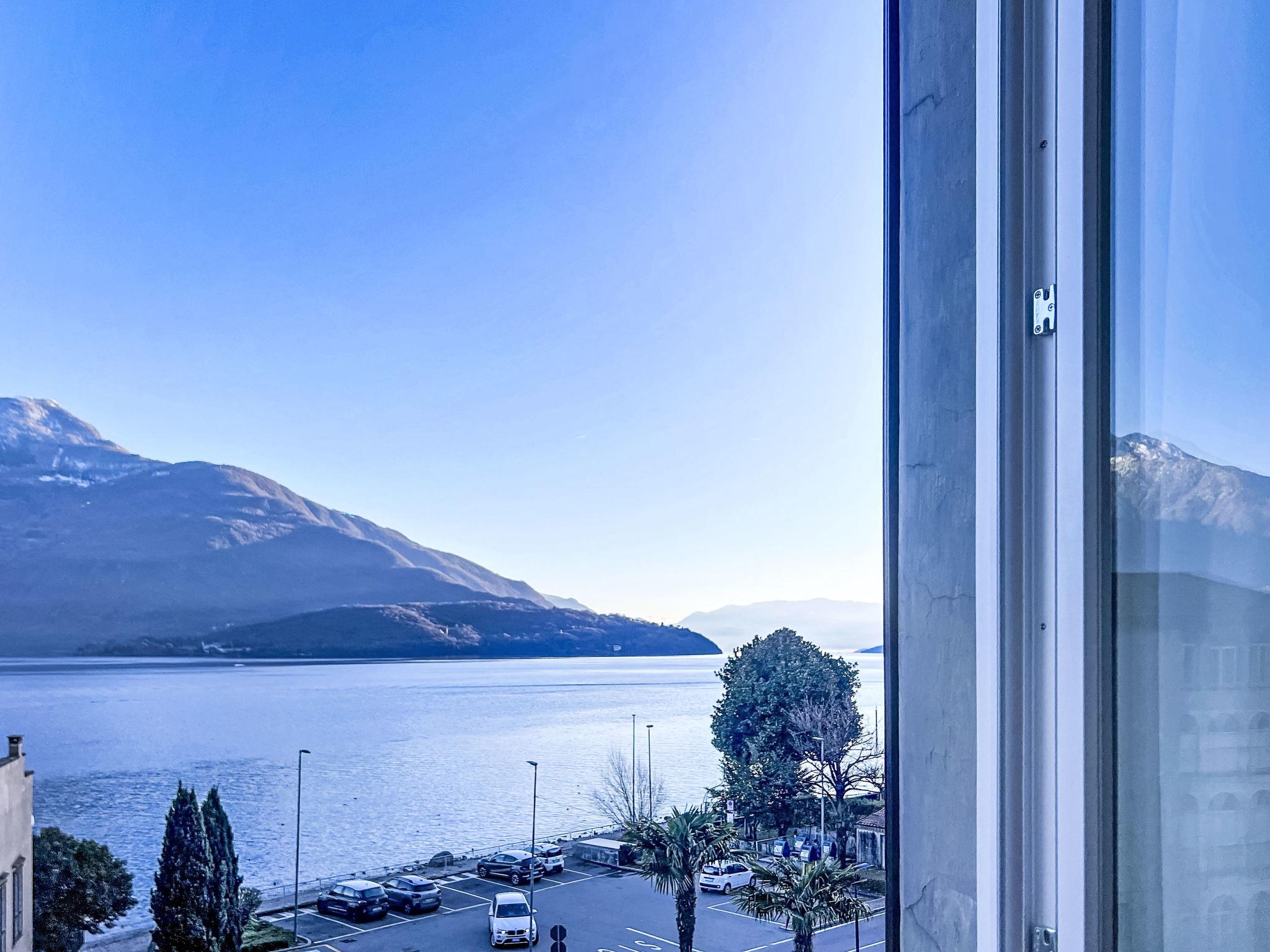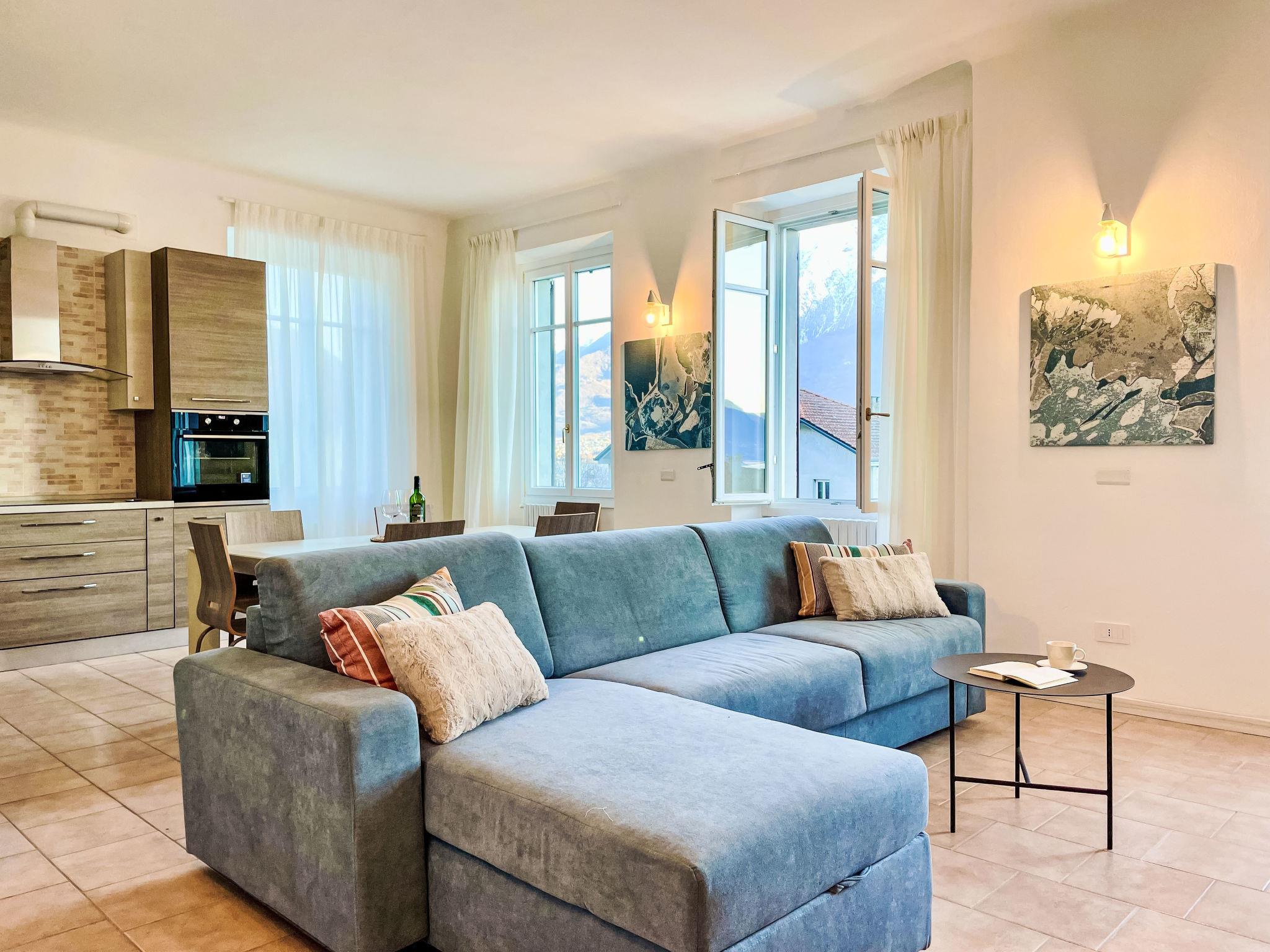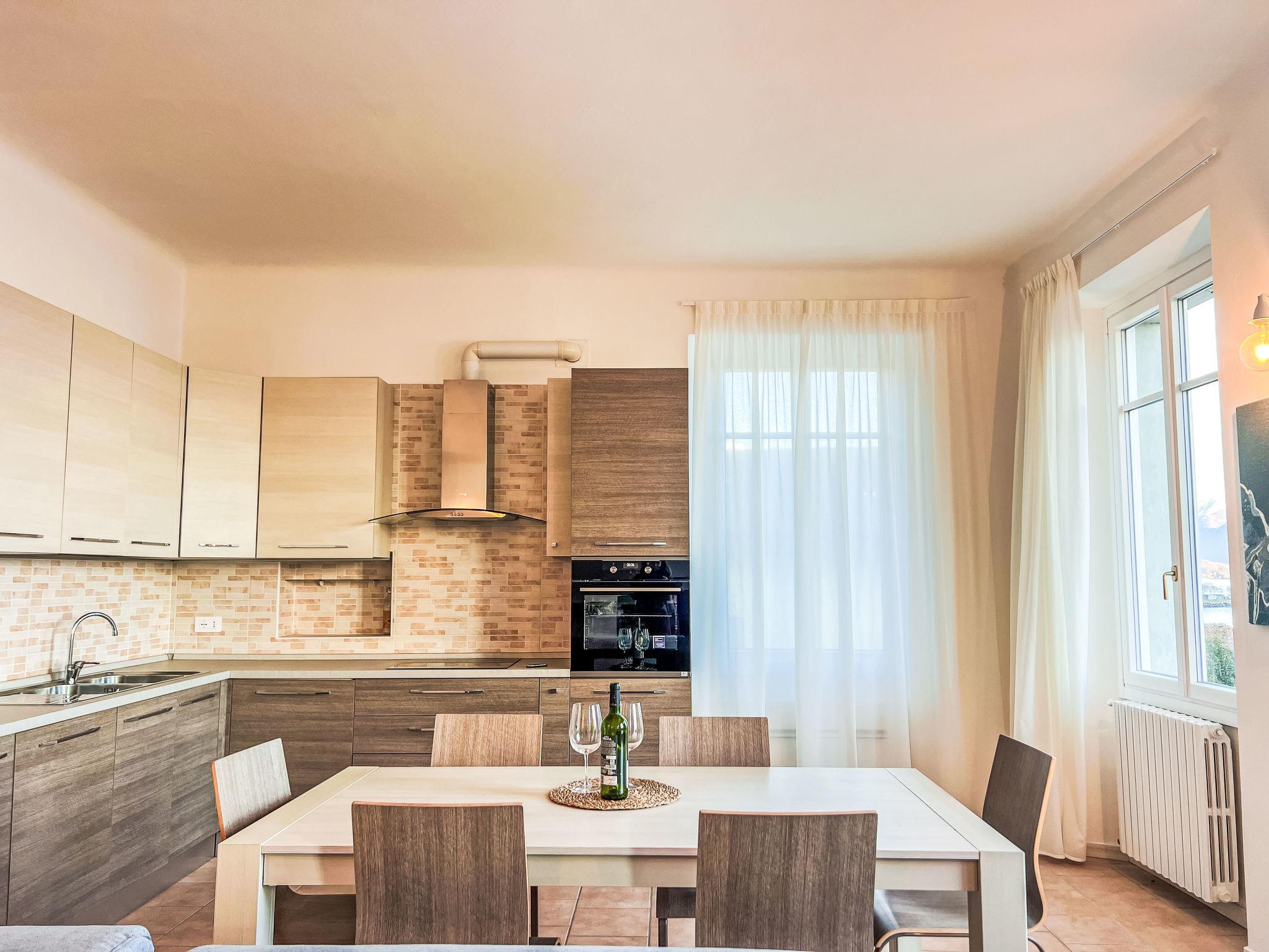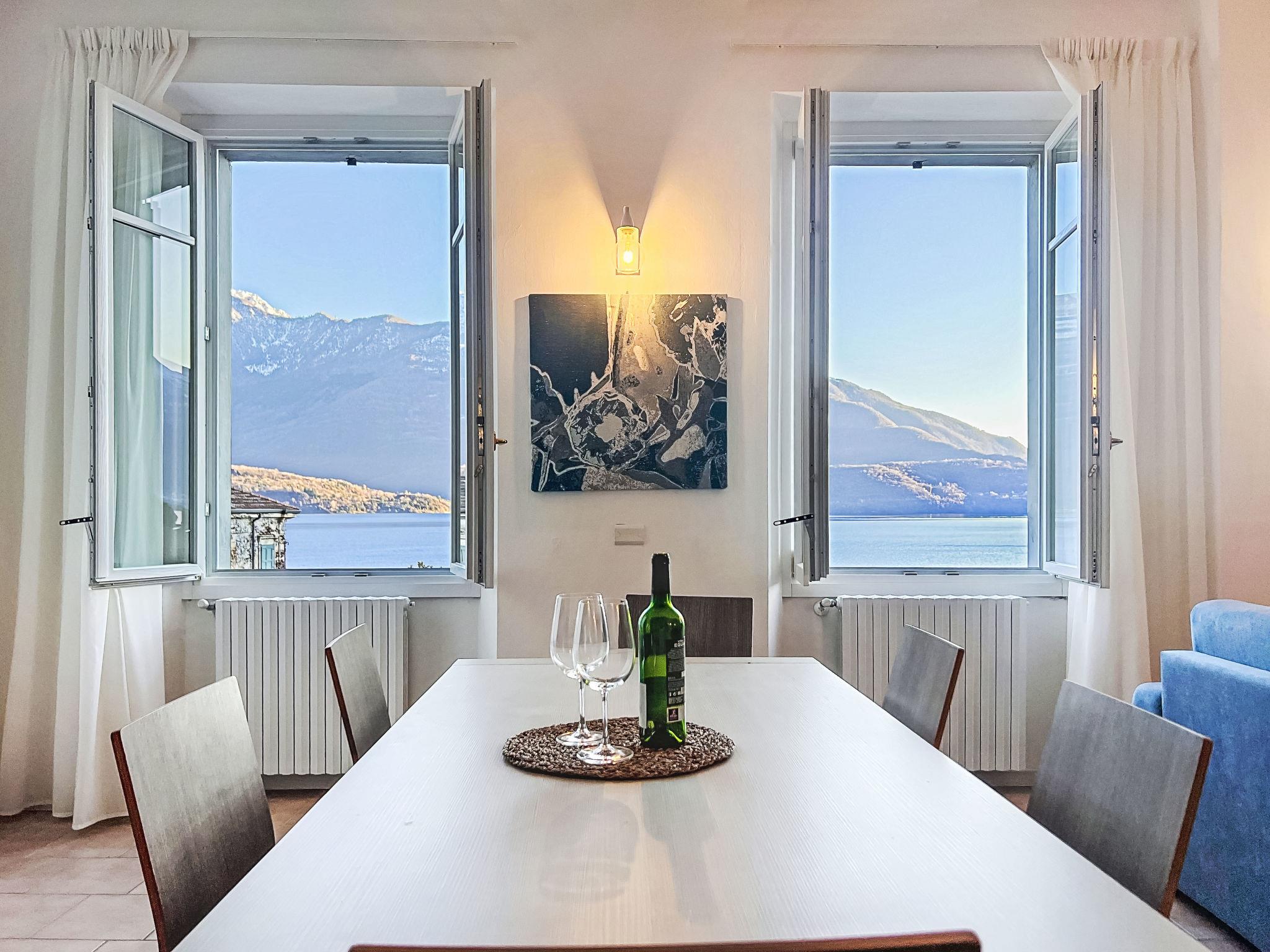 "Second Floor", 3-room apartment 100 m2 on 2nd floor. Comfortable furnishings: open large living/sleeping room with 1 double bed, dining table and TV. 1 room with 1 double bed and TV. 1 room with 2 beds. Open kitchen (oven, dishwasher, 4 induction hot plates, toaster, electric coffee machine). Shower/bidet/WC. Gas heating, air-conditioning. Very beautiful view of the lake and the mountains. Facilities: children's high chair, baby cot for up to 2 year olds, hair dryer. Internet (WiFi, free). Please note: non-smokers only. Fire extinguisher. IT013089B4UXN89OC4