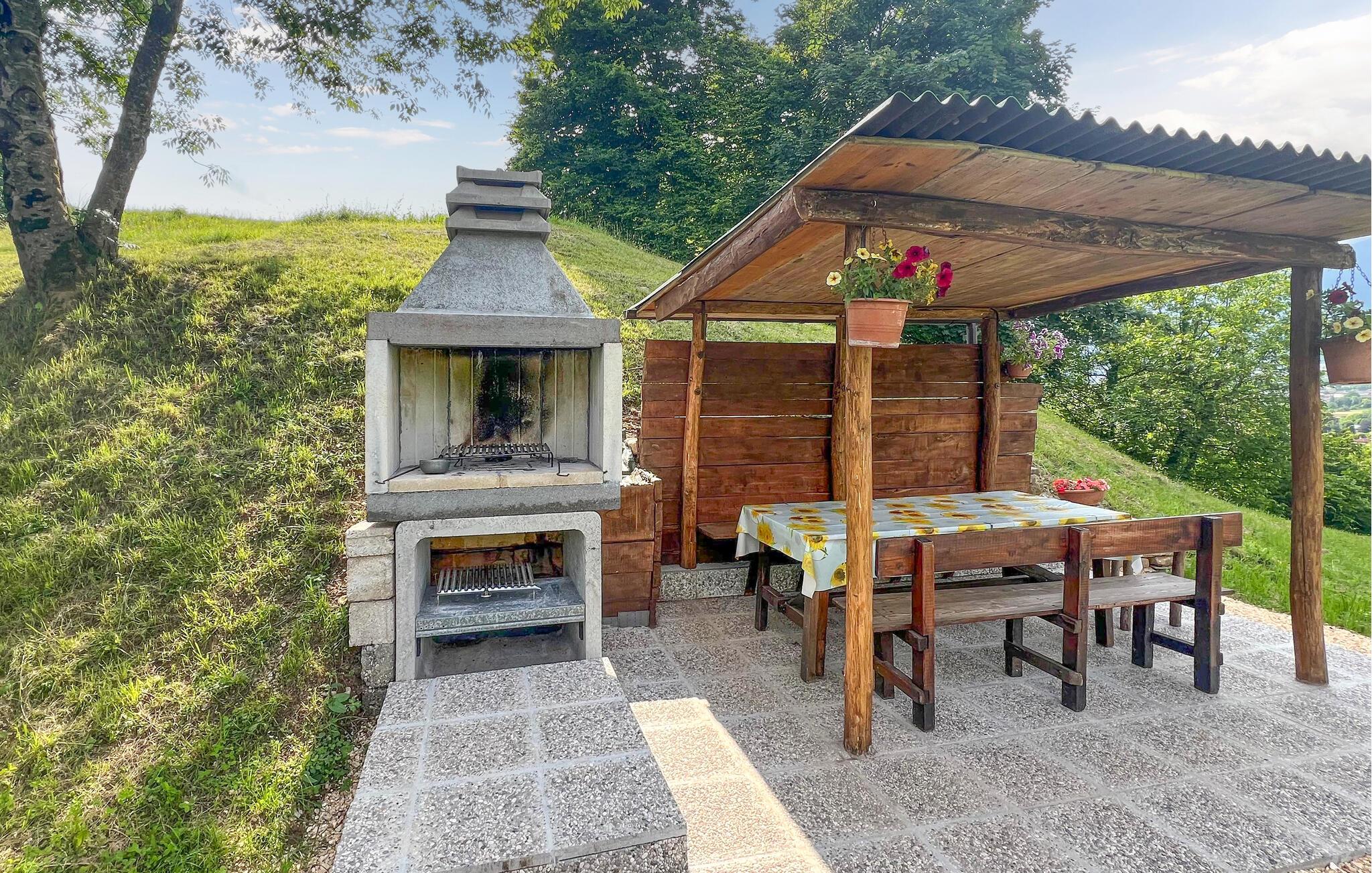 Dette hyggelige feriehus falder smukt ind i det grønne, bjergrige landskab.