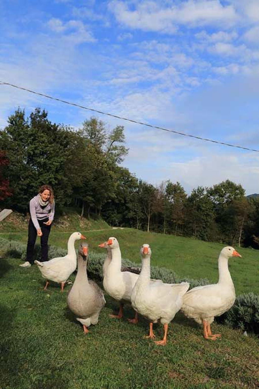 Large terrace equipped with gazebo, sunbeds, barbecue and games for the little ones. We live in a cottage with a large garden and we want to share this space also with our animal friends. Walking in the garden you can meet sweet ducks, geese and other farmyard animals that animate our pond; you can also pick seasonal fruits from the trees in our park; you can admire our industrious bee friends that produce delicious honey.