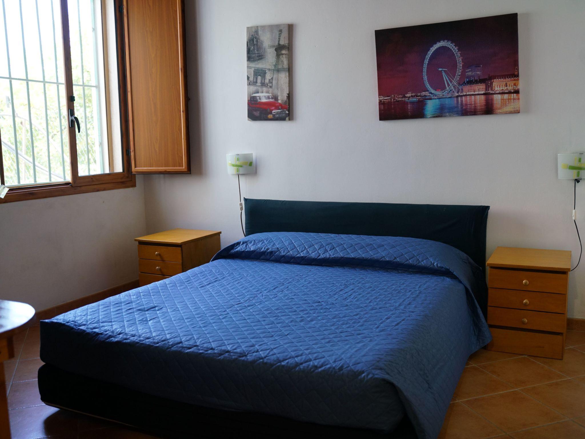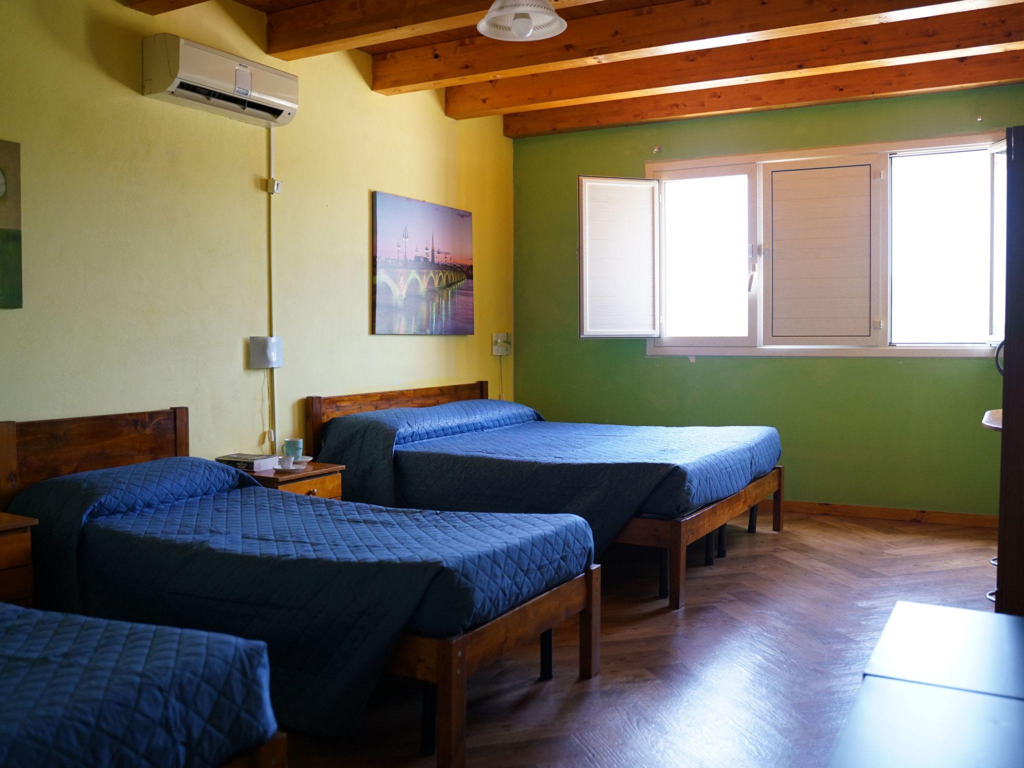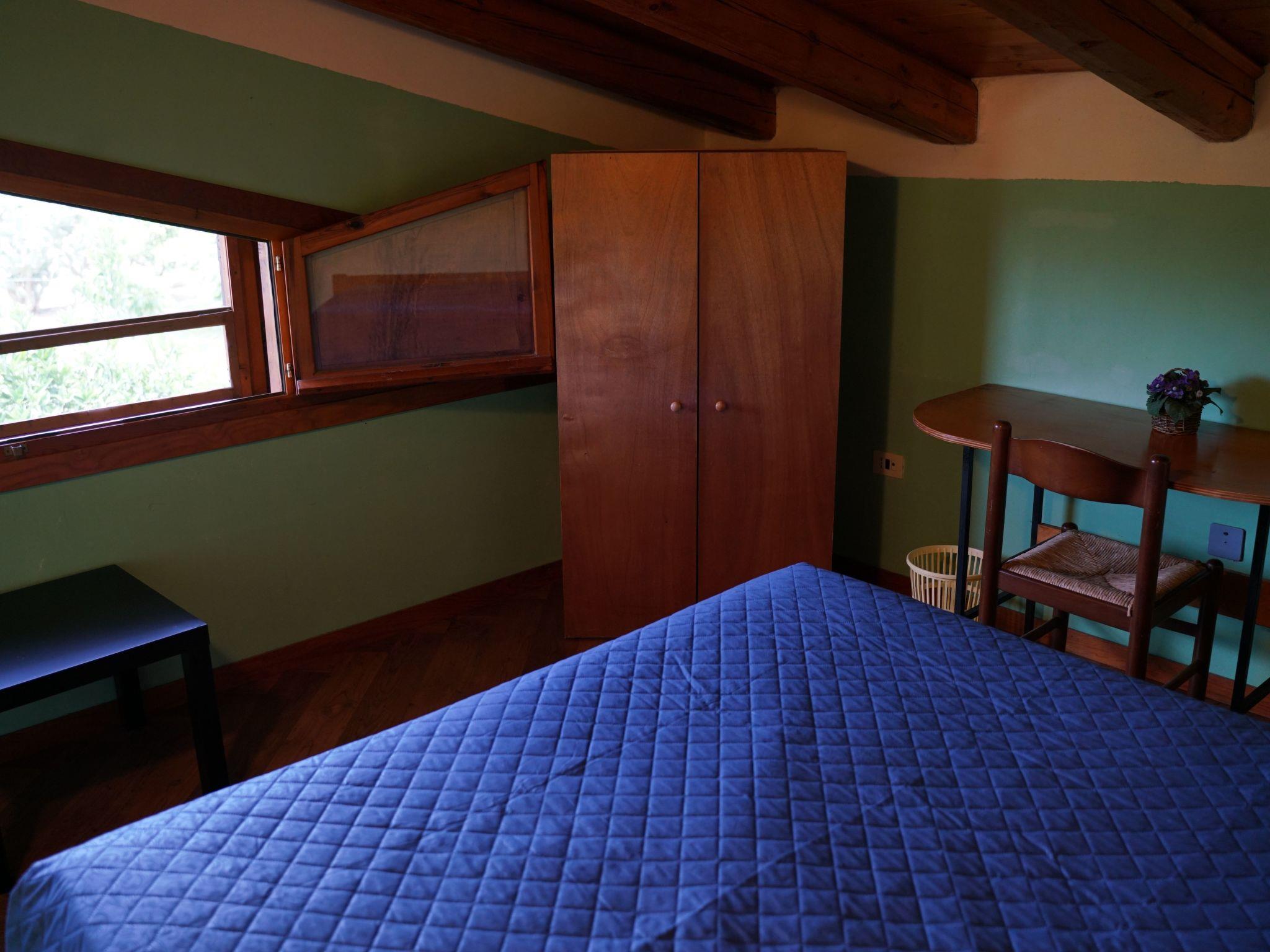 The villa, with great attention to detail, consists of two independent terraced houses, each with its own entrance, one of which is inhabited by the owners and the second is available for guests. It offers seven bedrooms, each with its own bathroom, and can accommodate up to twenty people. It is divided into two levels. On the ground floor there is a large kitchen-living room of about 40 m², where it is possible to gather in a convivial atmosphere, even in large groups, or even to organise parties. A large wooden dining table is the heart of the room. Along one wall are sofas and armchairs. The elegant kitchenette is well equipped: it includes a washing machine, dishwasher, refrigerator with freezer, microwave, gas cooker, oven and toaster. The ground floor offers three bedrooms, two quadruple and one triple, each with a double bed. One of the four bedrooms also offers a bunk bed, the second has two single beds and the triple room has a single bed. Each room also has its own bathroom with shower. A staircase leads to the attic floor. Here are the other four bedrooms, each with a double bed, one of which also has a single bed. These rooms also each have their own bathroom with shower. The dimensions of the double beds are 160x190cm, those of the single beds 80x190cm. All rooms and the kitchen-living room are air-conditioned (hot/cold). The kitchen-living room and all bedrooms are equipped with TV with satellite channels. On request it is possible to add two extra beds for one person each, one in one of the quadruple rooms and one in one of the triple rooms. The villa is surrounded by a plot of approximately 10,000 m². The outdoor areas of the holiday home are independent of those of the owners. Right next to the house is a veranda furnished with several tables and chairs, where you can enjoy your meals and relax in the shade. A brick barbecue and a gas cooker allow you to prepare meals outdoors. A table tennis table and a dartboard provide entertainment. For those who prefer sunny spots, tables and chairs are also available in the garden. A hammock invites you to relax and read. Of particular interest is the swimming pool, which is surrounded by a sun terrace with sun loungers, parasols and deck chairs. Awnings provide pleasant shade. The pool can be used together with the house owners. For the little ones, there are children's games in the garden. The property has a large car park that can accommodate several vehicles. Guests can also use two bicycles free of charge. One of the bedrooms on the upper floor offers access to a small terrace with table and chairs.
