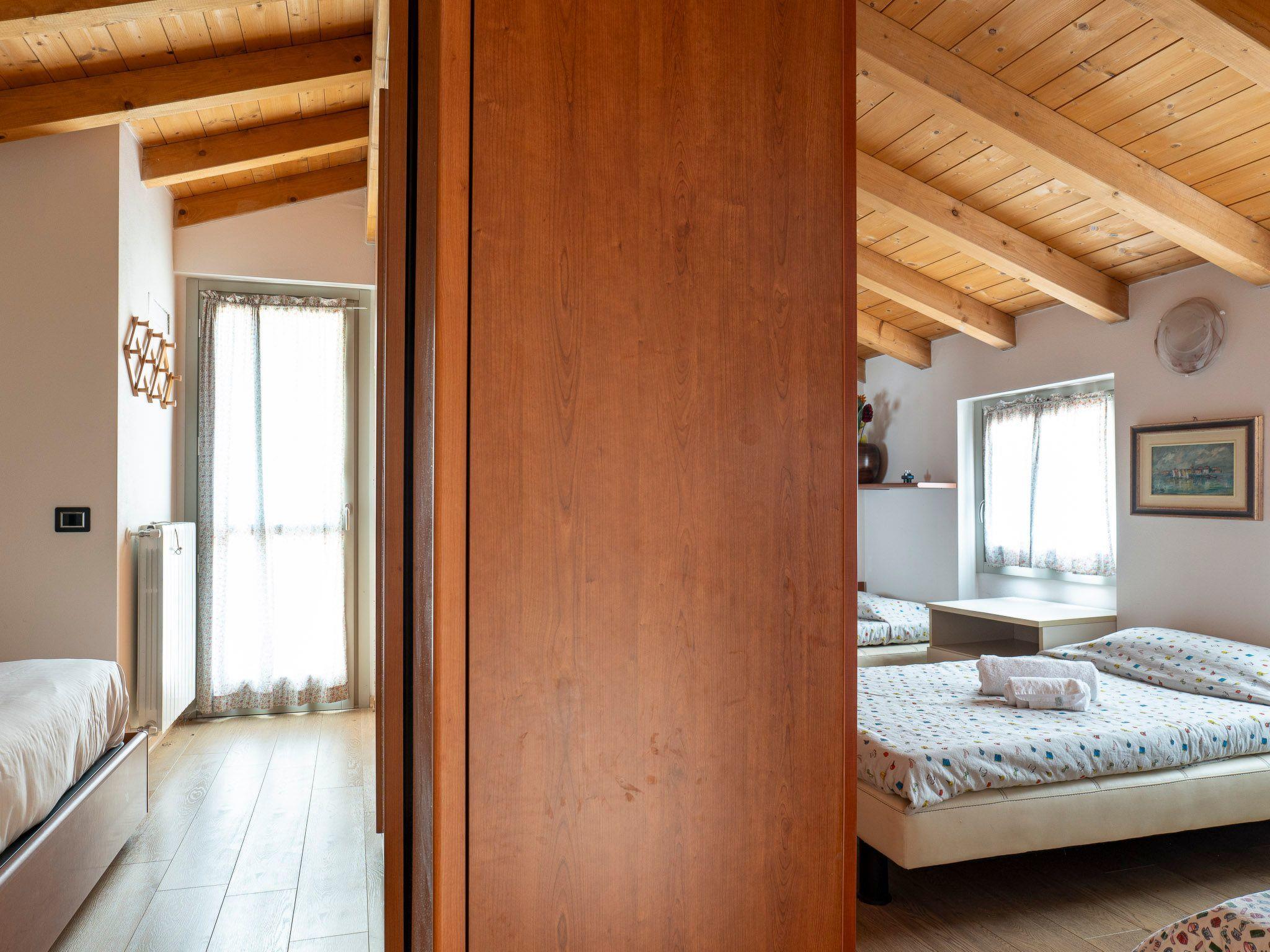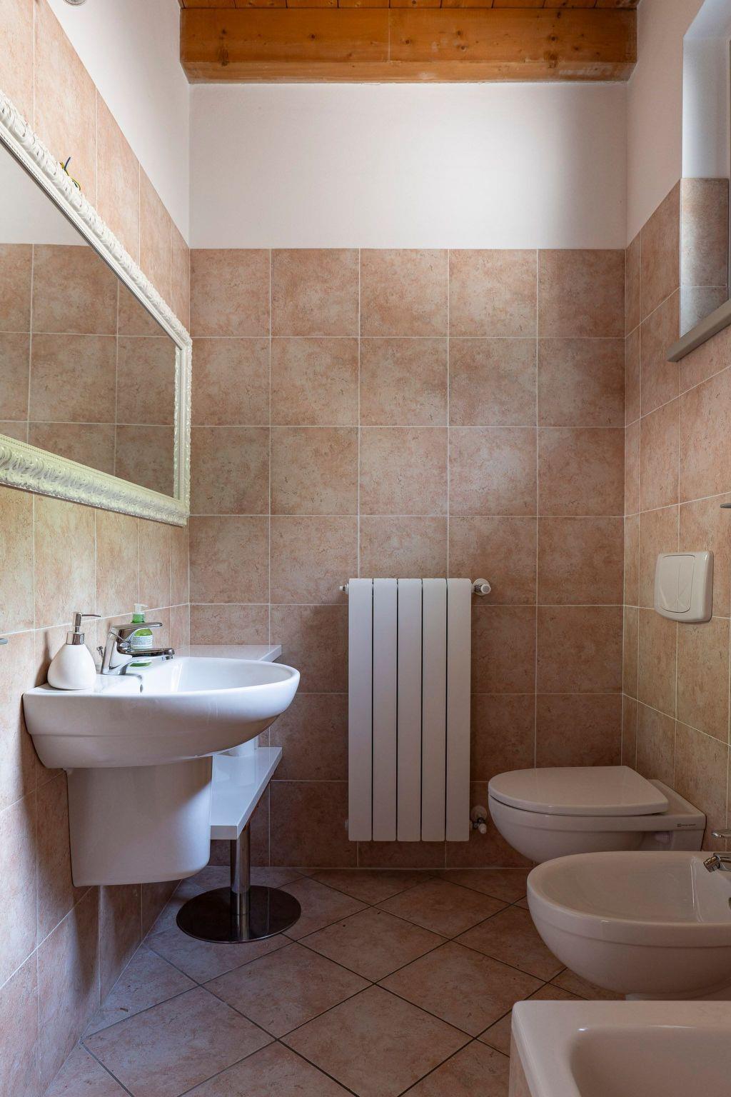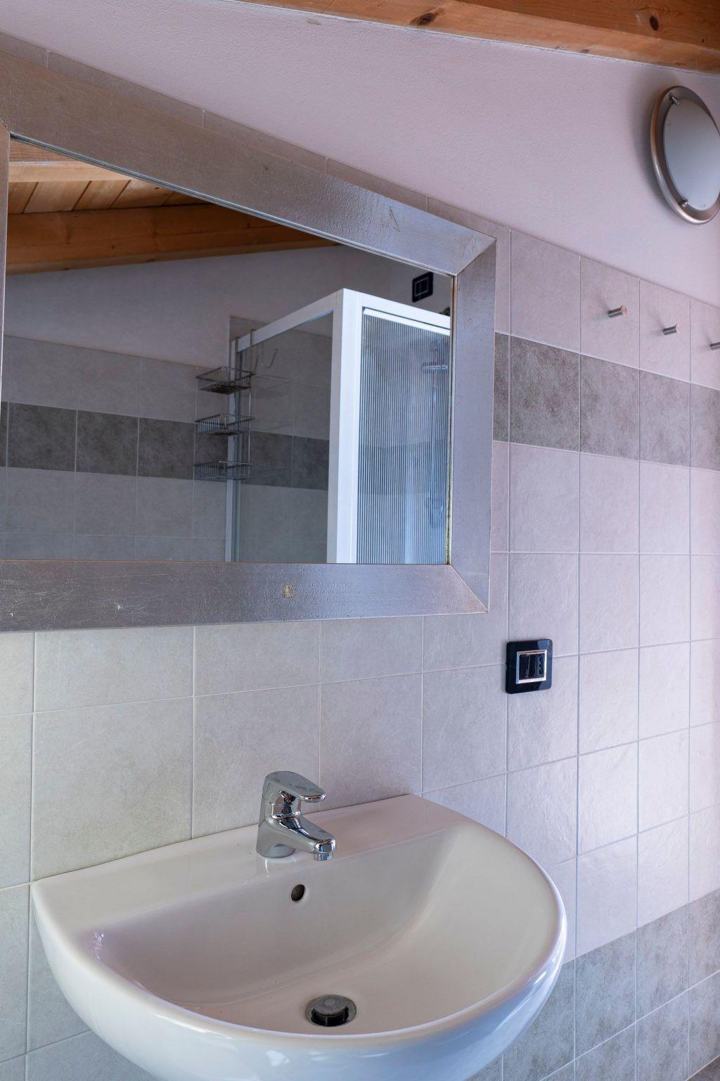On the ground floor we thus find a living area with red leather sofas and television, a comfortable dining table for six and a wall-mounted kitchen with induction hob, oven, dishwasher and, of course, fridge and freezer. The bathroom on this floor is equipped with a washing machine and bathtub and there is also a closet. The ceilings are with exposed wooden beams and a staircase, also made of wood, leads to the second floor where we find the double bedroom, with wardrobe and mirrors and a French window opening onto a further small balcony, and the bedroom with the three single beds. Both rooms have parquet flooring, offer wardrobes and mirrors, and enjoy natural light. Here the ceilings, also made of wood and with exposed beams, are sloping but retain a good height everywhere. The second-floor bathroom with shower closes the parade of rooms.
