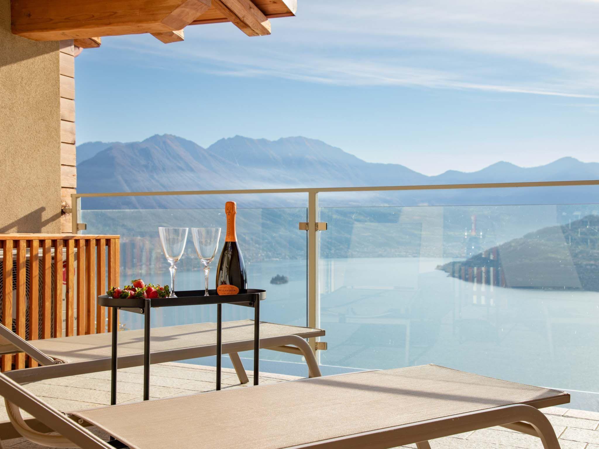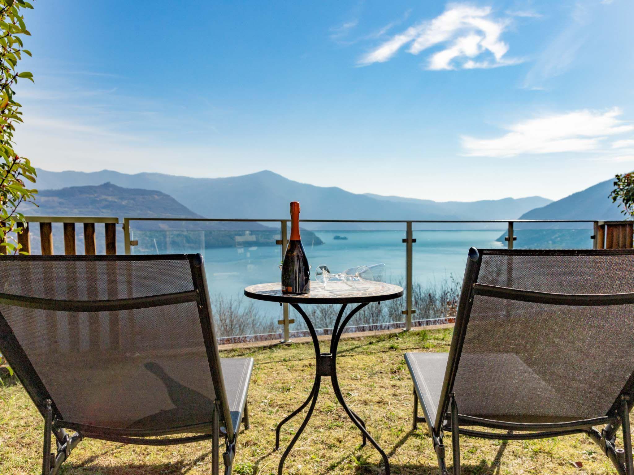 Arranged on two floors, the three-room apartment in a villa of over 60 square metres welcomes you with a very modern living room characterised by shades of black, white and blue, consisting of a table, sofa bed, corner kitchen with induction hobs, coffee maker and coffee machine with pods, kettle, dishwasher and oven. The double French window gives access to the large garden with an awning and glass parapets allowing an endless lake view. The floor is completed by the small bedroom and the bathroom with suspended sanitary fittings. The helicoidal staircase in cement and stone leads to the master bedroom, unique for the poetic view from the full-wall window, the exposed beams and the mirrored wardrobe that enlarges the available space; on the floor there is also the bathroom, also equipped with a bright full-wall window and an emotional shower, and the panoramic terrace with sun loungers, a true triumph of privacy and an apotheosis of emotion. There is unlimited Wi-Fi and a garage with lift to the floor.
