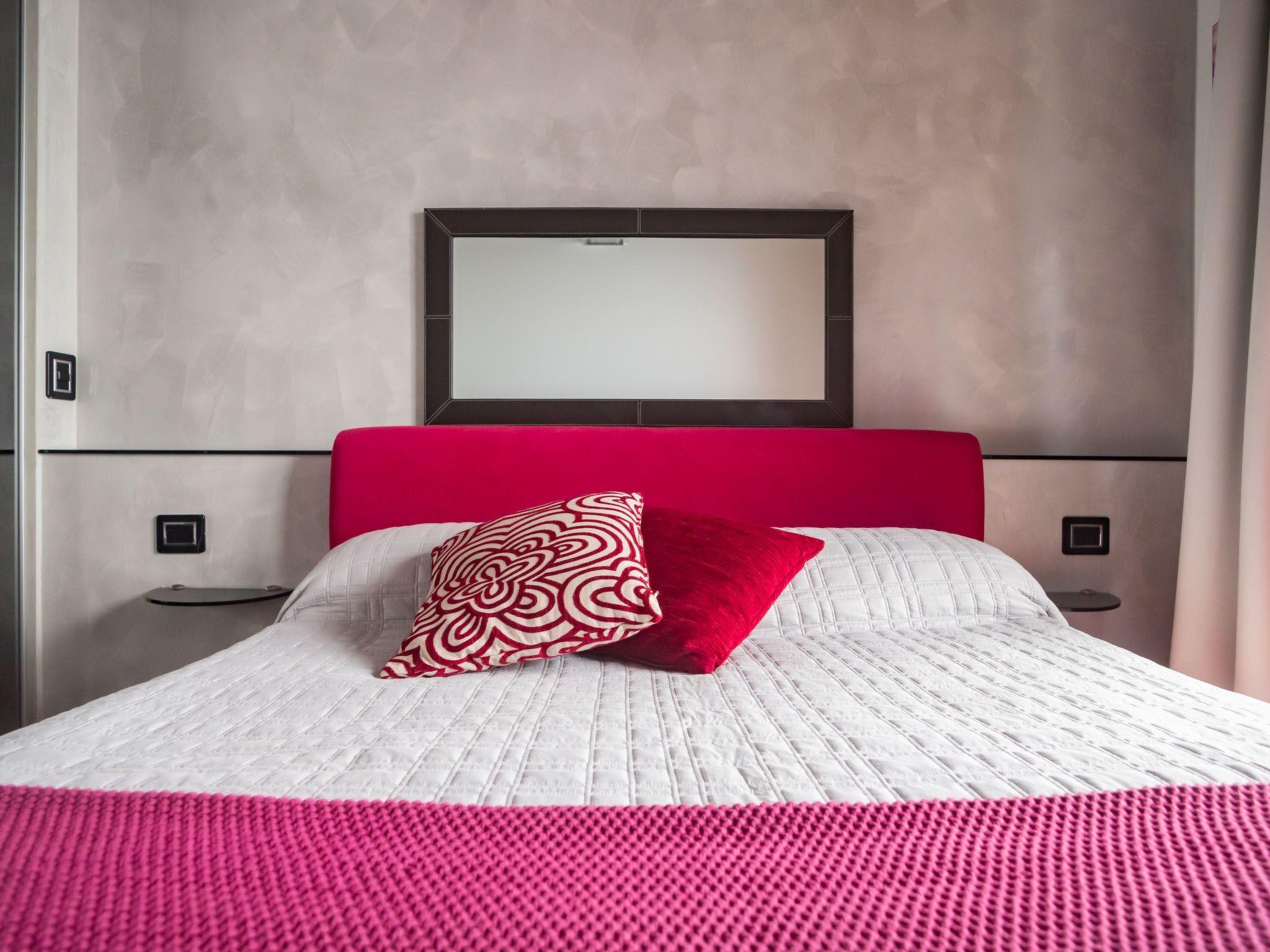 Situated on a mezzanine floor and covering 45 square metres with exposed beams, the flat is distinguished by its modern and vibrant furnishings which, combining the grey of the walls with the red and white of the textiles, create a chic, enveloping atmosphere, enriched by the large mirrors above the sofa bed and in the master bedroom, complemented by the very fine string-course lighting. The living room with a large full-wall window facing the lake has a kitchen with induction hob, SMEG freezer and refrigerator, dishwasher, oven, microwave, coffee maker, kettle and large hanging flat-screen TV. The double bedroom also has a beautiful full-wall window facing the lake, and the bathroom offers a shower cubicle and wall-hung bathroom fittings. There is a large private garage and unlimited Wi-Fi.