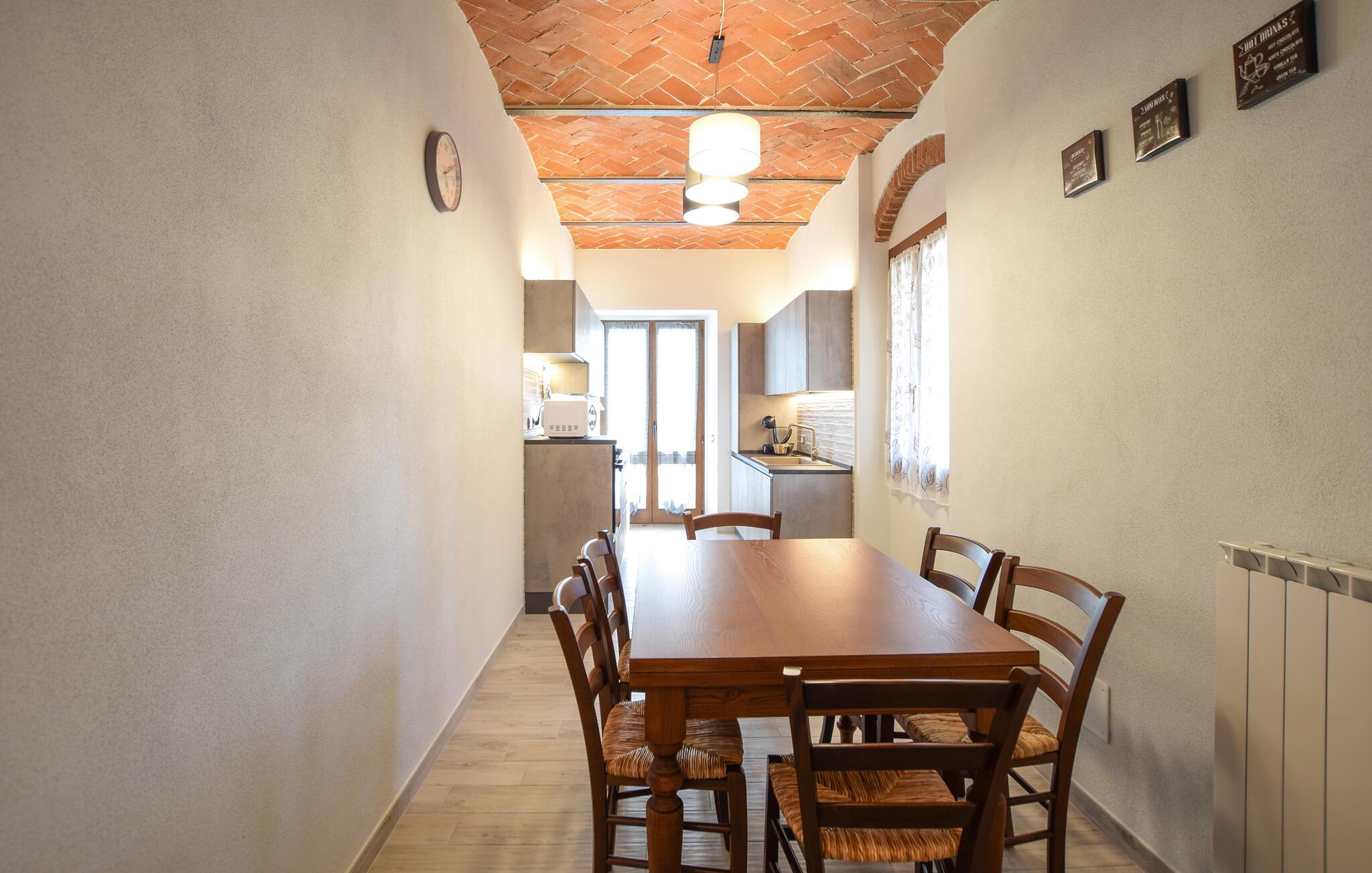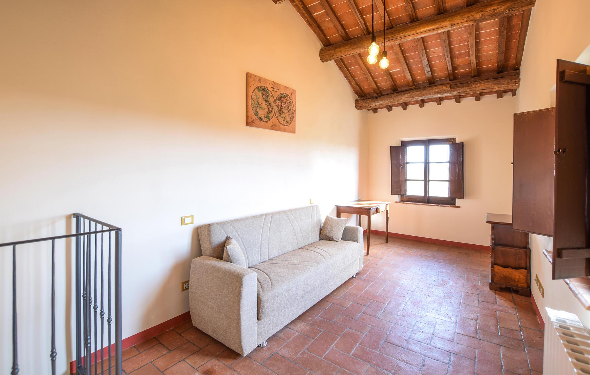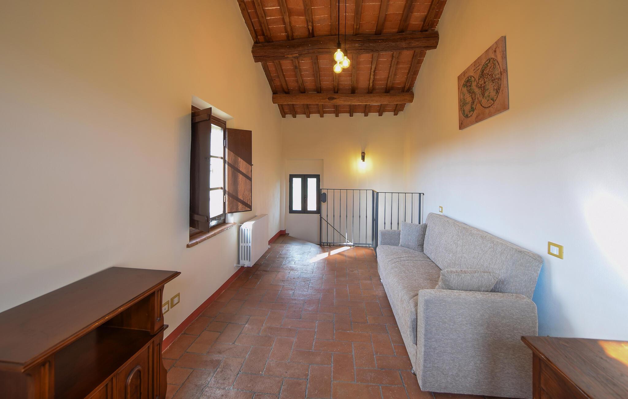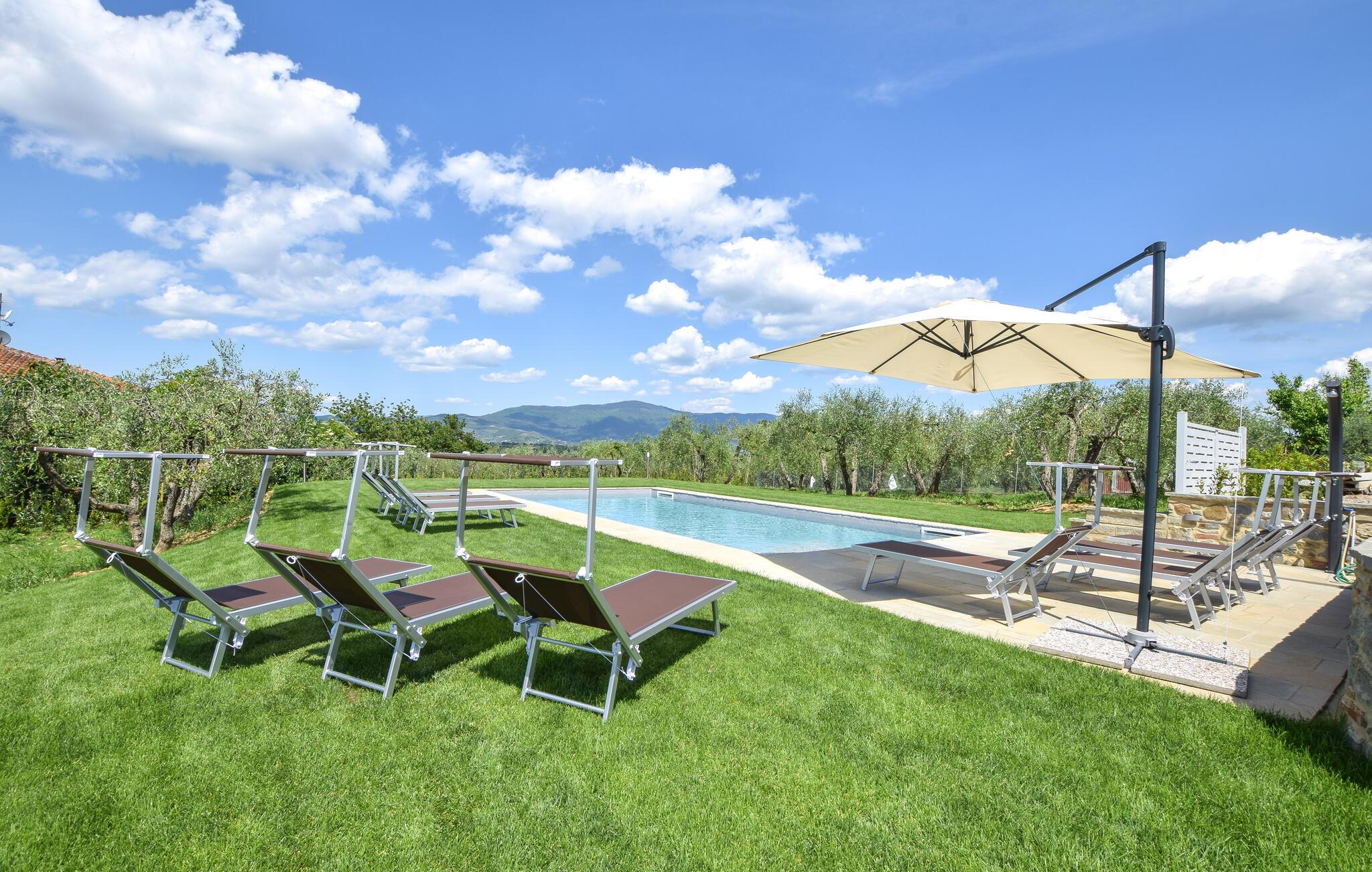 Velkommen til jeres feriehus i Fratticciola di Cortona. Dette kærligt renoverede hjem, der udgør en del af en historisk bondegård, tilbyder en perfekt blanding af rustik charme og moderne komfort. Tilbring dagen på terrassen, hvor komfortable siddepladser og en parasol sørger for skygge. Slap af ved den private pool omgivet af velplejet græs og olivenlunde, og lad sjælen finde ro.
