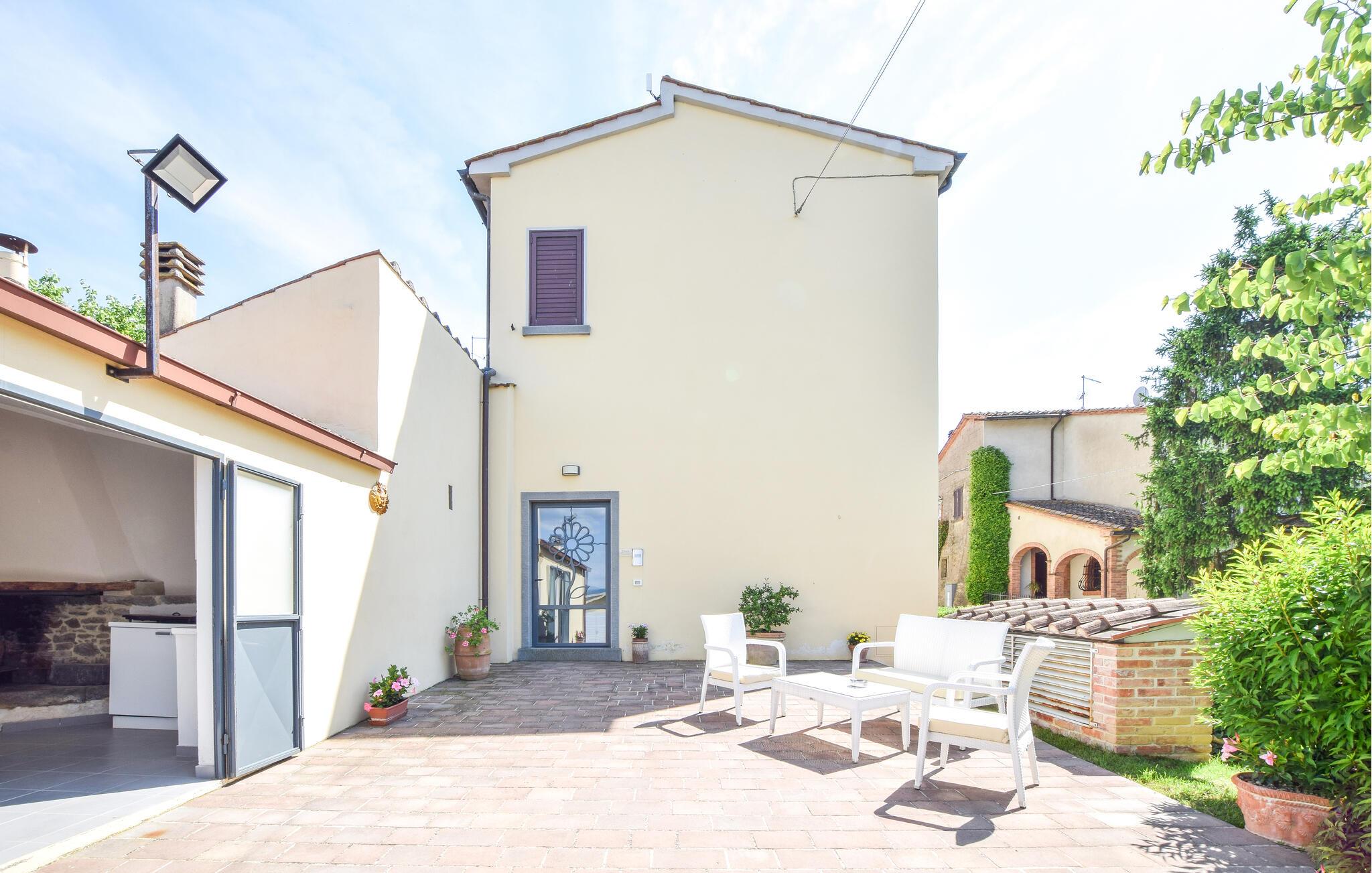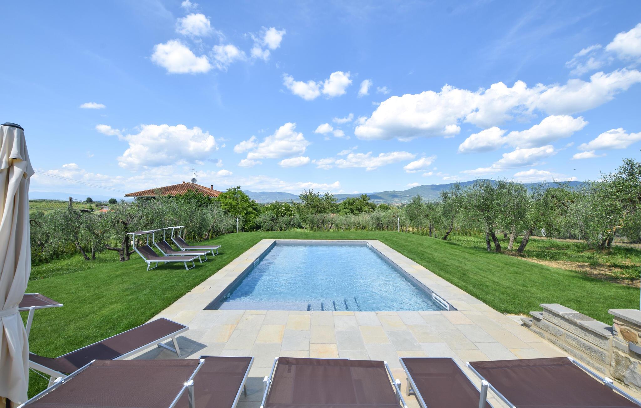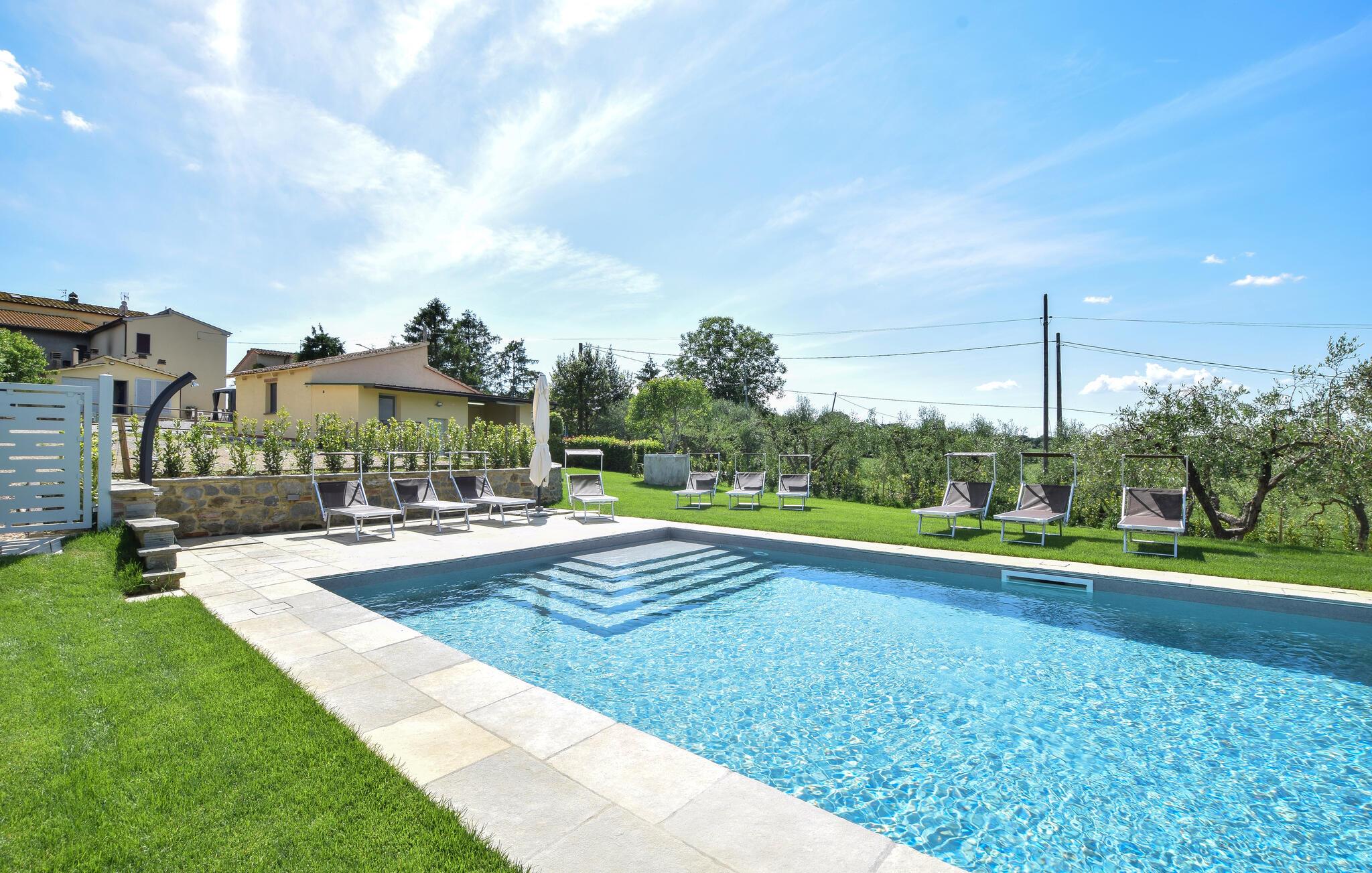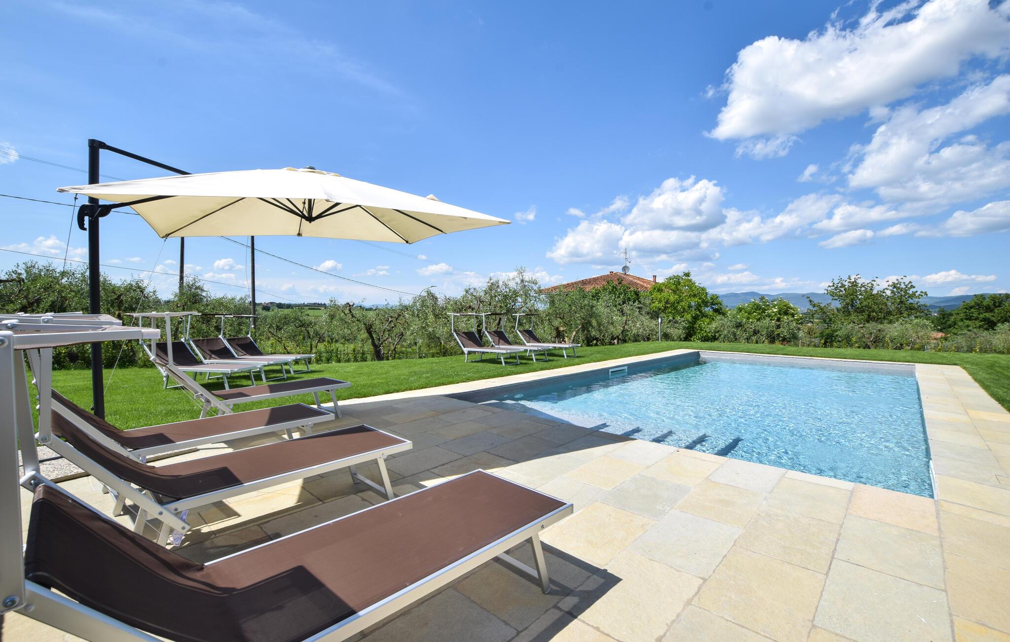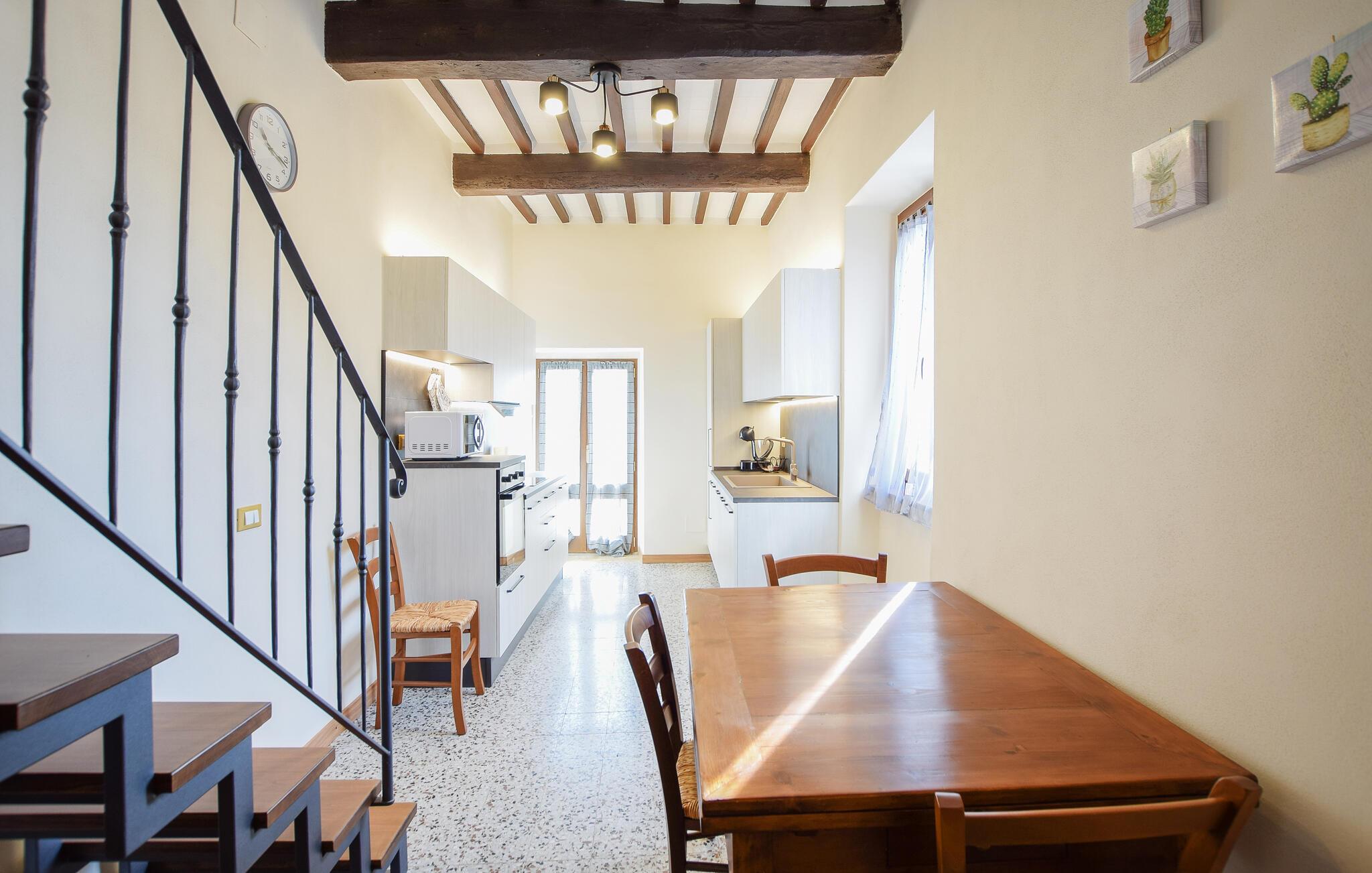Velkommen til jeres feriehus i Fratticciola di Cortona. Dette kærligt renoverede hjem, der udgør en del af en historisk bondegård, tilbyder en perfekt blanding af rustik charme og moderne komfort. Tilbring dagen på terrassen, hvor komfortable siddepladser og en parasol sørger for skygge. Slap af ved den private pool omgivet af velplejet græs og olivenlunde, og lad sjælen finde ro.