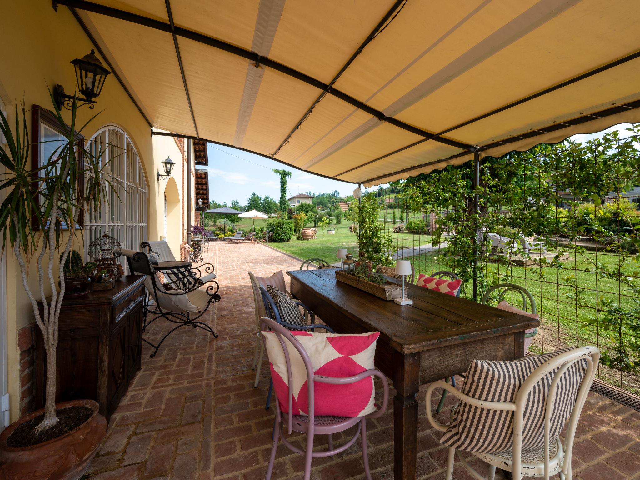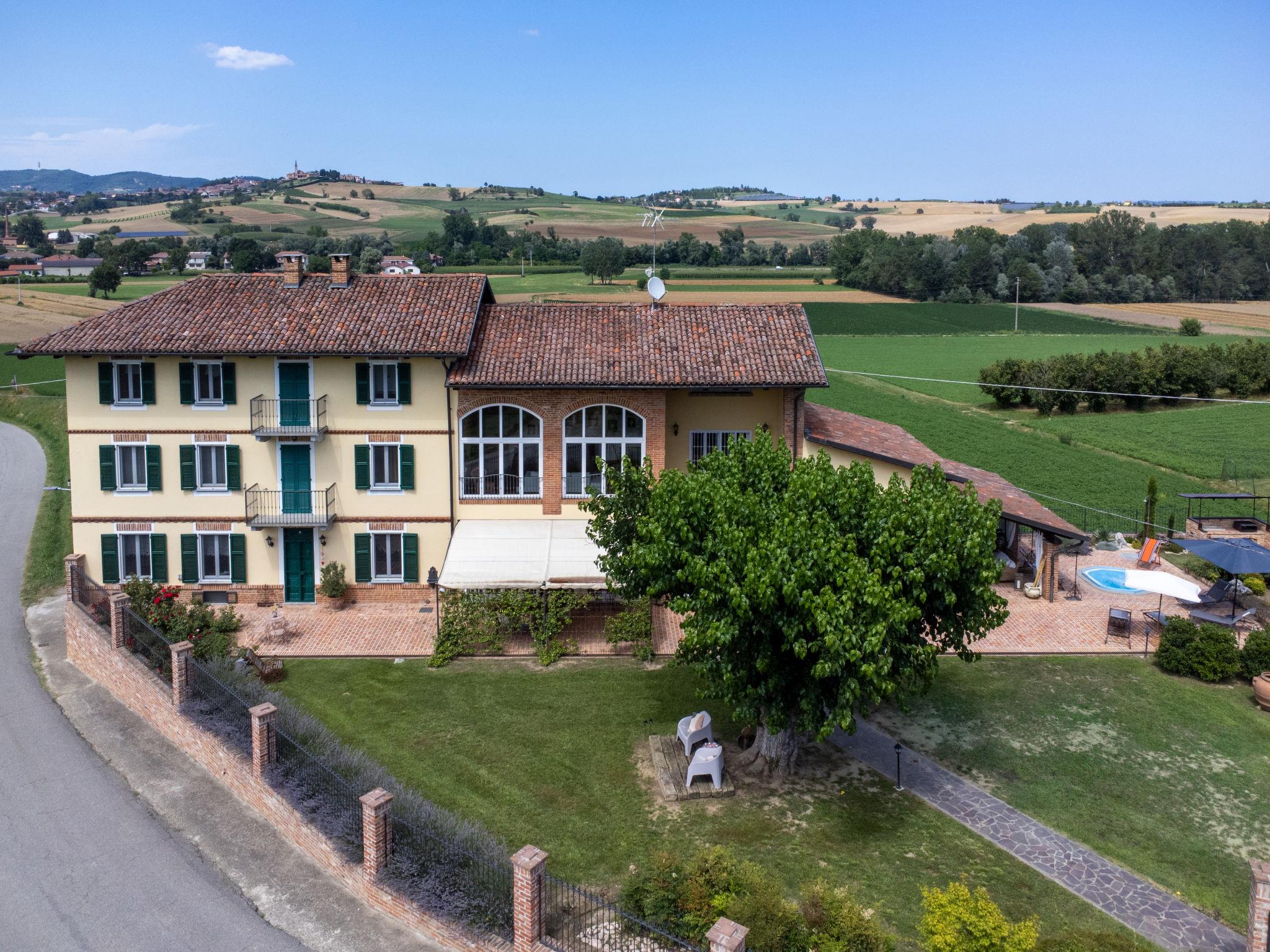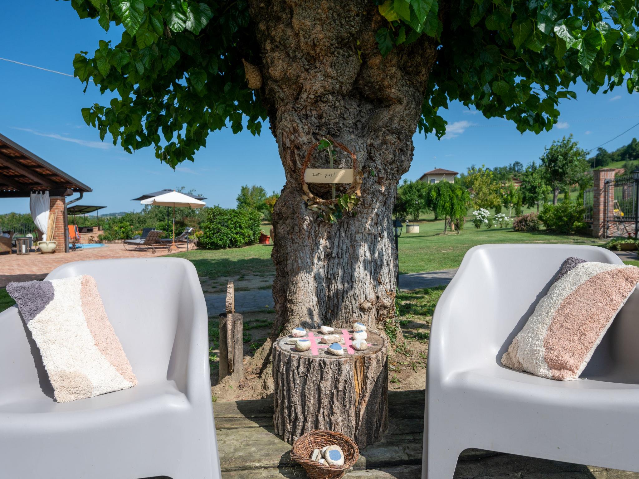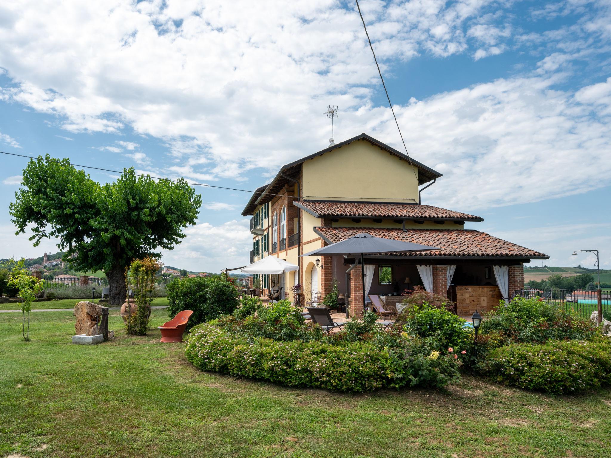 Large cottage "La Bell'aria", detached. On the outskirts, 1 km from the centre of Frinco, in an elevated position. Private: property 4'500 m2 (fenced) with wildlife garden and trees, natural garden, meadow. Outdoor shower, hot tub, table tennis, badminton, patio, pergola (20 m2), terrace, garden furniture, barbecue house, parking (for 3 cars) at the house on the premises. Bus stop 1 km. Nearby attractions: Asti 15 km, Casale Monferrato 37 km, Alba 45 km, La Morra 55 km, Barolo 52 km, Torino 76 km. Please note: car recommended. The tub is open from 30.04. to 15.09. The pool of the Bistro (20 x4 m, 01.06.-15.09.) located at a distance of ca. 100 m, can be used by our guests for a fee of: EUR 15 per person/day.