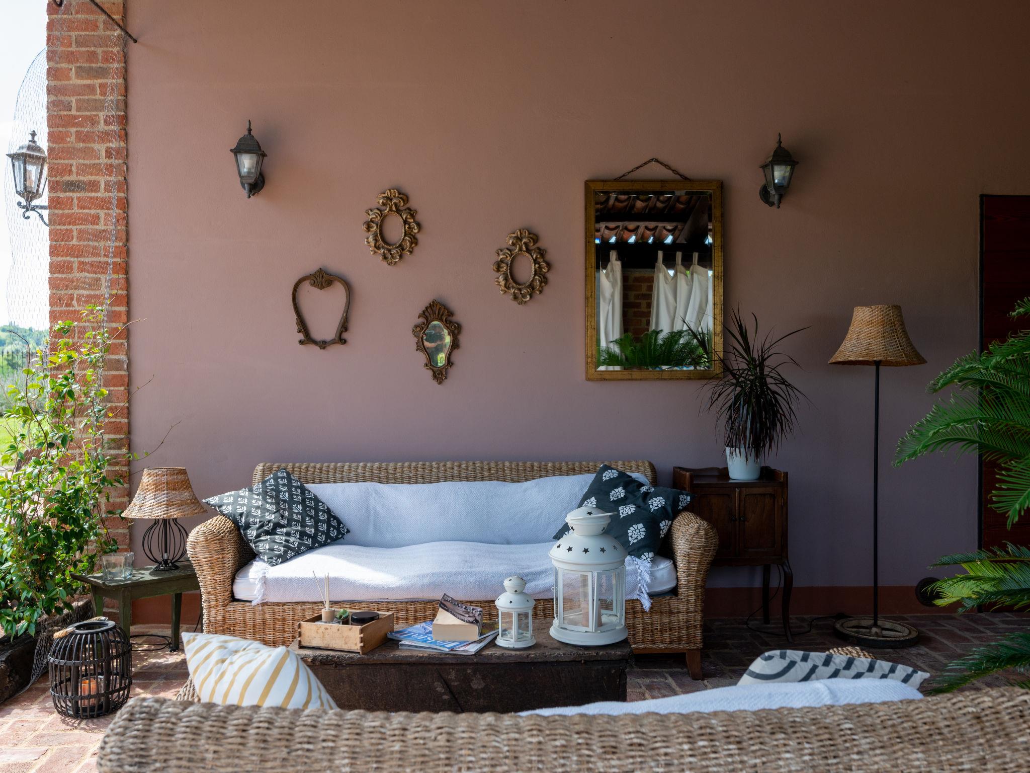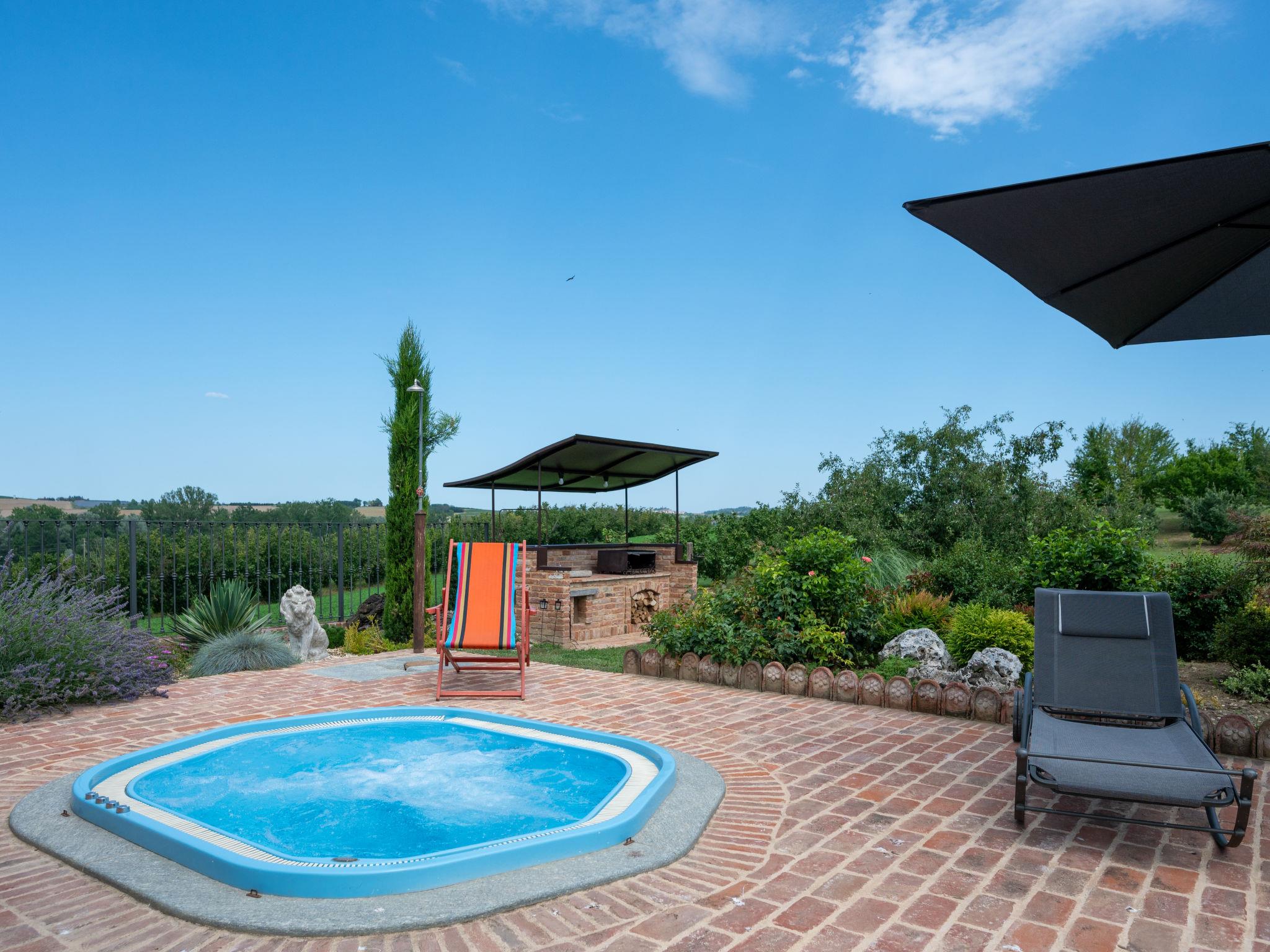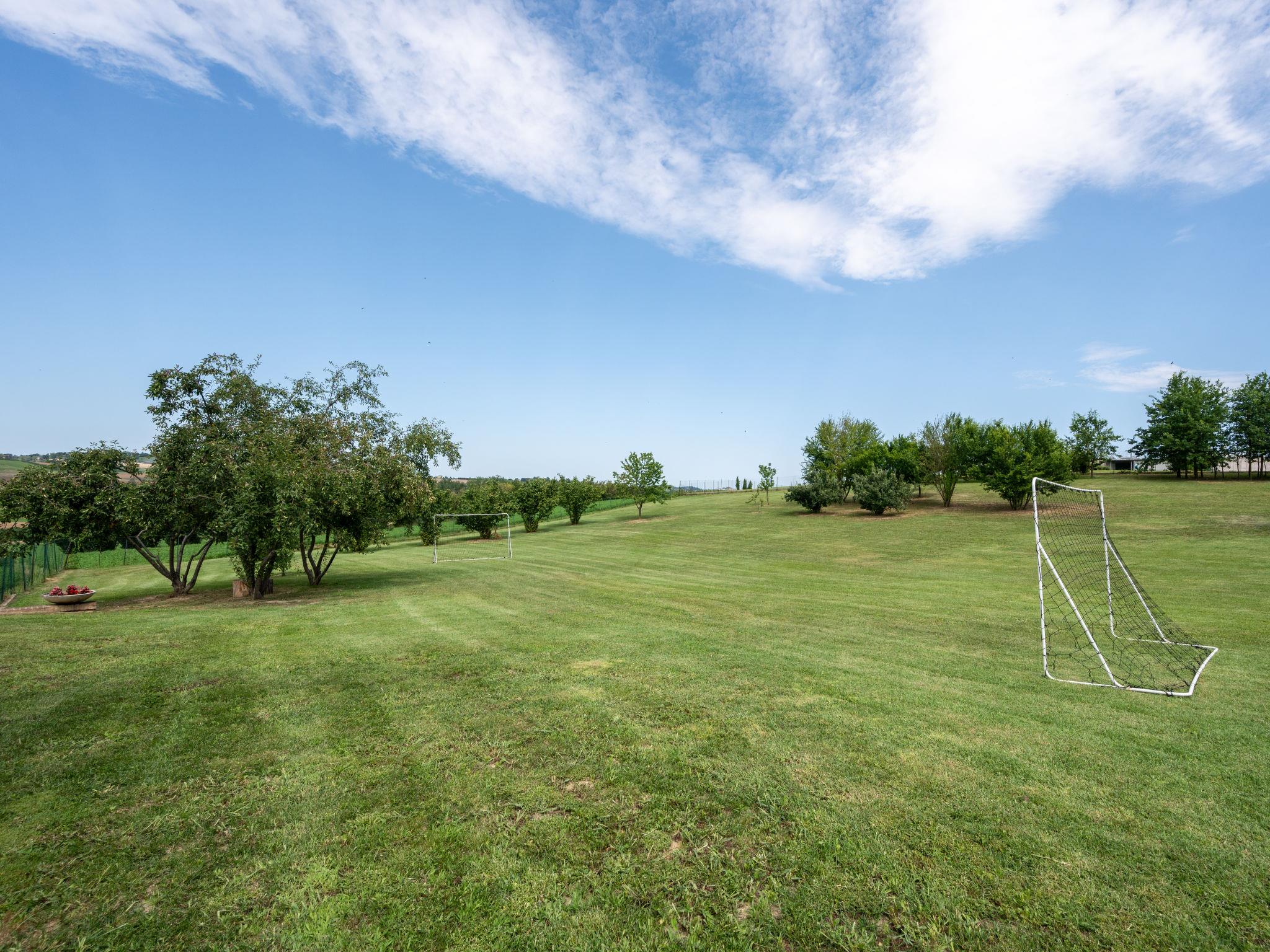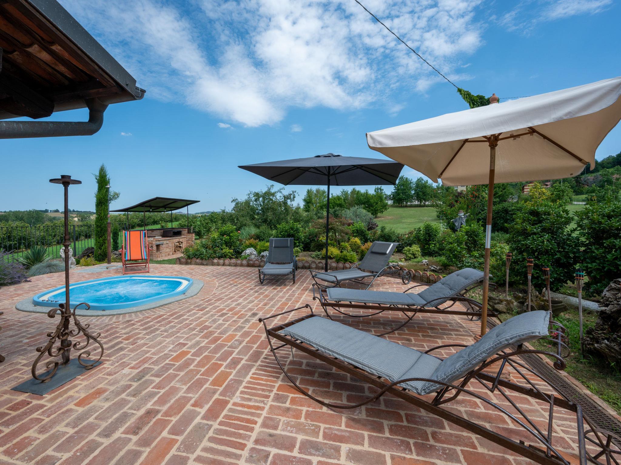 Large cottage "La Bell'aria", detached. On the outskirts, 1 km from the centre of Frinco, in an elevated position. Private: property 4'500 m2 (fenced) with wildlife garden and trees, natural garden, meadow. Outdoor shower, hot tub, table tennis, badminton, patio, pergola (20 m2), terrace, garden furniture, barbecue house, parking (for 3 cars) at the house on the premises. Bus stop 1 km. Nearby attractions: Asti 15 km, Casale Monferrato 37 km, Alba 45 km, La Morra 55 km, Barolo 52 km, Torino 76 km. Please note: car recommended. The tub is open from 30.04. to 15.09. The pool of the Bistro (20 x4 m, 01.06.-15.09.) located at a distance of ca. 100 m, can be used by our guests for a fee of: EUR 15 per person/day.