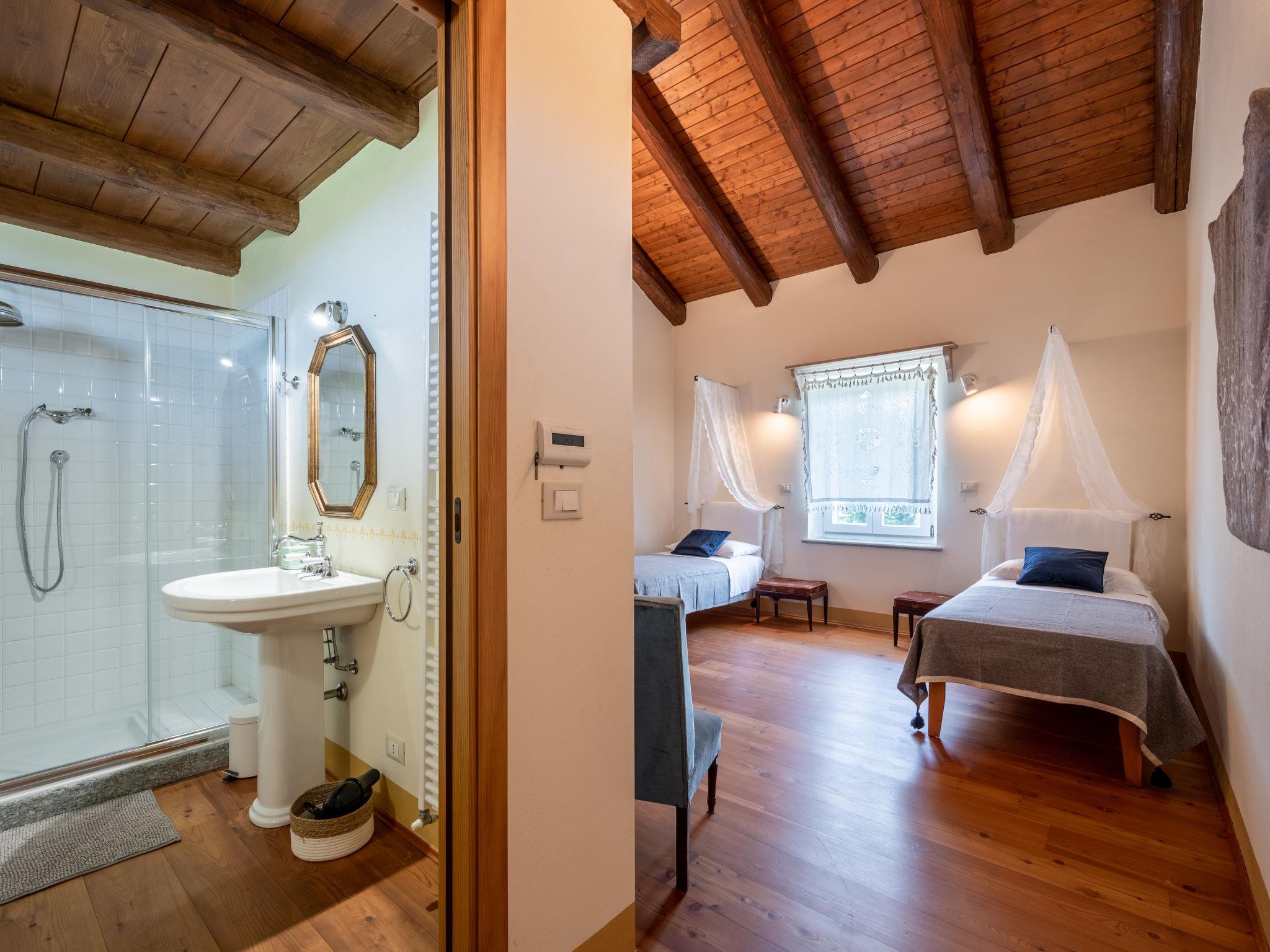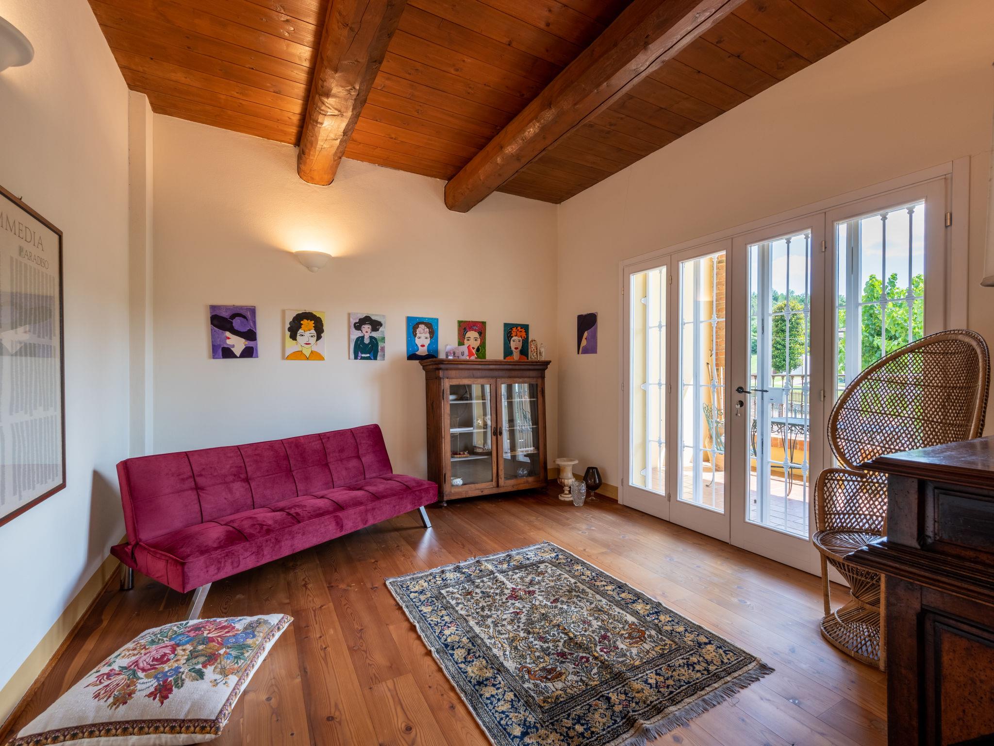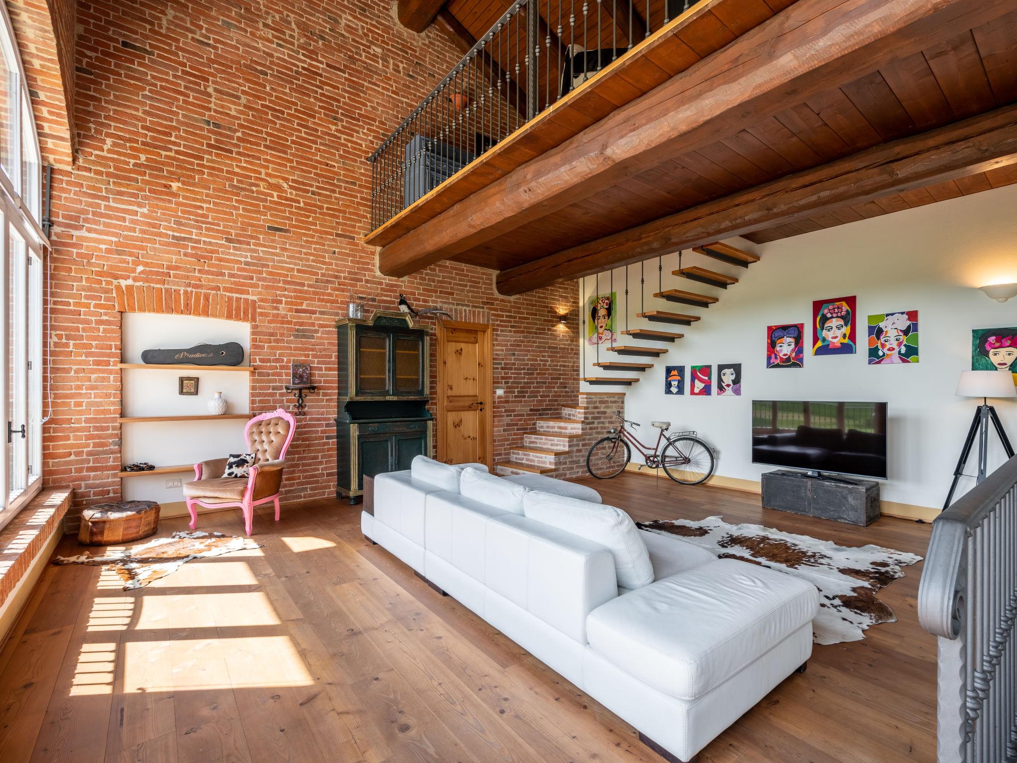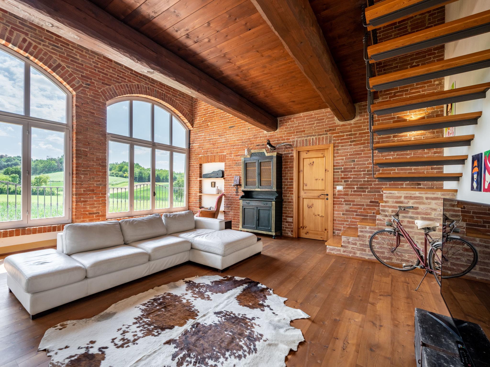 9-room house 500 m2 on 3 levels. Bright, very comfortable and rustic furnishings: open large dining room with dining table. Exit to the garden. Billiard room. Open kitchen (oven, dishwasher, 5 gas rings, toaster, kettle, freezer, electric coffee machine). Exit to the garden. Shower/WC, sep. WC. Upper floor: open large living room with satellite TV. 2 rooms, each room with 1 french bed (160 cm). 1 room with 1 bed and satellite TV. Small living room. Shower/WC, sep. WC. 2nd upper floor: 1 room with 1 french bed (160 cm). 1 room with 2 beds. Open gallery with sloping ceilings. Shower/bidet/WC, bath/shower/WC, hydro massage bath. Heating. Heating available only from 01.10. to 30.04. Wooden floors. 2 balconies, 2 terraces covered. Terrace furniture, balcony furniture, deck chairs (6). Panoramic view of the countryside and Castello di Frinco. Facilities: washing machine, baby cot. Internet (WiFi, free). Maximum 2 pets/ dogs allowed. No mandatory extra charges to be paid on-site. Bedlinen, towels, final cleaning and all energy costs are included. IT005055C2NNENKQY8
