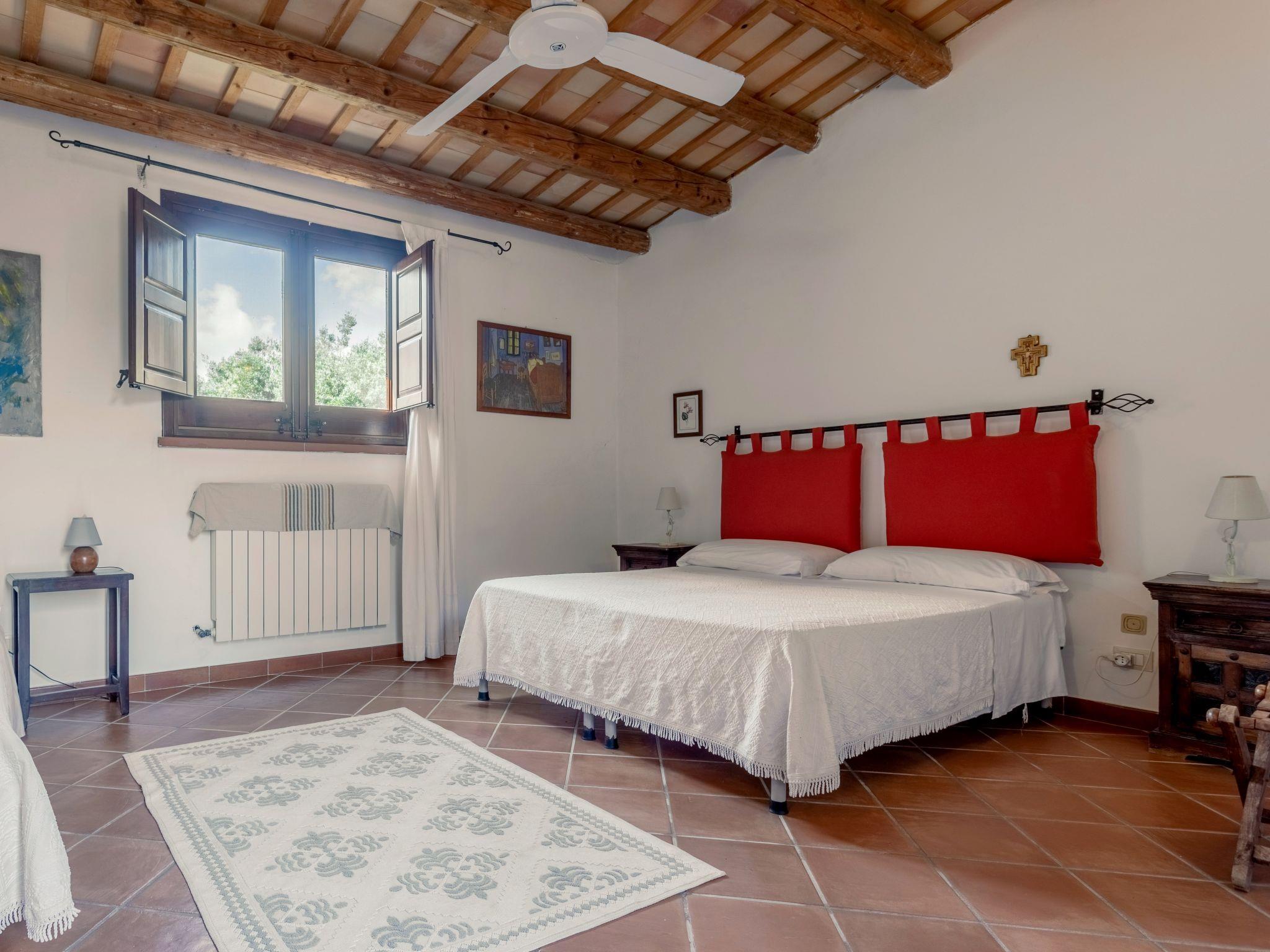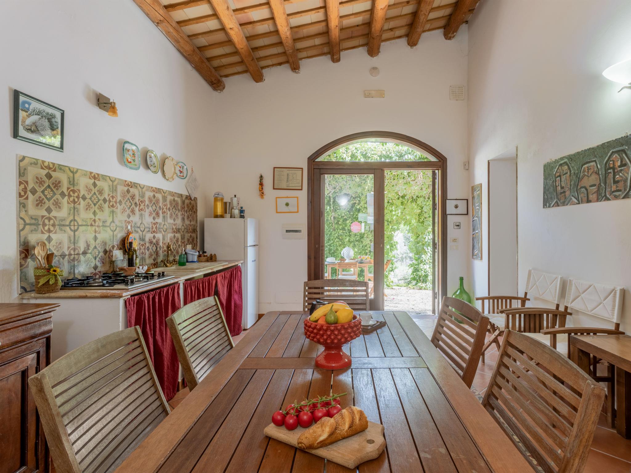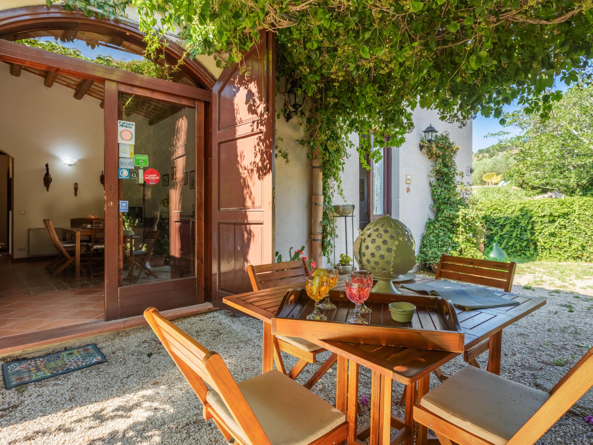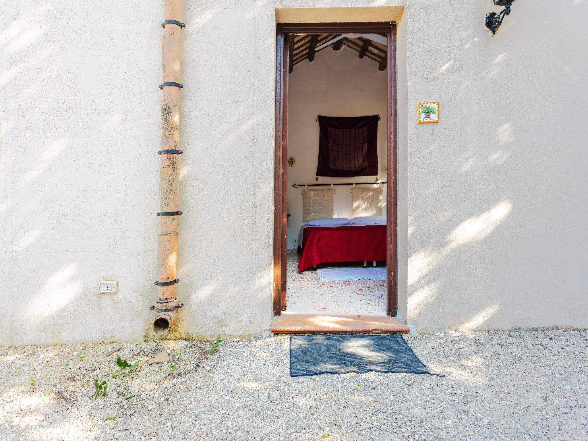 "Casale Colomba", 5-room farmhouse 180 m2, on the ground floor. Spacious, practical and comfortable furnishings: 1 double bedroom with shower/bidet/WC and TV (flat screen), fan. Exit to the terrace. 4 double bedrooms, each room with shower/bidet/WC and fan. Exit to the terrace. Kitchen-/living room in the entrance (4 hot plates, toaster, kettle, microwave, freezer, electric coffee machine) with dining table, TV (flat screen), fan. Exit pergola. Heating, gas heating, forced-air heating. Heating available only from 01.12. to 31.03. Terrace furniture, barbecue, deck chairs. View of the garden. Facilities: washing machine, iron, mosquito net, children's high chair, baby cot for up to 2 year olds (extra), hair dryer. Internet (WiFi, free). Parking (3 cars). Please note: maximum 1 pet/ dog allowed. Smoke alarm, fire extinguisher. Please note: two double bedrooms have access from the outside only. IT081002C24EMUREFT