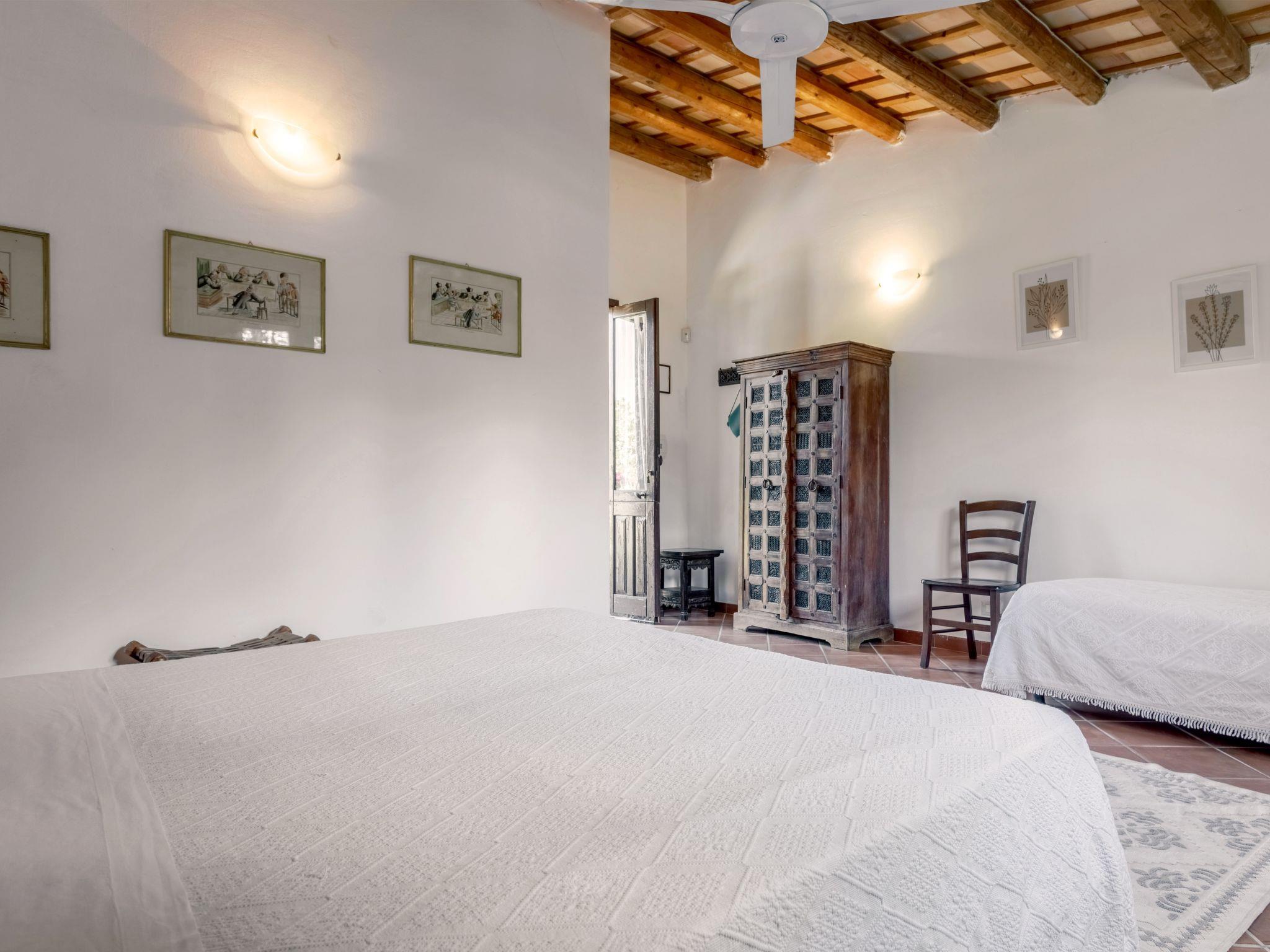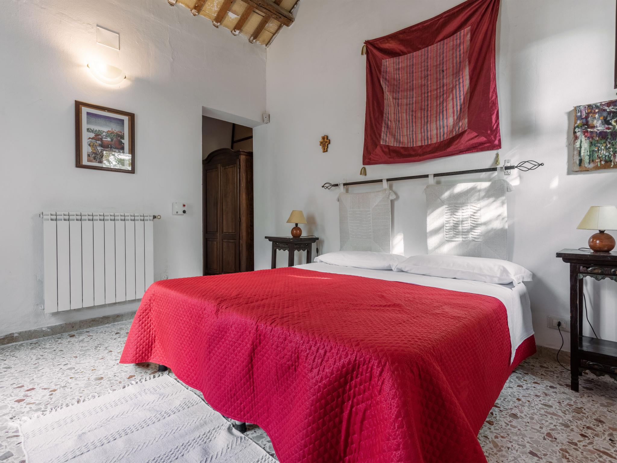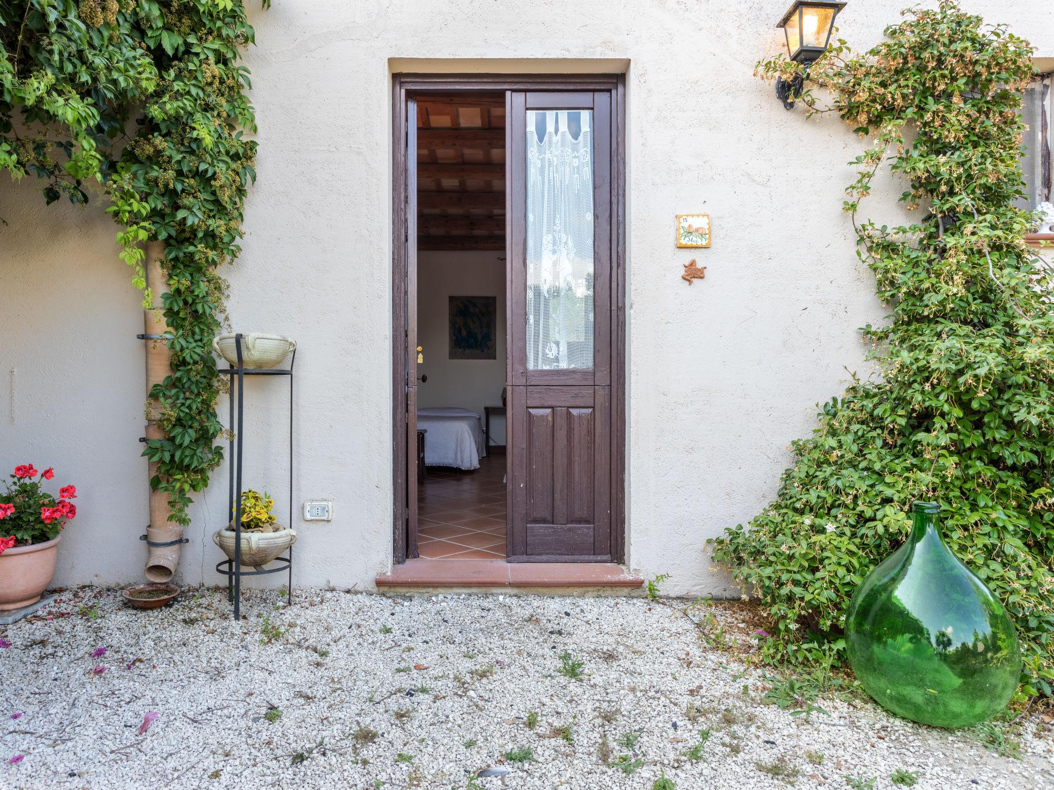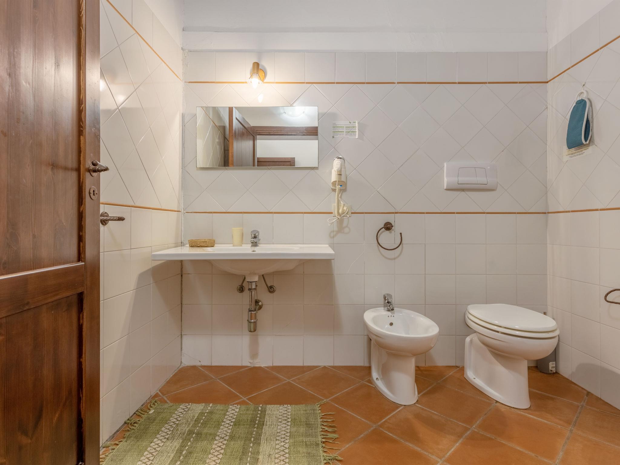 "Casale Colomba", 5-room farmhouse 180 m2, on the ground floor. Spacious, practical and comfortable furnishings: 1 double bedroom with shower/bidet/WC and TV (flat screen), fan. Exit to the terrace. 4 double bedrooms, each room with shower/bidet/WC and fan. Exit to the terrace. Kitchen-/living room in the entrance (4 hot plates, toaster, kettle, microwave, freezer, electric coffee machine) with dining table, TV (flat screen), fan. Exit pergola. Heating, gas heating, forced-air heating. Heating available only from 01.12. to 31.03. Terrace furniture, barbecue, deck chairs. View of the garden. Facilities: washing machine, iron, mosquito net, children's high chair, baby cot for up to 2 year olds (extra), hair dryer. Internet (WiFi, free). Parking (3 cars). Please note: maximum 1 pet/ dog allowed. Smoke alarm, fire extinguisher. Please note: two double bedrooms have access from the outside only. IT081002C24EMUREFT