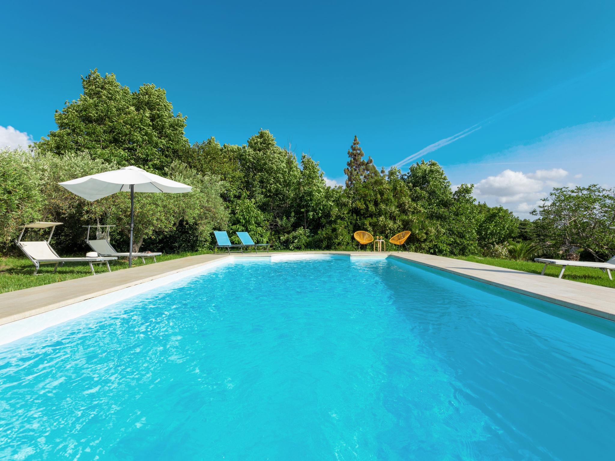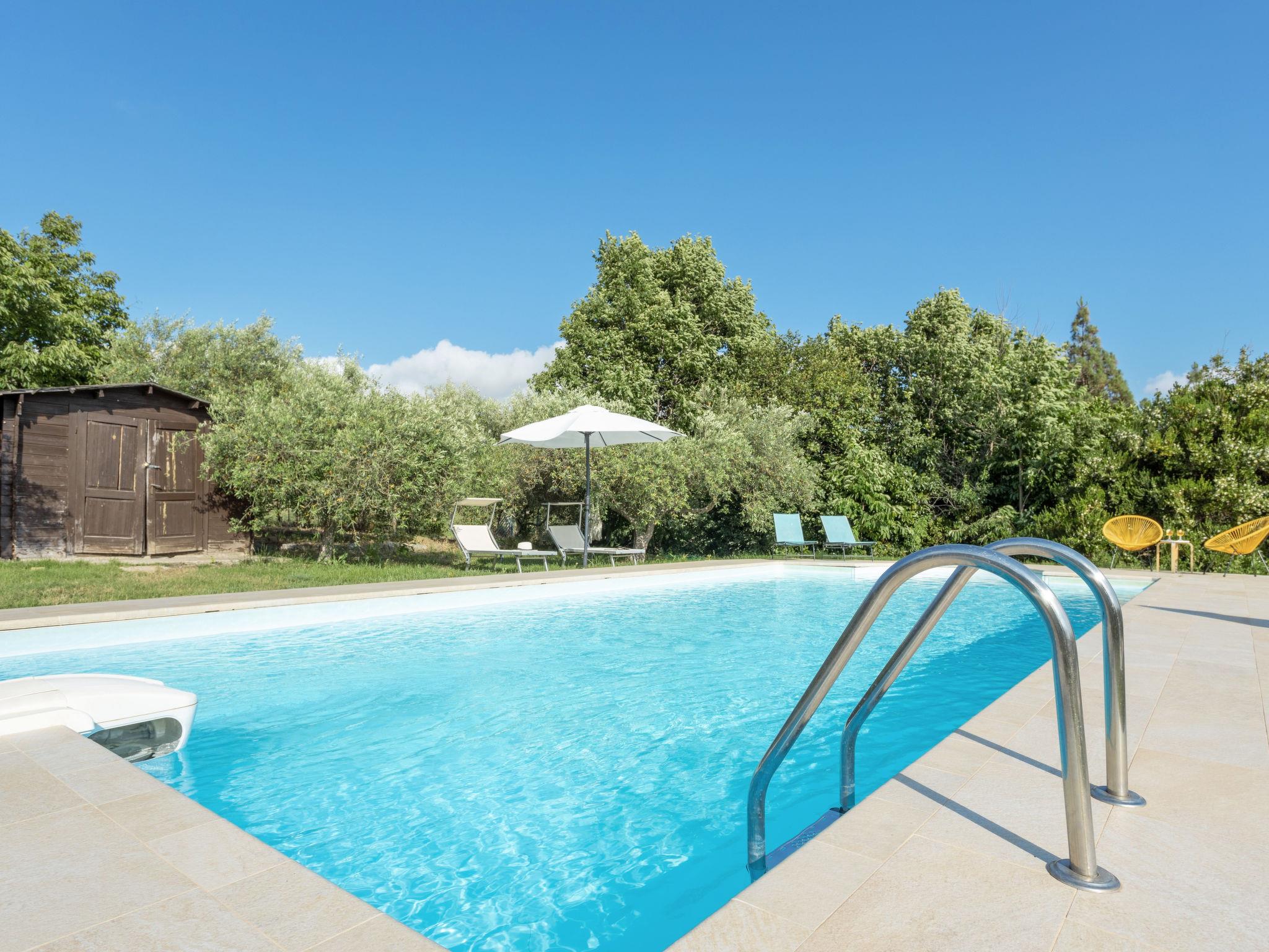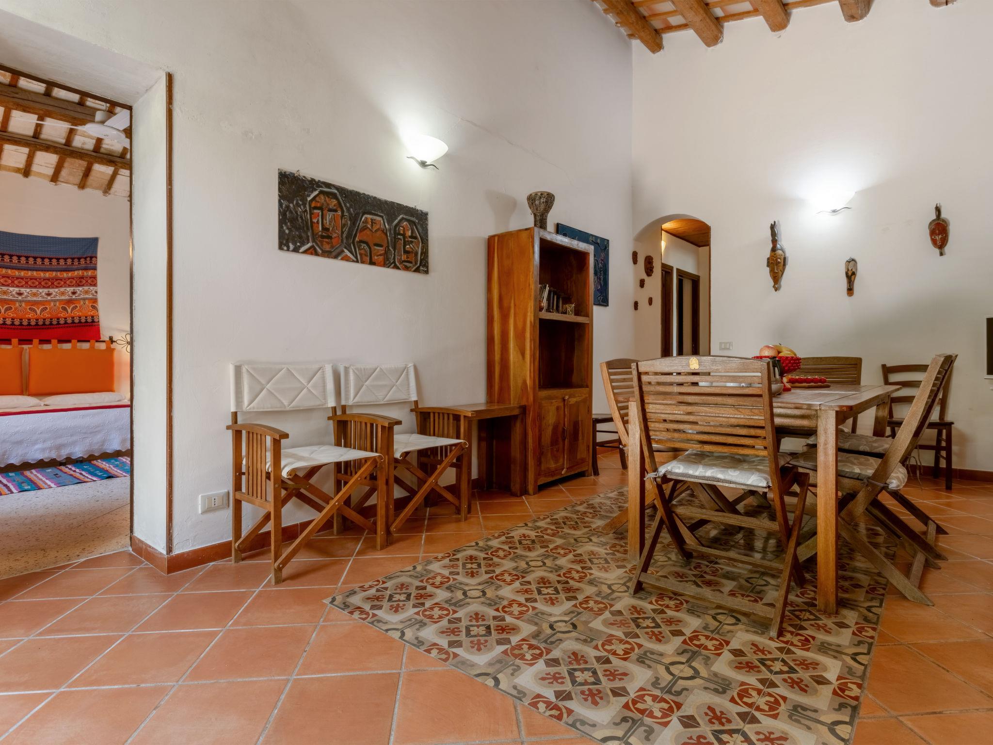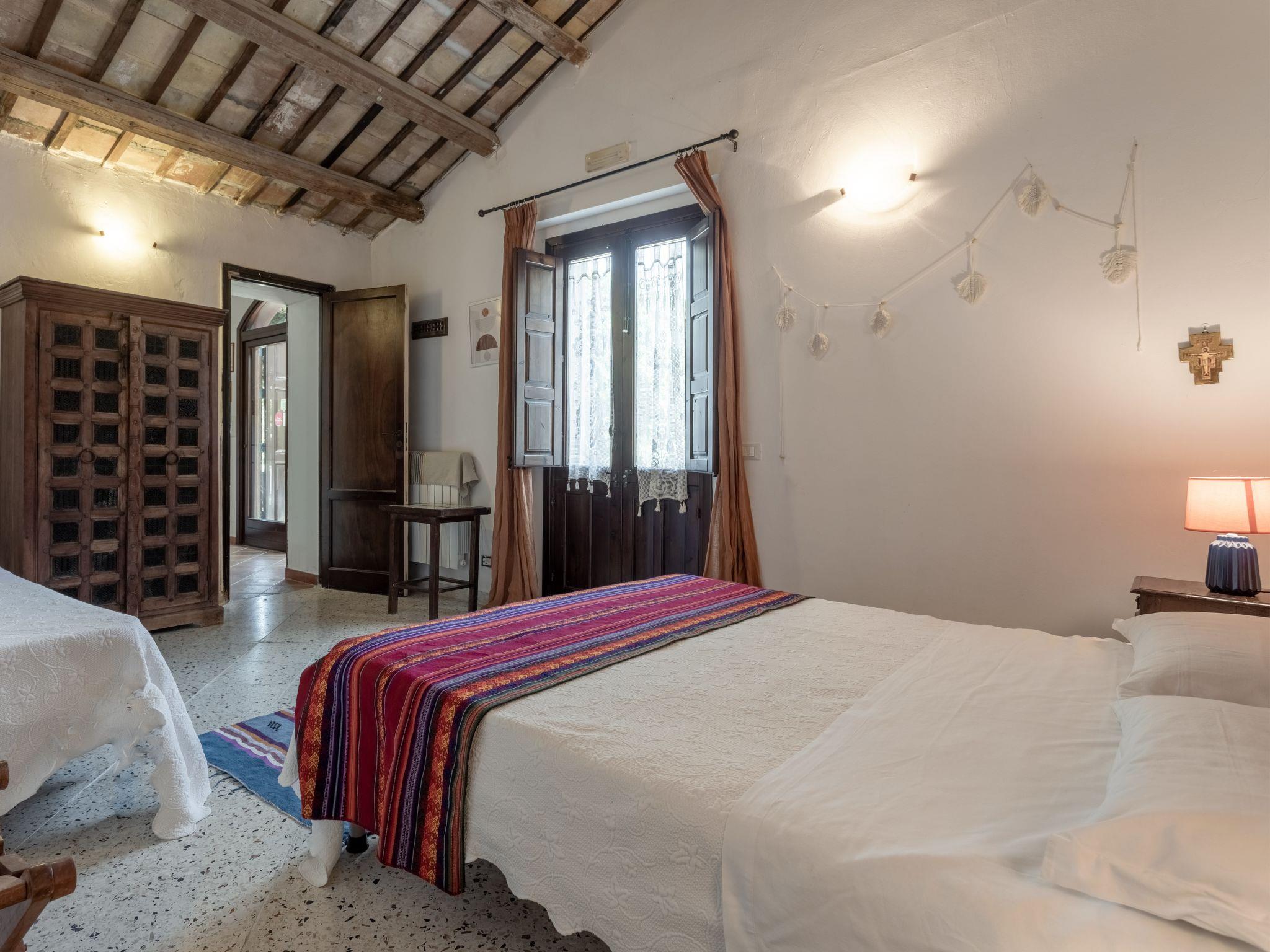 "Casale Colomba", 5-room farmhouse 180 m2, on the ground floor. Spacious, practical and comfortable furnishings: 1 double bedroom with shower/bidet/WC and TV (flat screen), fan. Exit to the terrace. 4 double bedrooms, each room with shower/bidet/WC and fan. Exit to the terrace. Kitchen-/living room in the entrance (4 hot plates, toaster, kettle, microwave, freezer, electric coffee machine) with dining table, TV (flat screen), fan. Exit pergola. Heating, gas heating, forced-air heating. Heating available only from 01.12. to 31.03. Terrace furniture, barbecue, deck chairs. View of the garden. Facilities: washing machine, iron, mosquito net, children's high chair, baby cot for up to 2 year olds (extra), hair dryer. Internet (WiFi, free). Parking (3 cars). Please note: maximum 1 pet/ dog allowed. Smoke alarm, fire extinguisher. Please note: two double bedrooms have access from the outside only. IT081002C24EMUREFT