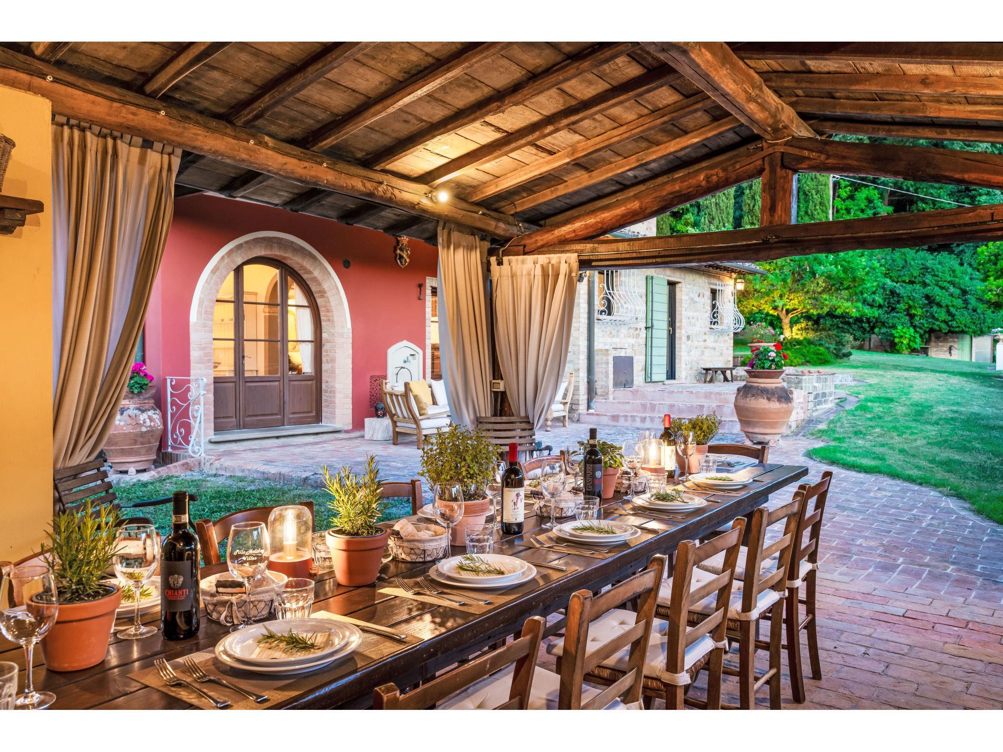 Very beautiful, comfortable villa "Fonte di Pillo", surrounded by fields and vineyards. Property composed of main house and outbuilding 4 km from the centre of Gambassi Terme, 4 km from the centre of Castelfiorentino, 20 km from the centre of San Gimignano, in a quiet position. Private: property 60'000 m2, well-kept garden (not fenced) with lawn and trees, swimming pool (12 x 6 m, depth 150 cm, seasonal availability: 01.May. - 18.Oct.). Outdoor shower, terrace, garden furniture, barbecue, pool maintenance by the owner/gardener. In the house: air conditioning, burglar alarm system. 200 m long motor access (via unmade road). Roofed, parking on the premises. E-charging station. Supermarket 4 km, bus stop 300 m, railway station "Castelfiorentino" 6 km. Golf course (18 hole) 15 km. Nearby attractions: Volterra 30 km, Firenze 40 km, Pisa 60 km, Livorno 70 km. Please note: baby equipment (included). Groups of teenagers on request only.